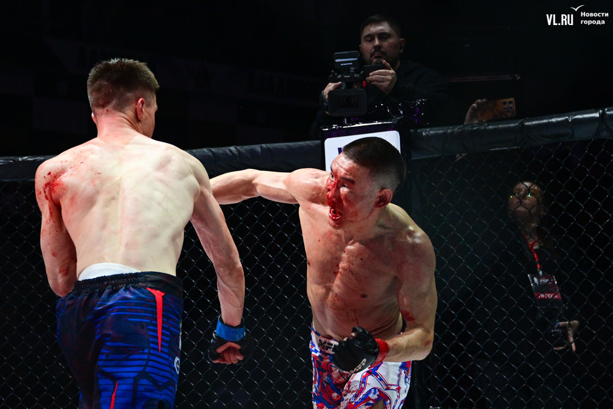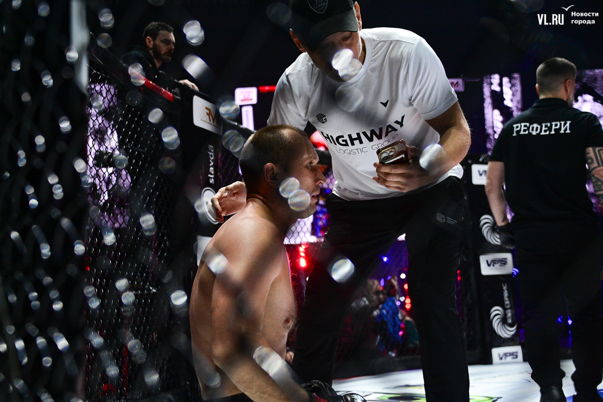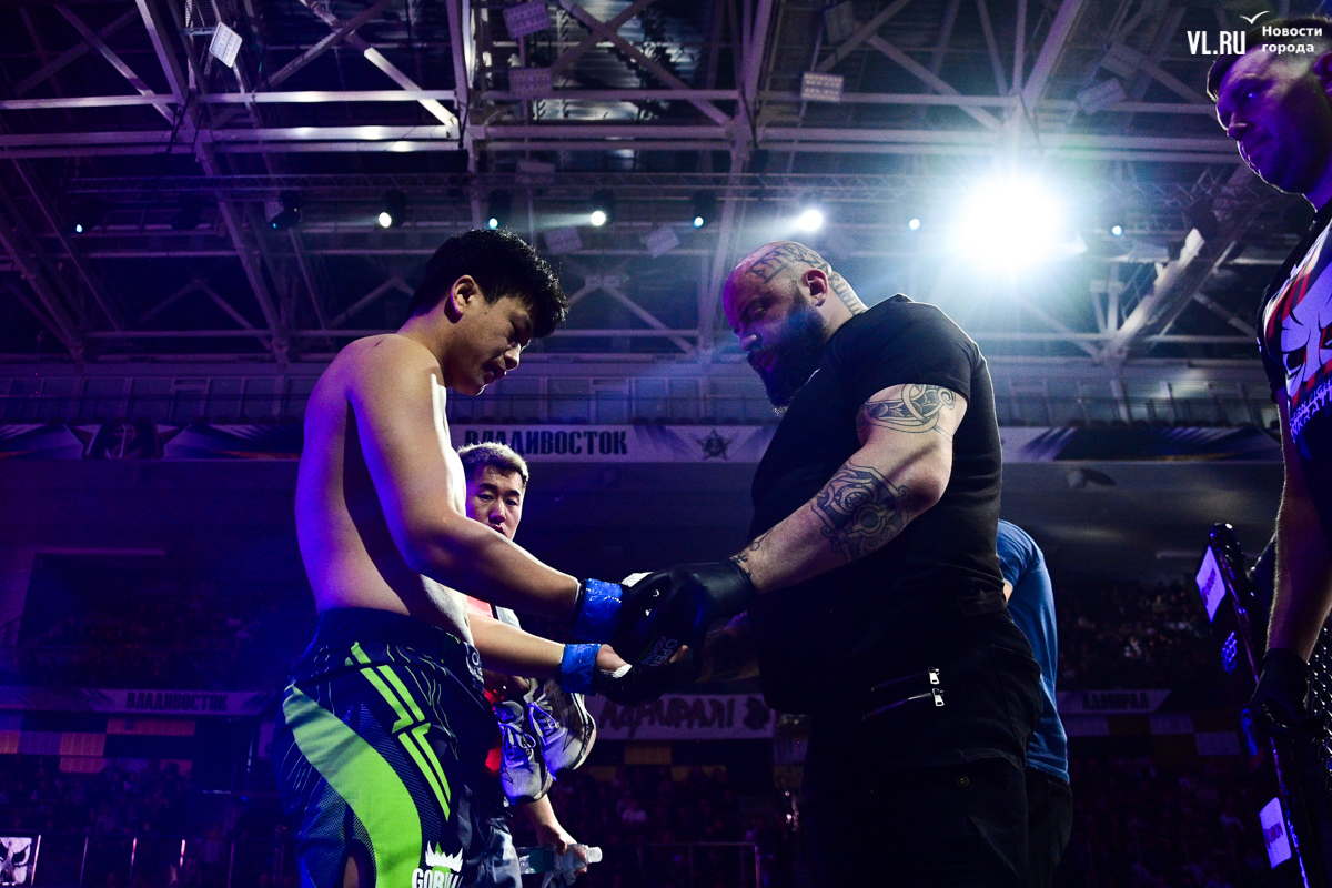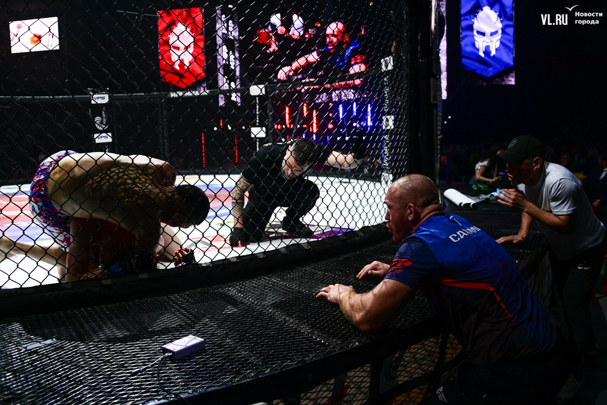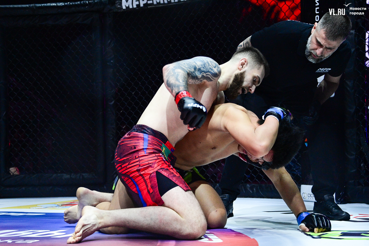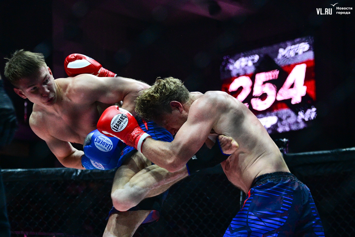 А вот самый зрелищный и интересный бой, по мнению корреспондента Новостей VL.ru, был в легчайшем весе. На ринге встретились боец из Владивостока Артём Бутко и Григорий Попов из Якутии. Сразу после старта Артём начал активное нападение, но выдерживал дистанцию. Первый раунд Бутко активно выпускал серии ударов ногой и рукой, из-за чего разбил нос Попову. Во втором раунде Григорий начал переходить в атаку из защиты. Артём, в свою очередь, прямым ударом по лицу и боковым в голову вызвал сильное кровотечение у соперника и, казалось, вот-вот отправит его в технический нокаут. Но рефери остановил бой, чтобы тренерский штаб Попова остановил кровь у бойца, что вызвало возмущение тренера Бутко. После небольшой словесной перепалки тренера и рефери схватку продолжили. В конце второго раунда Артёма взяли на удушающий, который он спокойно терпел 15 секунд, пока не закончится раунд. В заключительном этапе бой на кулаках доминировал над борьбой. В итоге по решению судей победу одержал Артём Бутко.