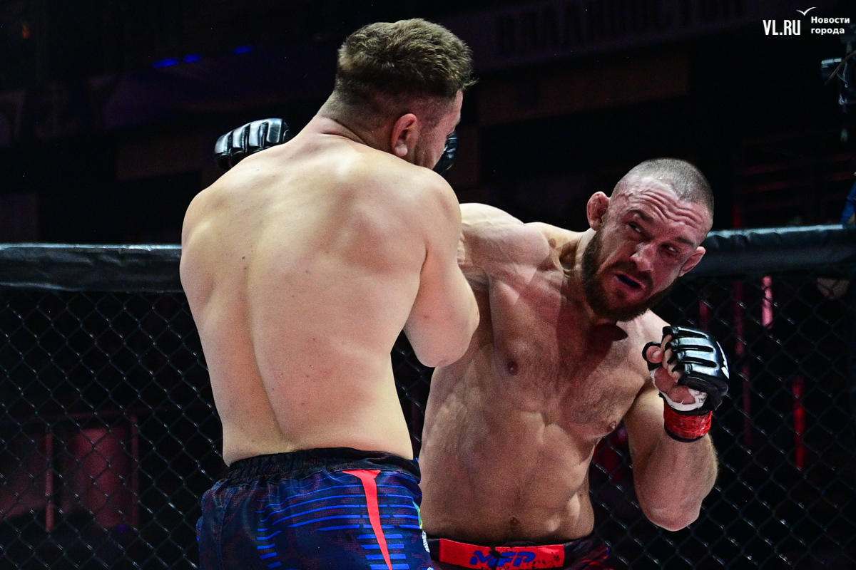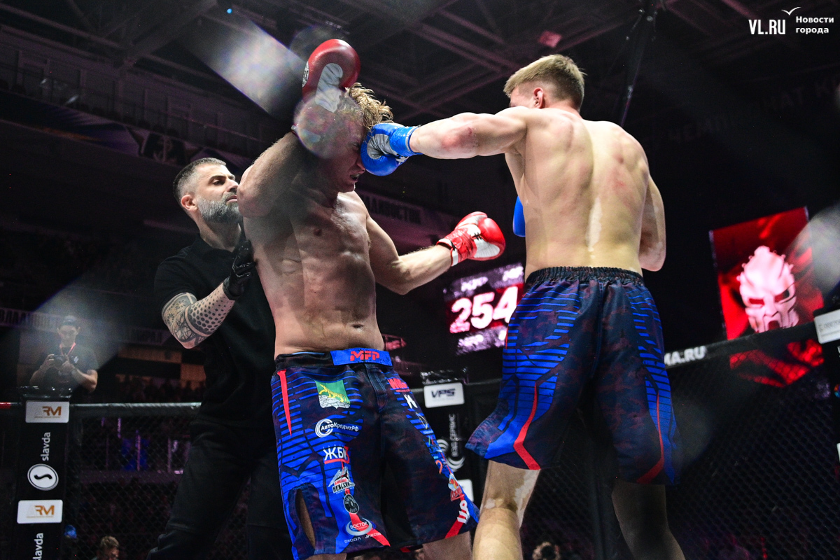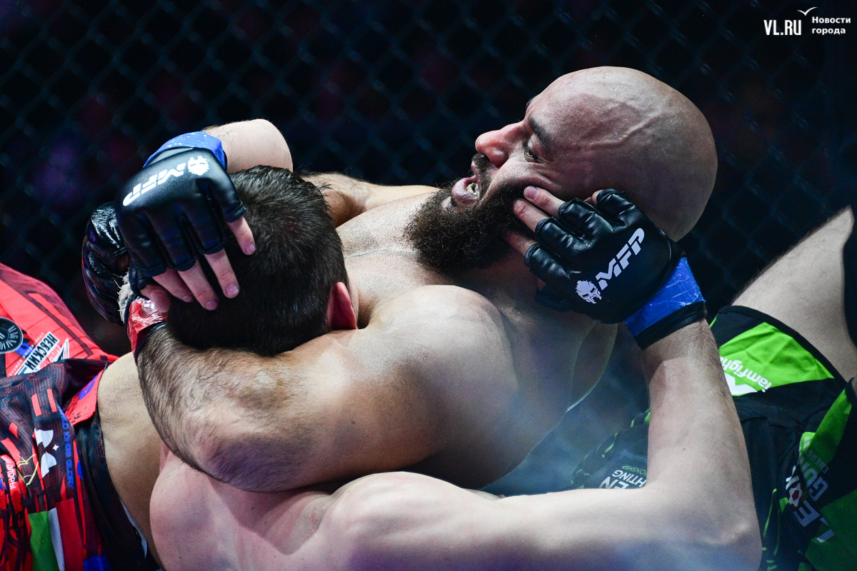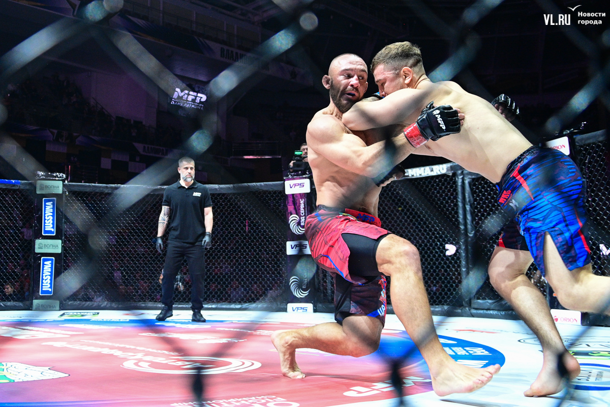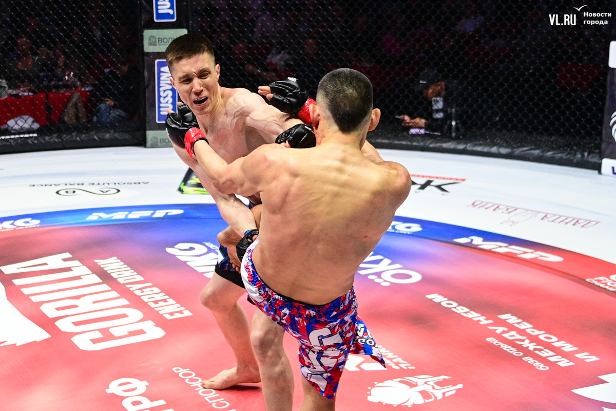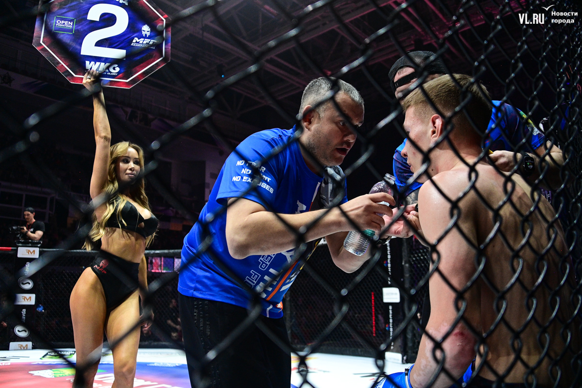 А вот самый зрелищный и интересный бой, по мнению корреспондента Новостей VL.ru, был в легчайшем весе. На ринге встретились боец из Владивостока Артём Бутко и Григорий Попов из Якутии. Сразу после старта Артём начал активное нападение, но выдерживал дистанцию. Первый раунд Бутко активно выпускал серии ударов ногой и рукой, из-за чего разбил нос Попову. Во втором раунде Григорий начал переходить в атаку из защиты. Артём, в свою очередь, прямым ударом по лицу и боковым в голову вызвал сильное кровотечение у соперника и, казалось, вот-вот отправит его в технический нокаут. Но рефери остановил бой, чтобы тренерский штаб Попова остановил кровь у бойца, что вызвало возмущение тренера Бутко. После небольшой словесной перепалки тренера и рефери схватку продолжили. В конце второго раунда Артёма взяли на удушающий, который он спокойно терпел 15 секунд, пока не закончится раунд. В заключительном этапе бой на кулаках доминировал над борьбой. В итоге по решению судей победу одержал Артём Бутко.