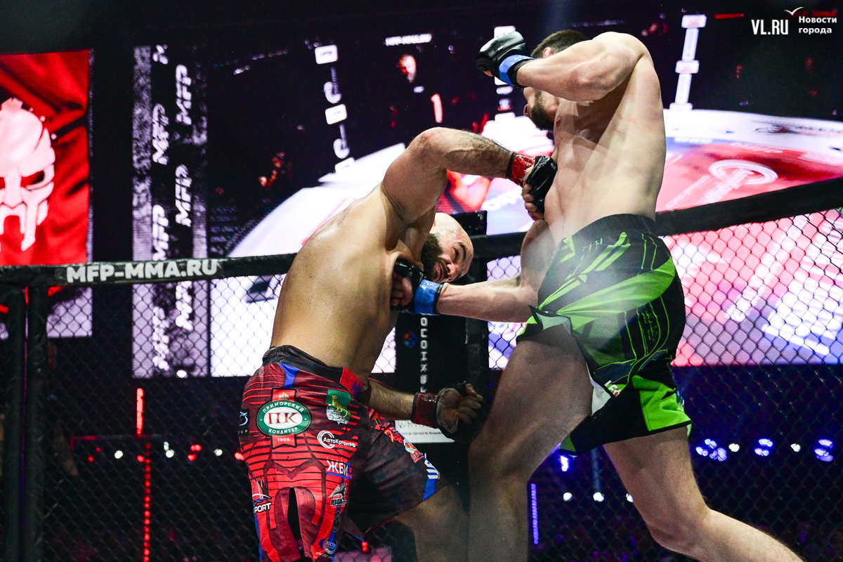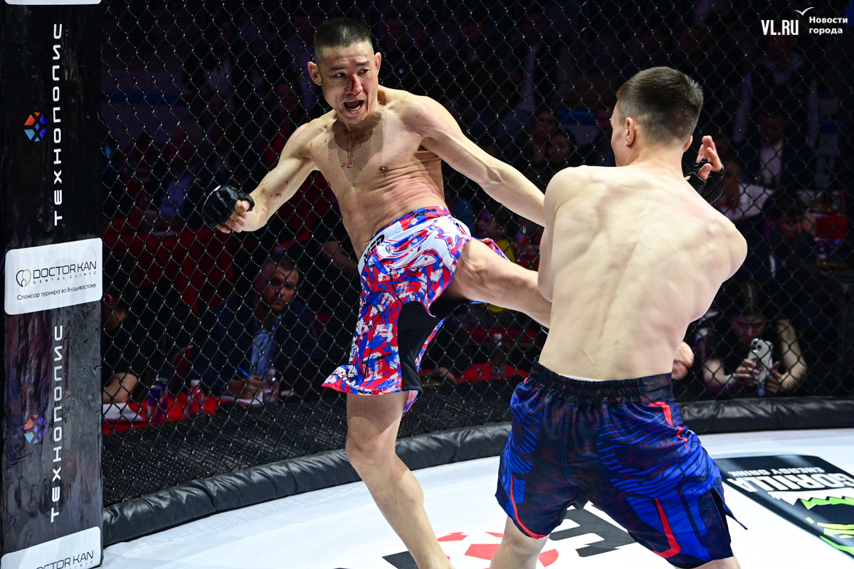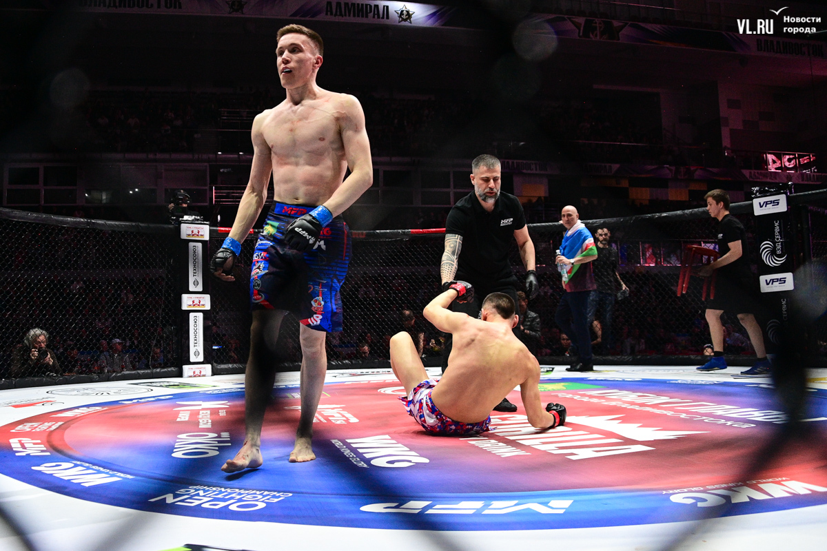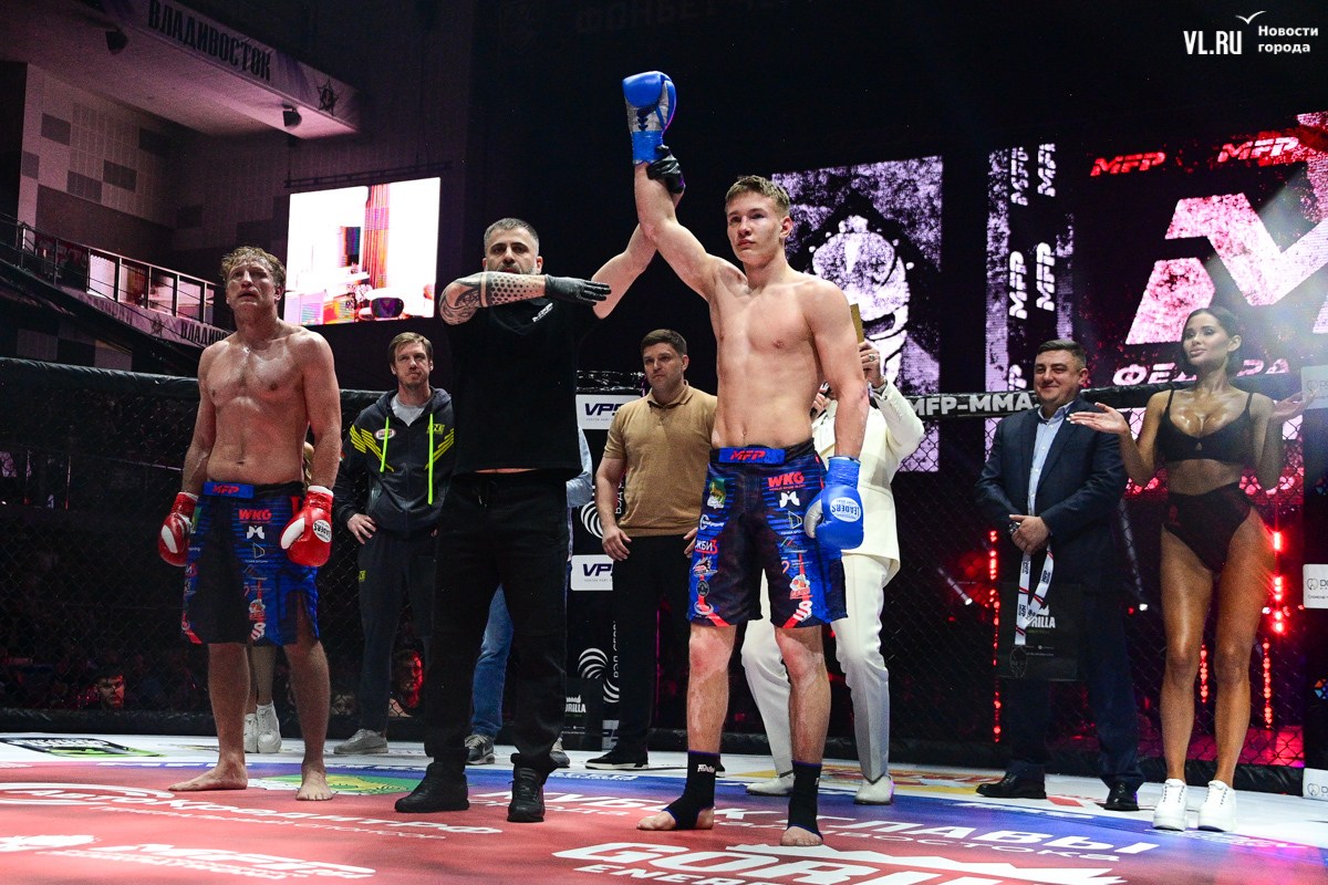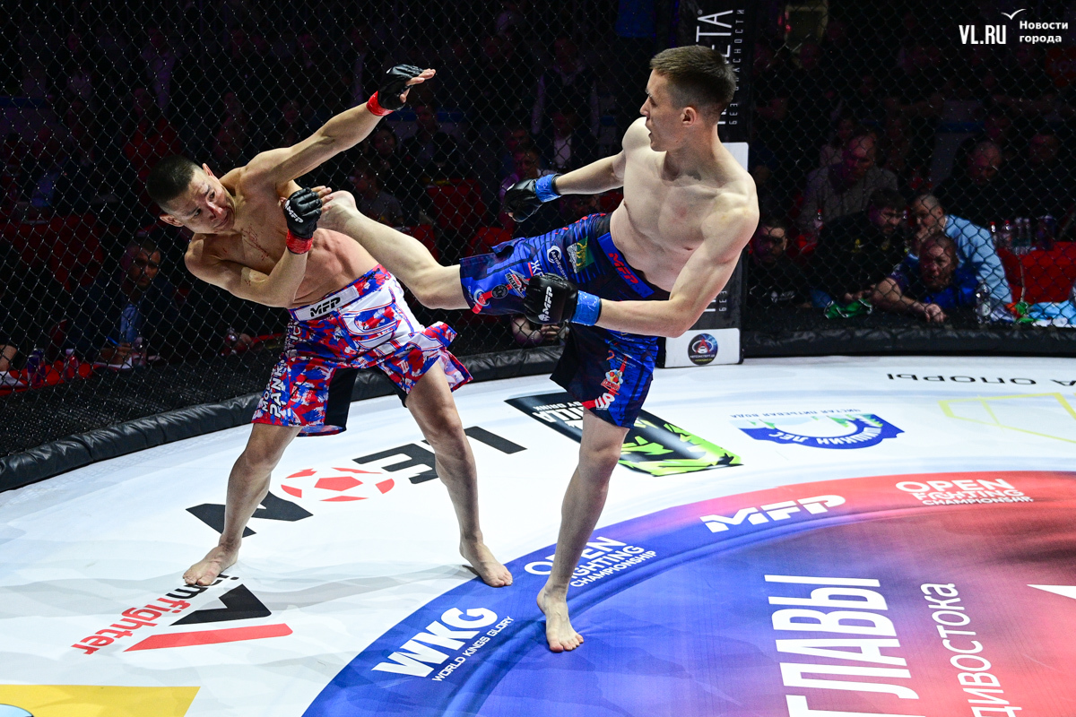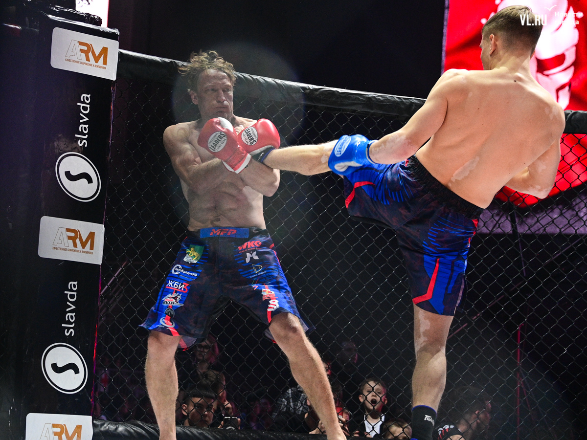 А вот самый зрелищный и интересный бой, по мнению корреспондента Новостей VL.ru, был в легчайшем весе. На ринге встретились боец из Владивостока Артём Бутко и Григорий Попов из Якутии. Сразу после старта Артём начал активное нападение, но выдерживал дистанцию. Первый раунд Бутко активно выпускал серии ударов ногой и рукой, из-за чего разбил нос Попову. Во втором раунде Григорий начал переходить в атаку из защиты. Артём, в свою очередь, прямым ударом по лицу и боковым в голову вызвал сильное кровотечение у соперника и, казалось, вот-вот отправит его в технический нокаут. Но рефери остановил бой, чтобы тренерский штаб Попова остановил кровь у бойца, что вызвало возмущение тренера Бутко. После небольшой словесной перепалки тренера и рефери схватку продолжили. В конце второго раунда Артёма взяли на удушающий, который он спокойно терпел 15 секунд, пока не закончится раунд. В заключительном этапе бой на кулаках доминировал над борьбой. В итоге по решению судей победу одержал Артём Бутко.