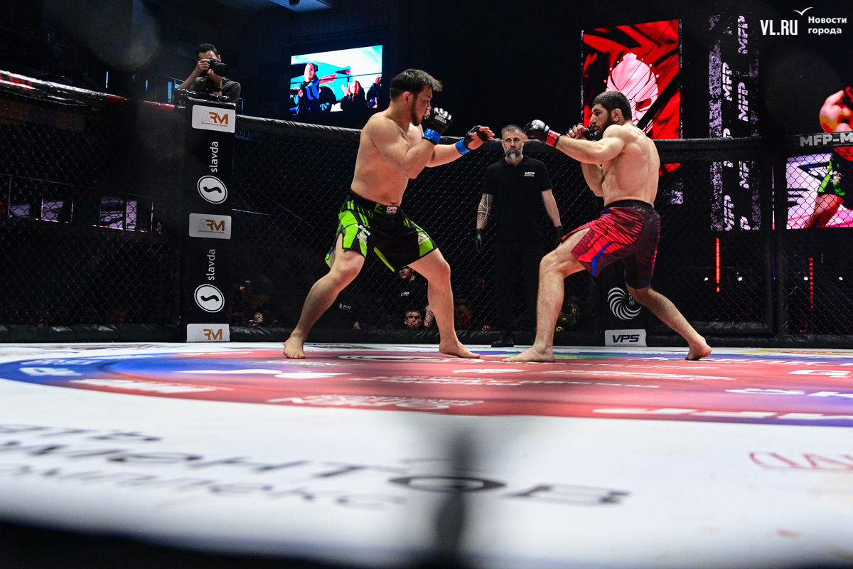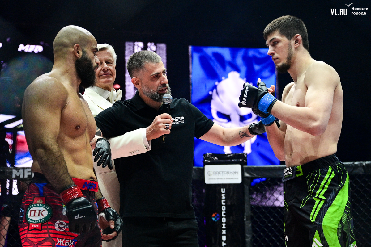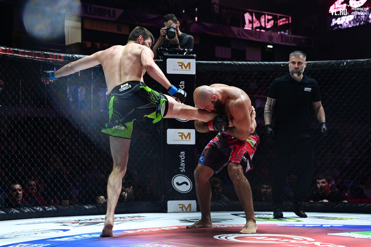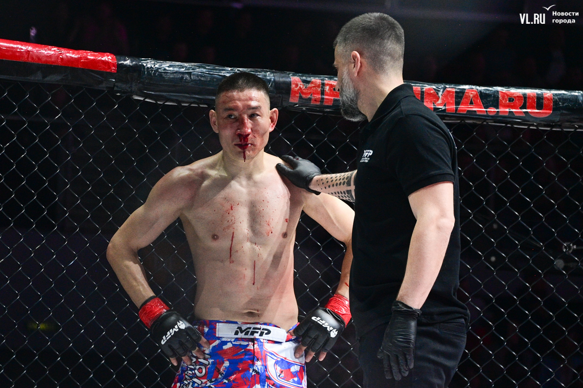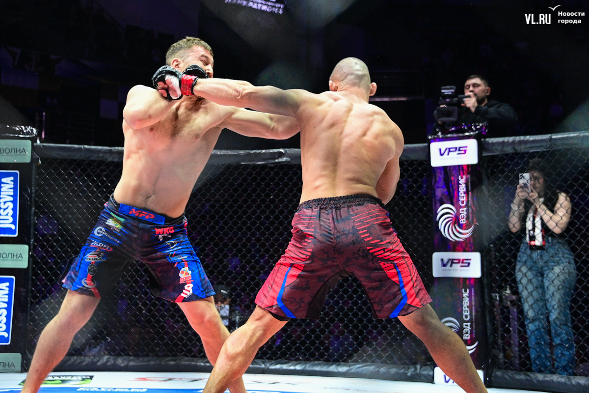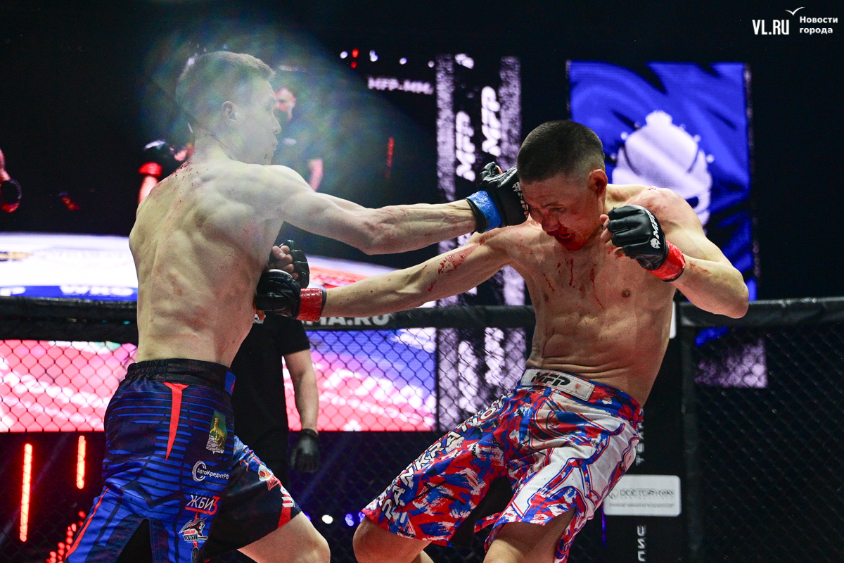 А вот самый зрелищный и интересный бой, по мнению корреспондента Новостей VL.ru, был в легчайшем весе. На ринге встретились боец из Владивостока Артём Бутко и Григорий Попов из Якутии. Сразу после старта Артём начал активное нападение, но выдерживал дистанцию. Первый раунд Бутко активно выпускал серии ударов ногой и рукой, из-за чего разбил нос Попову. Во втором раунде Григорий начал переходить в атаку из защиты. Артём, в свою очередь, прямым ударом по лицу и боковым в голову вызвал сильное кровотечение у соперника и, казалось, вот-вот отправит его в технический нокаут. Но рефери остановил бой, чтобы тренерский штаб Попова остановил кровь у бойца, что вызвало возмущение тренера Бутко. После небольшой словесной перепалки тренера и рефери схватку продолжили. В конце второго раунда Артёма взяли на удушающий, который он спокойно терпел 15 секунд, пока не закончится раунд. В заключительном этапе бой на кулаках доминировал над борьбой. В итоге по решению судей победу одержал Артём Бутко.