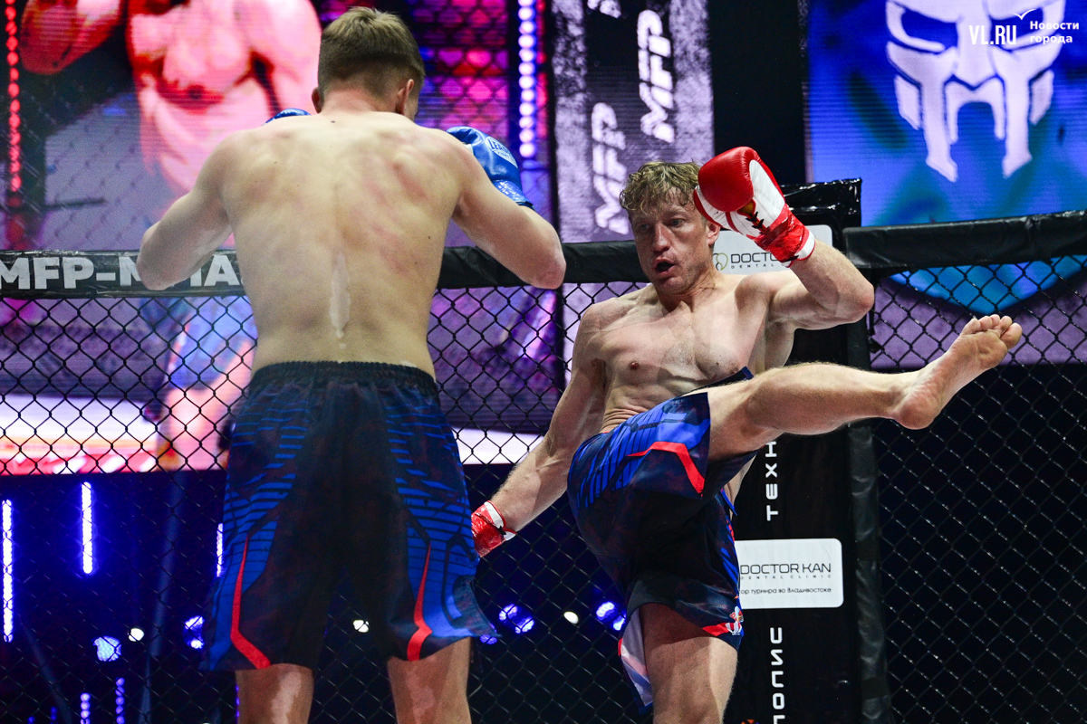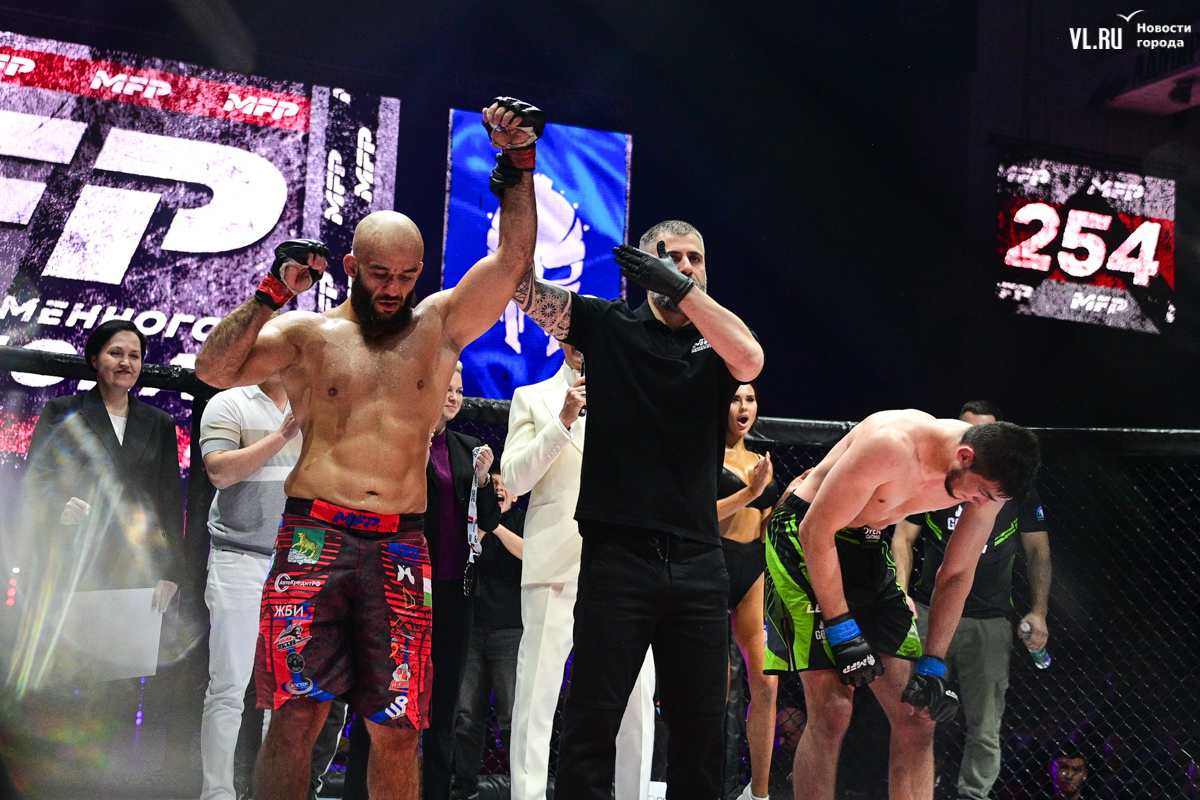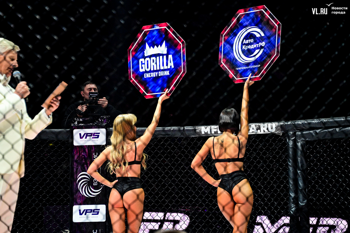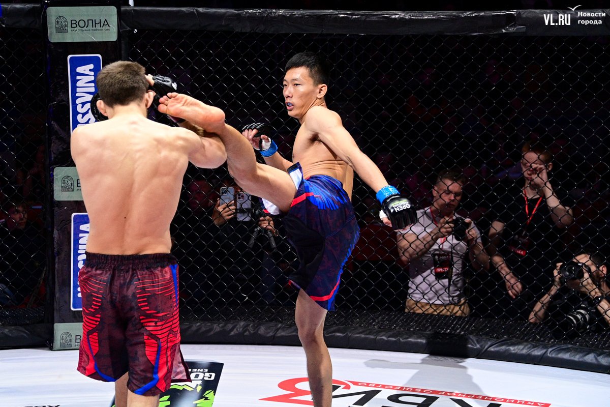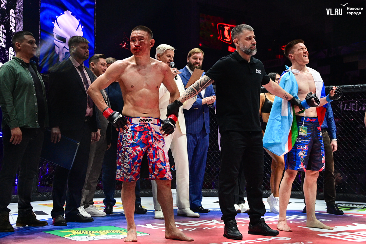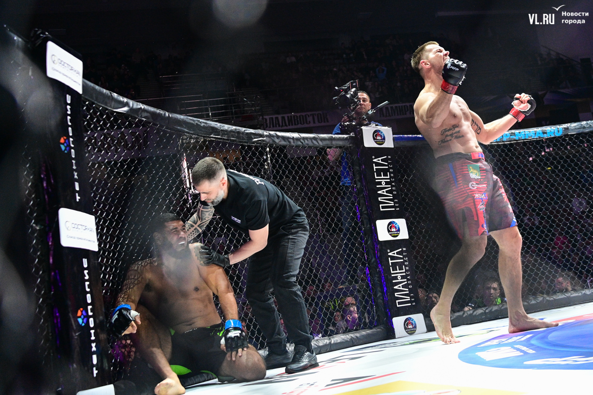 А вот самый зрелищный и интересный бой, по мнению корреспондента Новостей VL.ru, был в легчайшем весе. На ринге встретились боец из Владивостока Артём Бутко и Григорий Попов из Якутии. Сразу после старта Артём начал активное нападение, но выдерживал дистанцию. Первый раунд Бутко активно выпускал серии ударов ногой и рукой, из-за чего разбил нос Попову. Во втором раунде Григорий начал переходить в атаку из защиты. Артём, в свою очередь, прямым ударом по лицу и боковым в голову вызвал сильное кровотечение у соперника и, казалось, вот-вот отправит его в технический нокаут. Но рефери остановил бой, чтобы тренерский штаб Попова остановил кровь у бойца, что вызвало возмущение тренера Бутко. После небольшой словесной перепалки тренера и рефери схватку продолжили. В конце второго раунда Артёма взяли на удушающий, который он спокойно терпел 15 секунд, пока не закончится раунд. В заключительном этапе бой на кулаках доминировал над борьбой. В итоге по решению судей победу одержал Артём Бутко.
