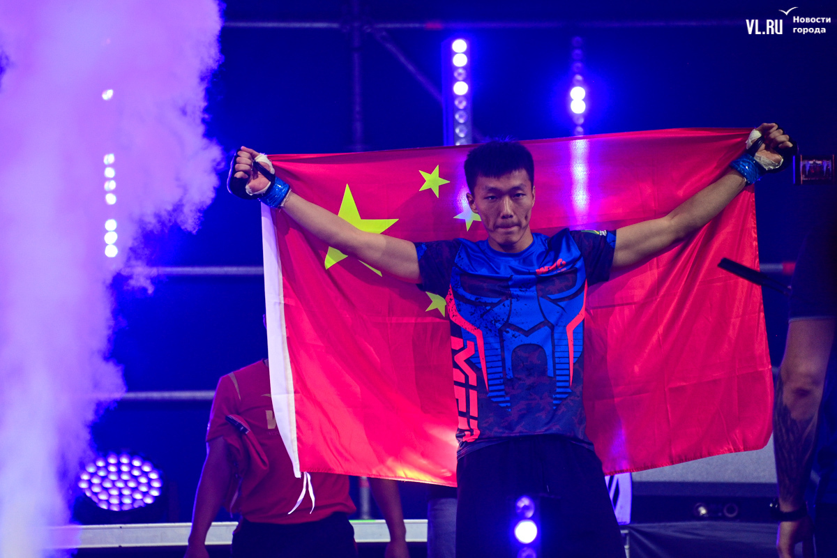 После них на ринге встретились житель Владивостока Ильдар Абакаров и Жу Яхувей из Китая. Иностранец вышел на ринг под песню «Кукушка» с капой во рту в цветах российского триколора. Соперники обменялись несколькими лоу-киками, после чего перешли в защиту. Второе нападение уже было со стороны китайца, но неудачное: Ильдар смог увернуться, что дало ему преимущество. Сразу после этого он сделал два удара руками в голову. Затем рукопашный бой сменила борьба, в которой Жу Яхувей пытался взять приморского бойца на удушающий, но сделать этого не получилось. При помощи поворота корпуса влево и перехвата руки Ильдар смог выбраться из удушающего. До того как рефери разнял бойцов и вновь махнул рукой, китаец попробовал выполнить лоу-кик, но промахнулся, поэтому прижал соперника к сетке, где отработал несколько ударов по лицу. Второй раунд больше напоминал борьбу, так как после нескольких ударов в начале, спортсмены перешли на удушающие и болевые.