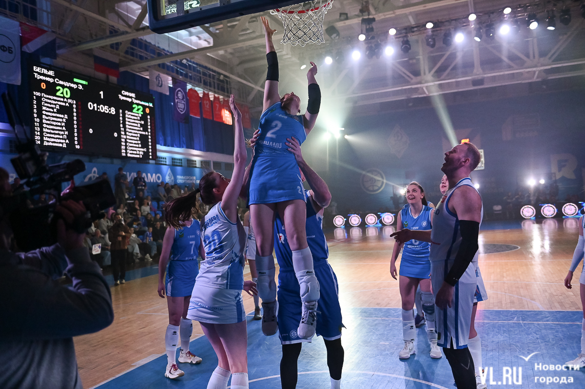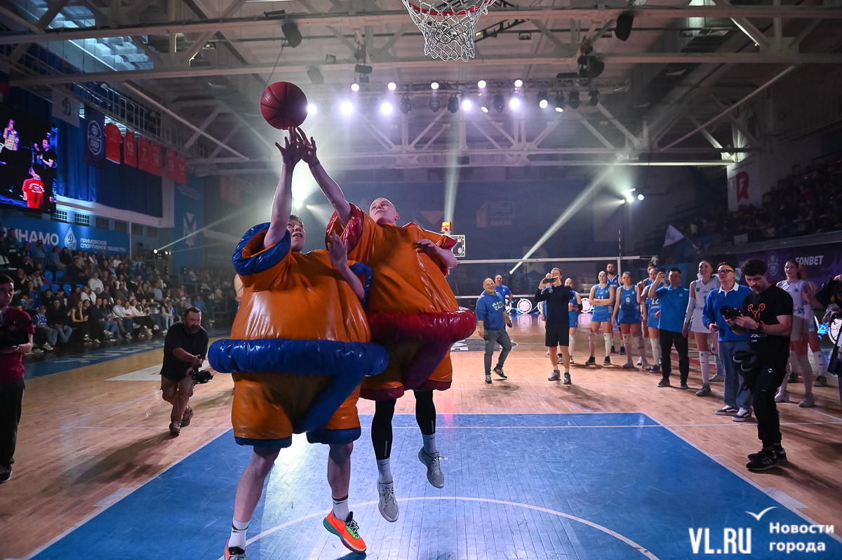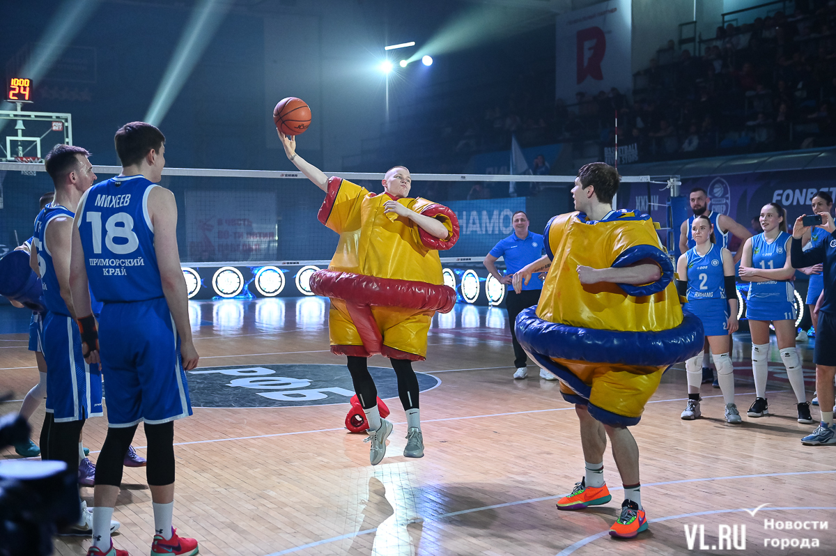 Следующий эпизод – снова баскетбол: на паркете «Олимпийца» мужские команды «синих» и «белых» разбавили волейболистки. Отметим, что между каждой четвертью всех присутствующих ожидали разные мини-ивенты – розыгрыши абонементов на следующий сезон и атрибутики, а также караоке-батл, где команды вместе с залом спели «Владивосток-2000» и «Седая ночь».