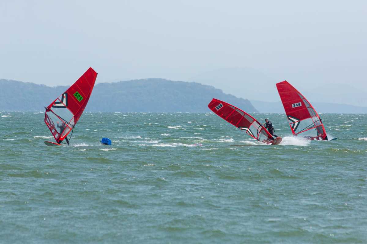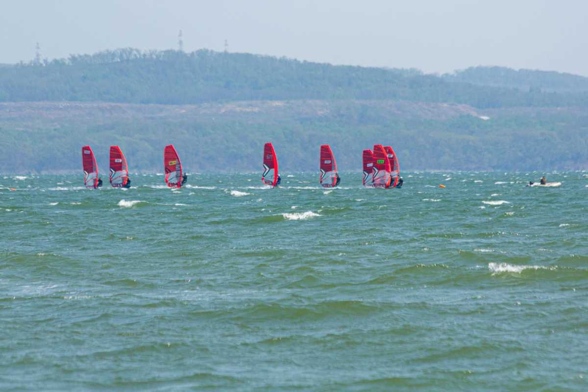 Соревнования зрелищные – стройный ряд небольших красных парусов бороздит просторы рябящей поверхности воды. Передвигаются виндсёрфы очень быстро, как мотоциклы в спидвее – сразу и не поймёшь, кто выберется вперёд.