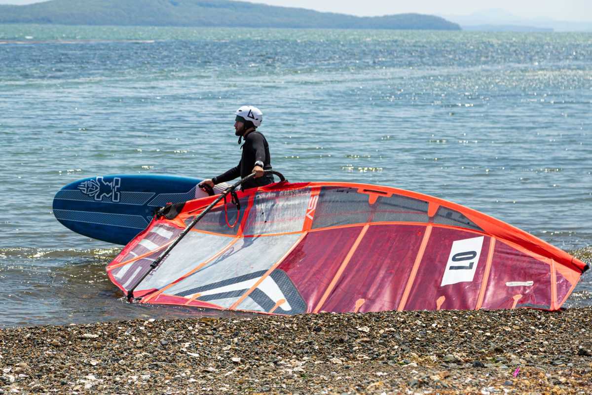 «Слалом – это гонки на скорость. Участники должны последовательно пройти 4 буя, которые стоят змейкой вниз по ветру. Стартуют участники одновременно все – в створ, который расположен между стартовым буем и судейской лодкой. Каждый участник ещё контролирует время старта по таймеру, который синхронизируется одновременно у всех участников. И после старта створа они идут на первый знак, делают поворот – и так 4 знака. После 4-го знака точно так же нужно финишировать, пройдя финишный створ. Проводится несколько гонок, результаты суммируются, и тот участник, который набрал наименьшее количество очков, побеждает», – объяснил один из организаторов соревнований, председатель приморского регионального отделения Федерации сноуборда России Сергей Терентьев.
