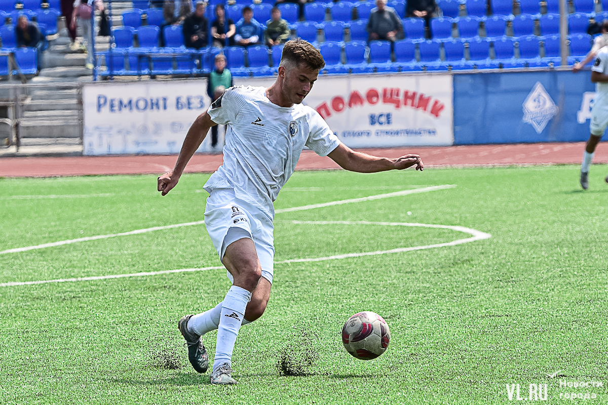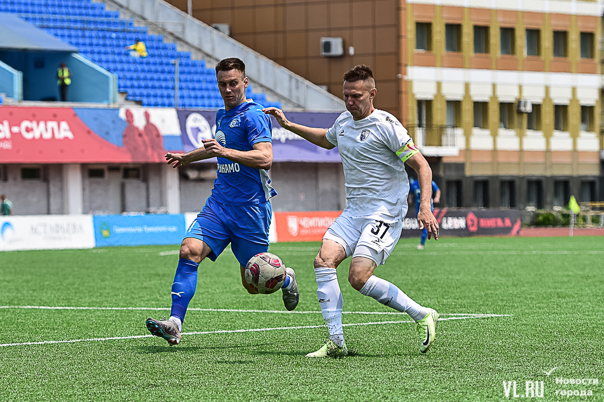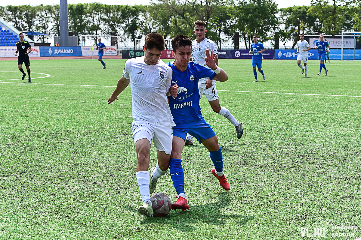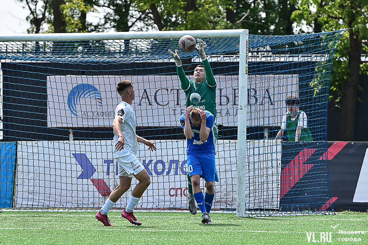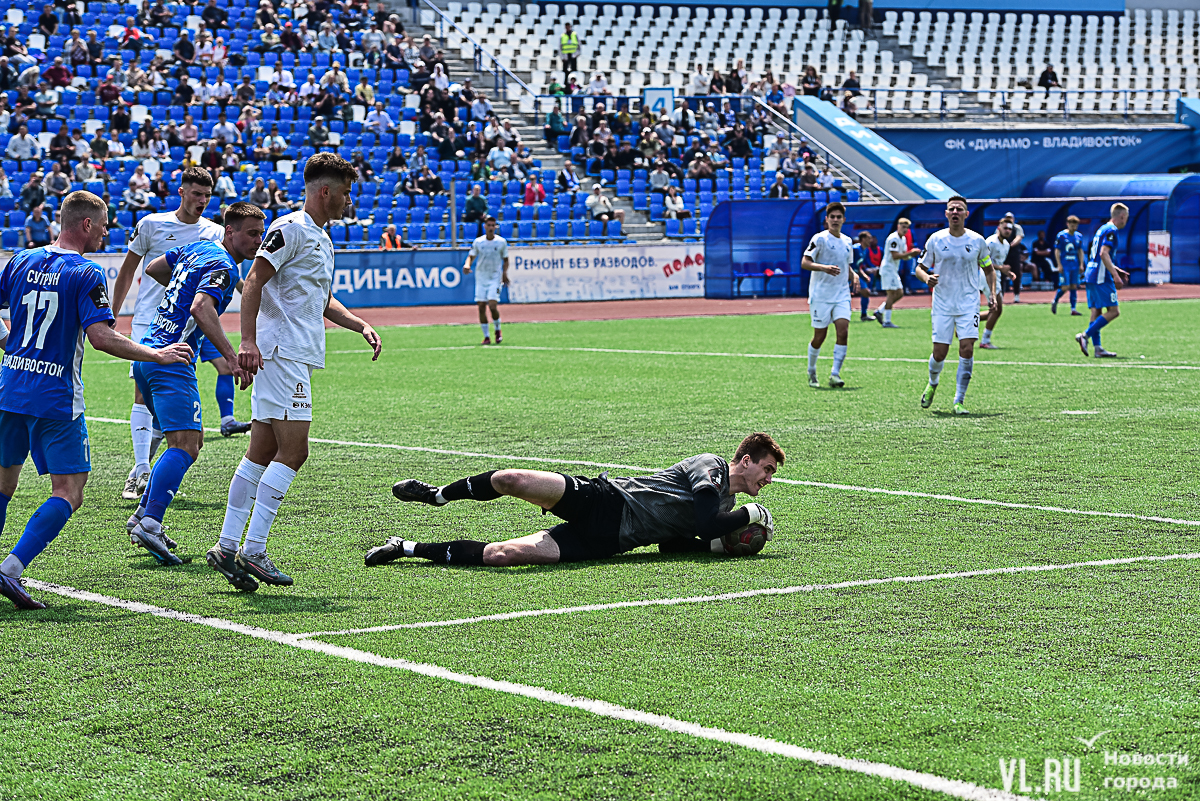 Владивостокское «Динамо» на старте матча больше владело мячом и было инициативнее – сразу заработало быстрый угловой, который, увы, дивидендов не принёс. Соперники играли вторым номером, но довольно уверенно защищались, раз за разом предотвращая опасность в штрафной после фланговых забросов «бело-голубых». Атаковали гости не чаще «динамовцев», но эффективнее, а на 32-й минуте добавили эмоций игре, забив первый гол. С правого фланга Ушаков отправил мяч во вратарскую, Шитов ошибся на выходе, а «снаряд» приземлился точно на голову лучшему бомбардиру «Серебра» Даниилу Агурееву, который не промахнулся в пустые ворота, – 0:1.