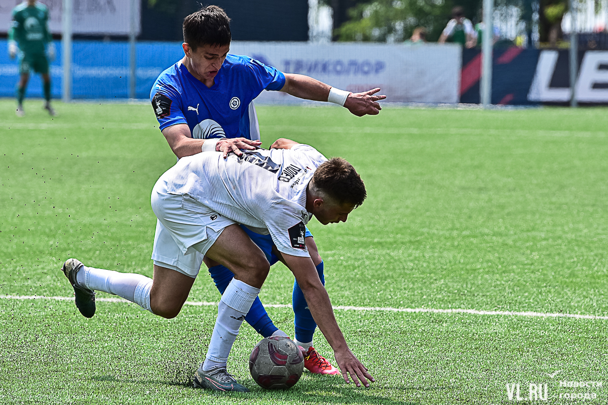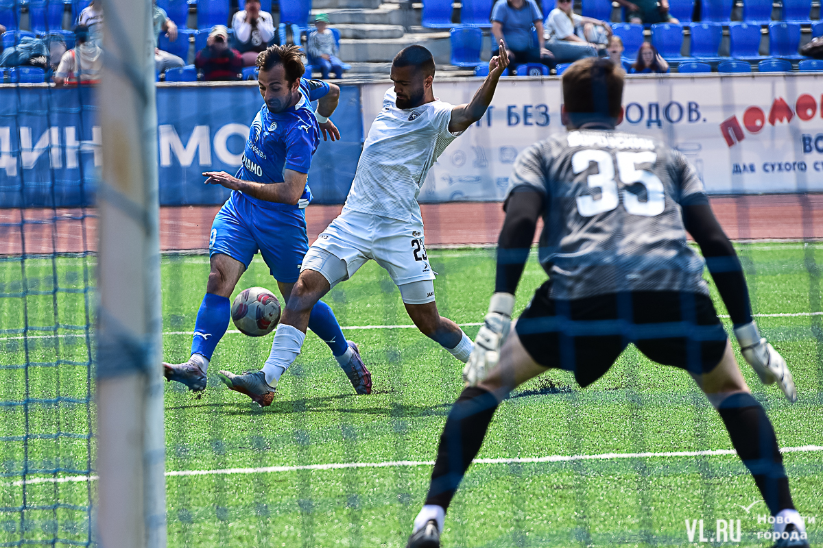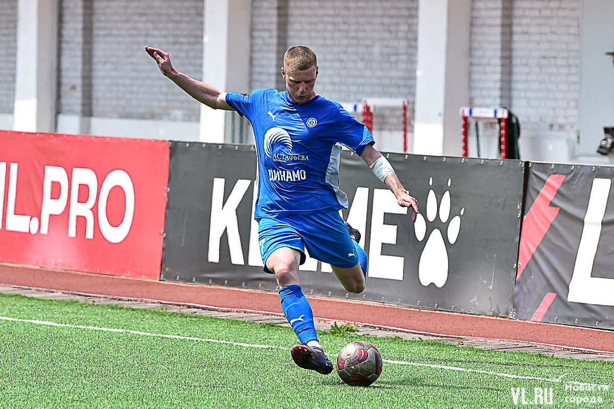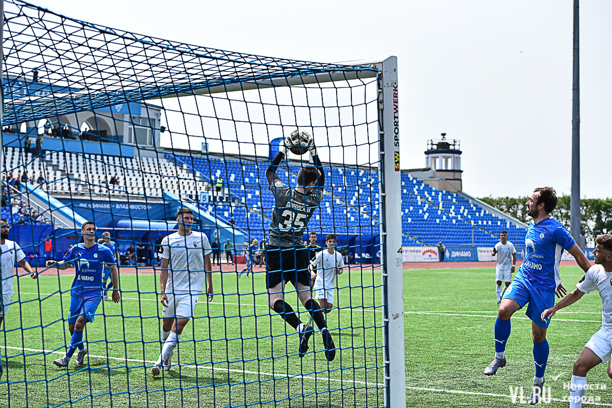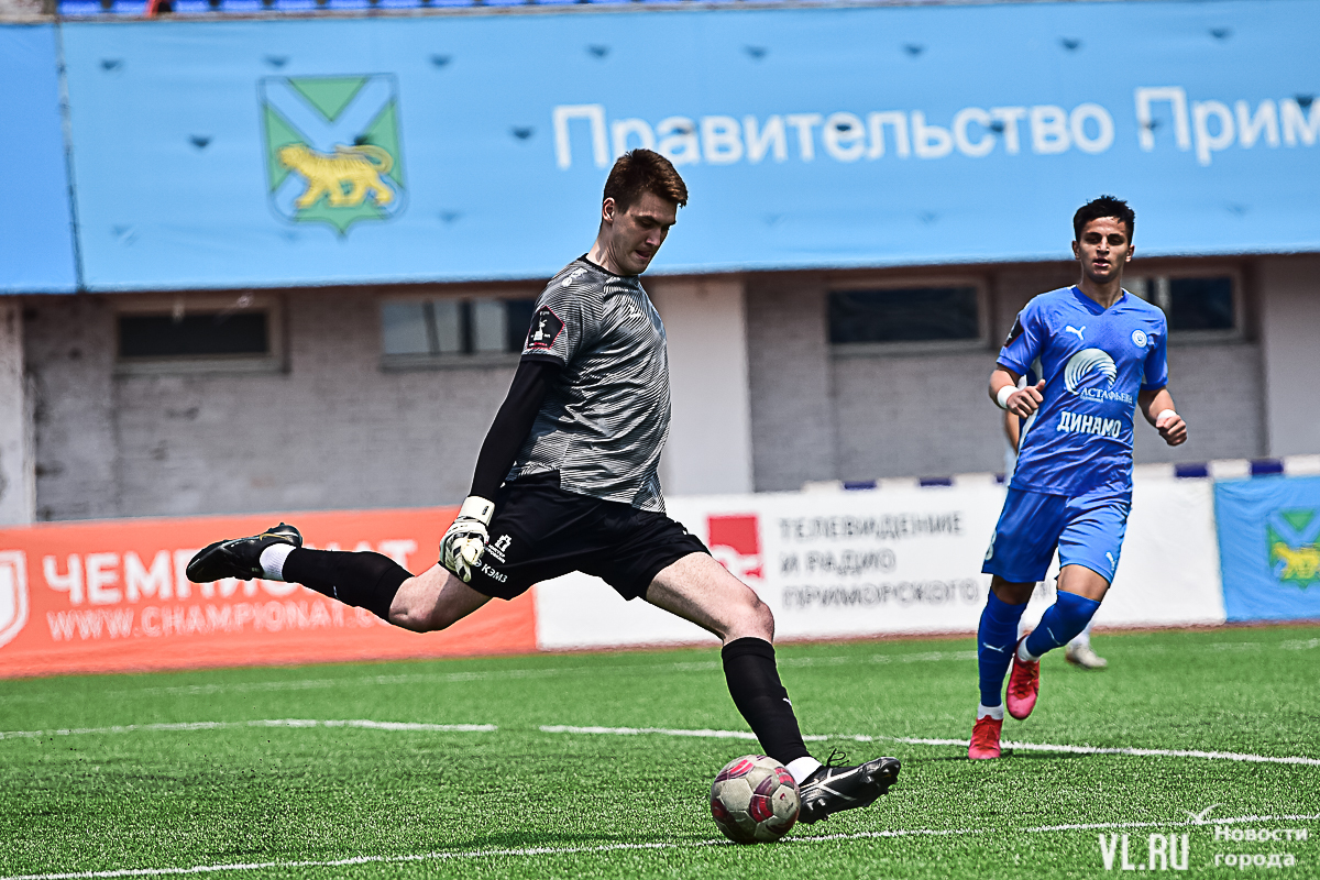 Владивостокское «Динамо» на старте матча больше владело мячом и было инициативнее – сразу заработало быстрый угловой, который, увы, дивидендов не принёс. Соперники играли вторым номером, но довольно уверенно защищались, раз за разом предотвращая опасность в штрафной после фланговых забросов «бело-голубых». Атаковали гости не чаще «динамовцев», но эффективнее, а на 32-й минуте добавили эмоций игре, забив первый гол. С правого фланга Ушаков отправил мяч во вратарскую, Шитов ошибся на выходе, а «снаряд» приземлился точно на голову лучшему бомбардиру «Серебра» Даниилу Агурееву, который не промахнулся в пустые ворота, – 0:1.