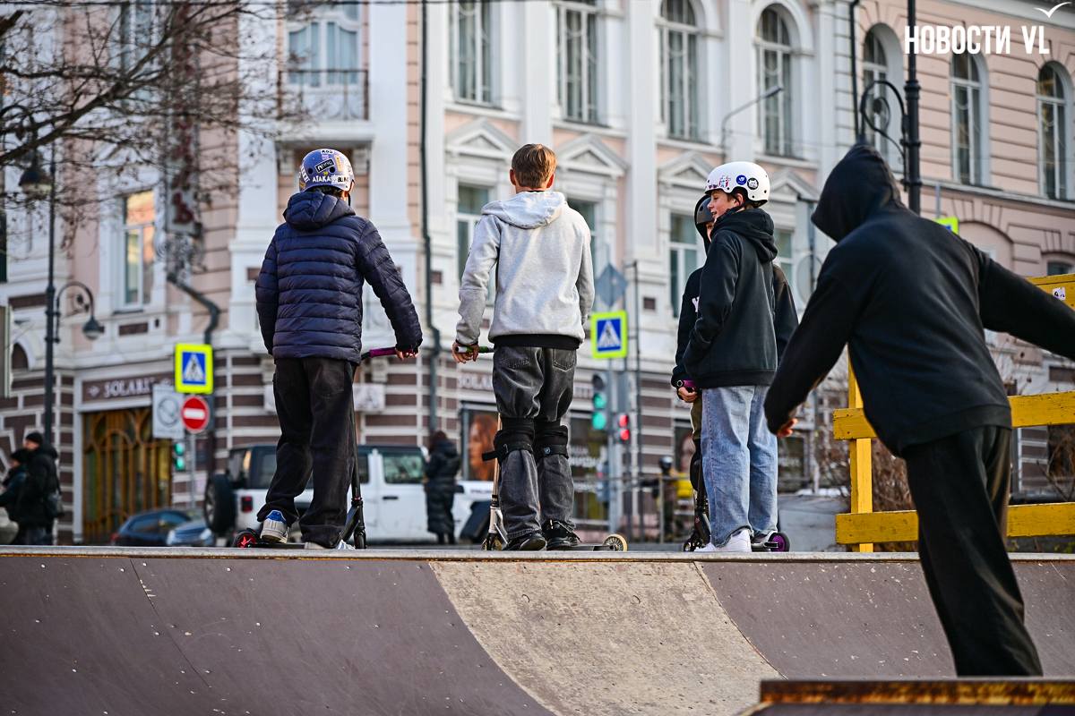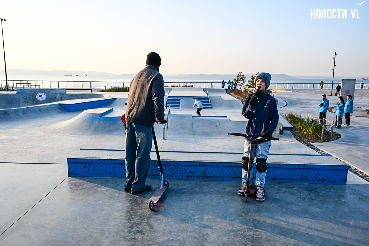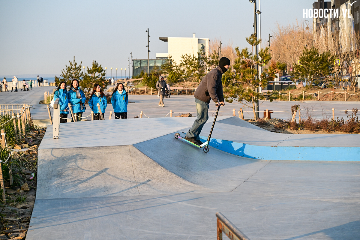 Новый экстрим-парк действительно встретил корреспондента Новостей VL.ru тишиной – мы ходили туда и в будни, и на ноябрьских праздниках. Яркие бетонные фигуры были пусты, лишь чёрные следы от колёс указывали на то, что площадкой пользовались. А вот на набережной в центре Владивостока оживлённо даже сегодня. Школьники пятых-седьмых классов катаются на самокатах и скейтах. Оборудование здесь уже заметно потёртое – видно, что им часто пользуются. Мальчишки говорят, им нравится кататься в центре: на рампах возле кинотеатра «Океан» и на площадке Спортивной набережной. Рядом можно найти общественные туалеты и есть где перекусить.
