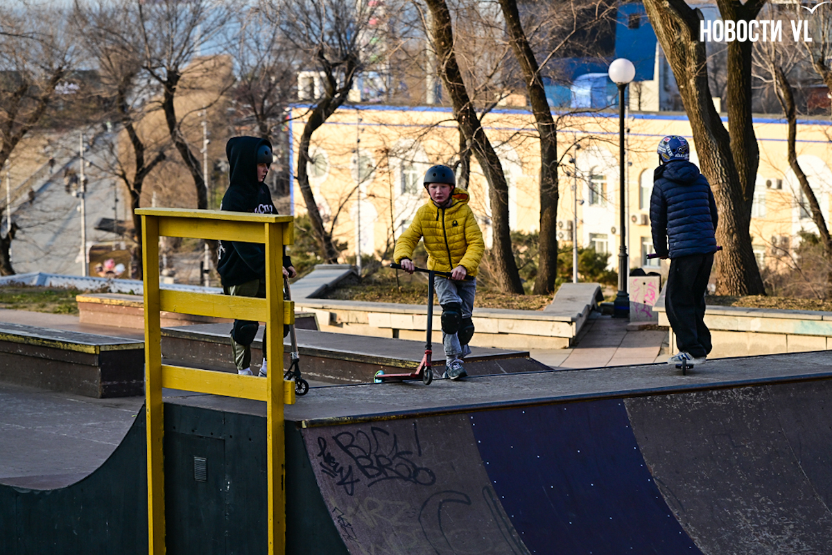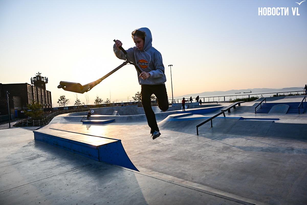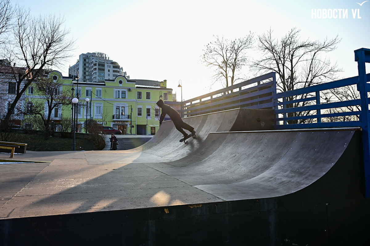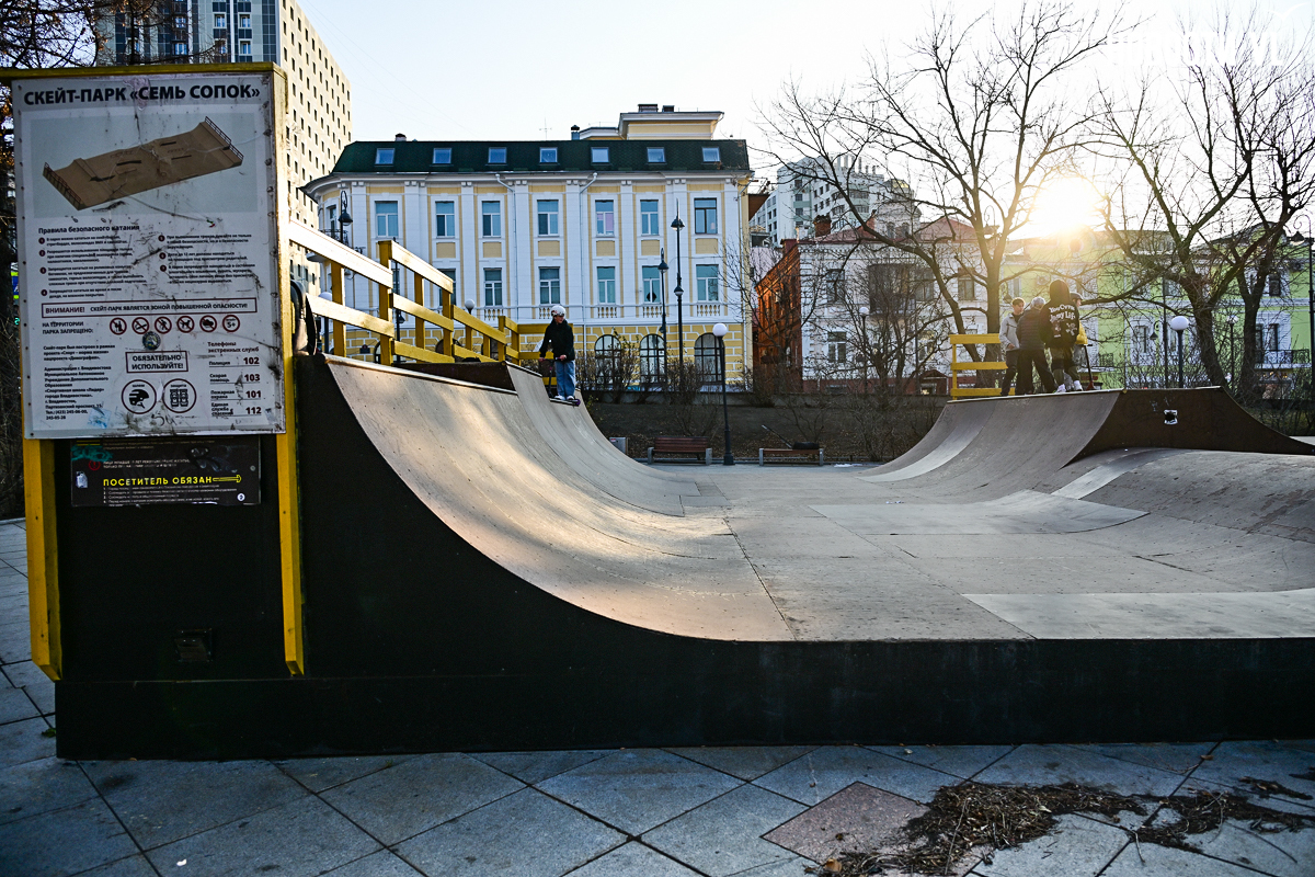 Новый экстрим-парк действительно встретил корреспондента Новостей VL.ru тишиной – мы ходили туда и в будни, и на ноябрьских праздниках. Яркие бетонные фигуры были пусты, лишь чёрные следы от колёс указывали на то, что площадкой пользовались. А вот на набережной в центре Владивостока оживлённо даже сегодня. Школьники пятых-седьмых классов катаются на самокатах и скейтах. Оборудование здесь уже заметно потёртое – видно, что им часто пользуются. Мальчишки говорят, им нравится кататься в центре: на рампах возле кинотеатра «Океан» и на площадке Спортивной набережной. Рядом можно найти общественные туалеты и есть где перекусить.