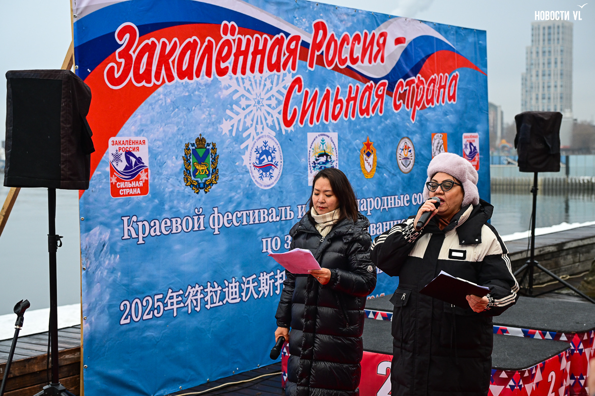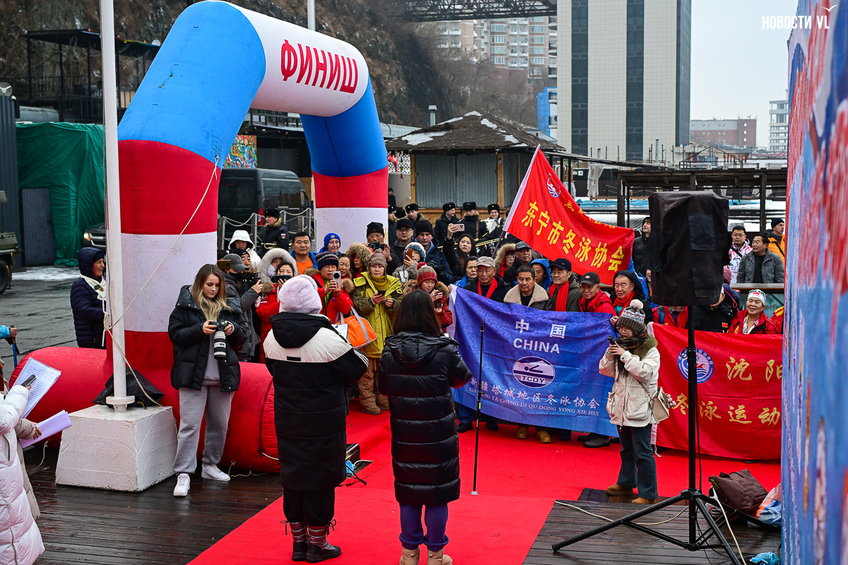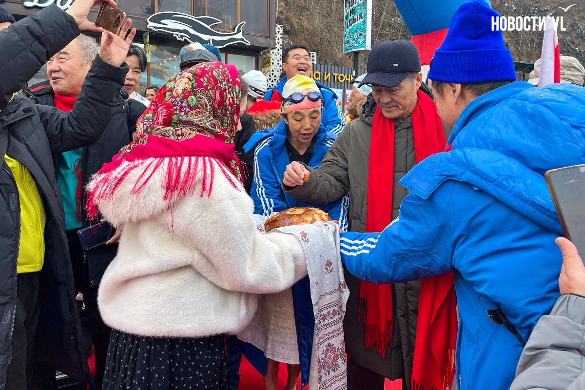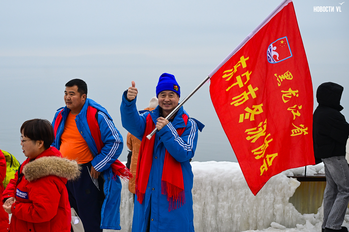 Начали фестиваль зимнего плавания задорно – после официальной части выступили вокалистки музыкального ансамбля и вынесли каравай. И, пока приморцы стояли в стороне, гости из поднебесной пустились в пляс. Помешать танцам не смогли даже заполненные спортивные сумки, свисающие через плечо.