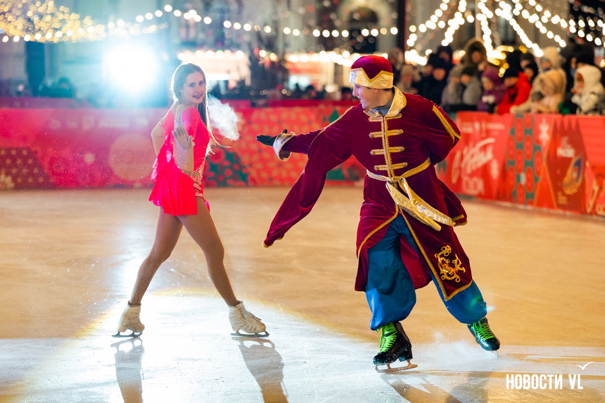 Площадку под каток на время новогодних праздников собирают в центре Владивостока каждый год вместе с новогодним городком. В этом году по форме это классическая хоккейная коробка, зато с большим экраном. В последний день года на катке проходила часть праздничного представления, а теперь сюда можно прийти и покататься бесплатно.
