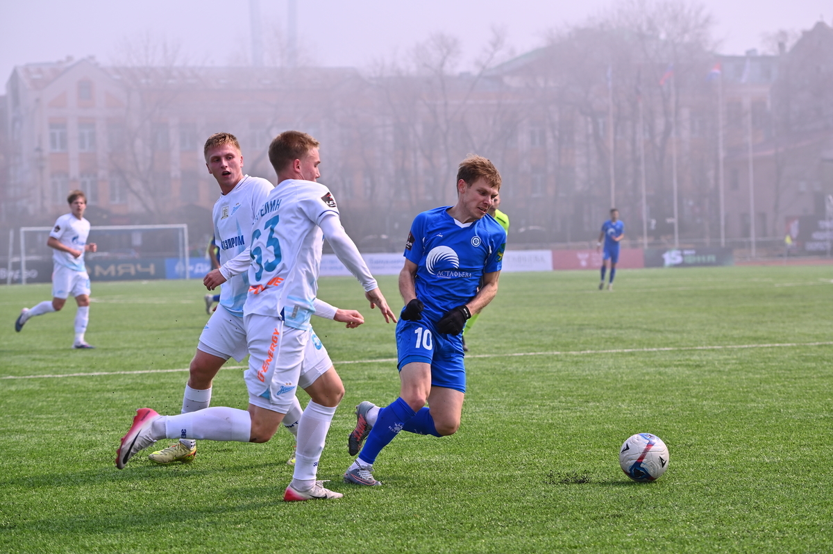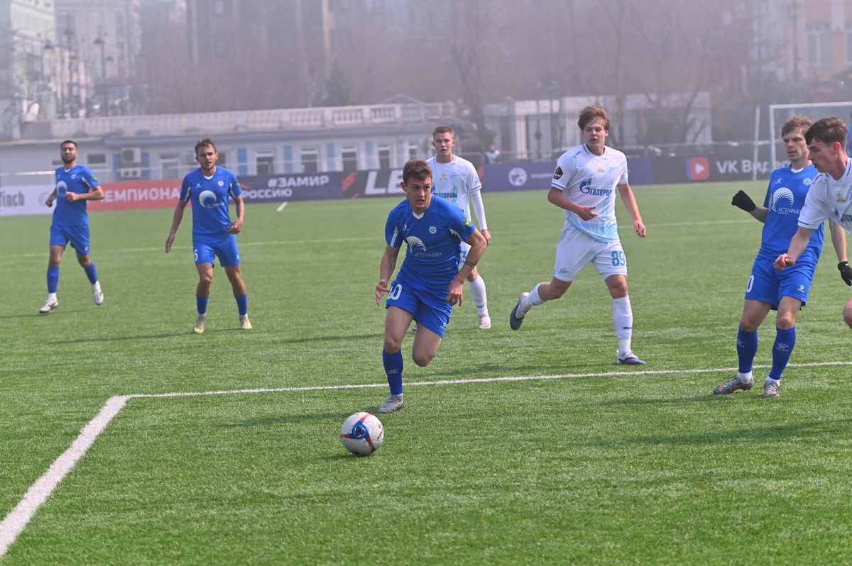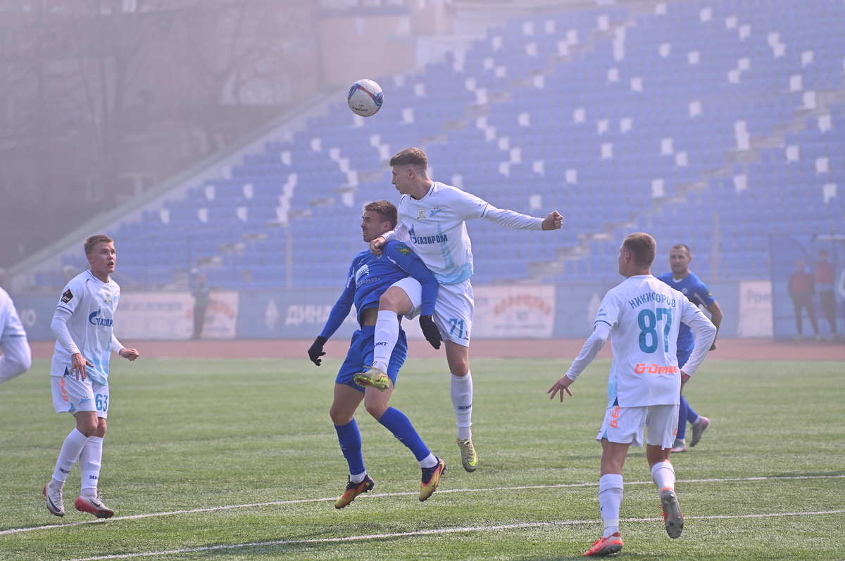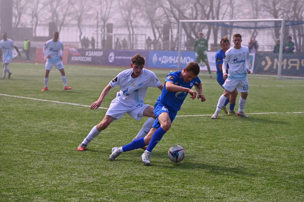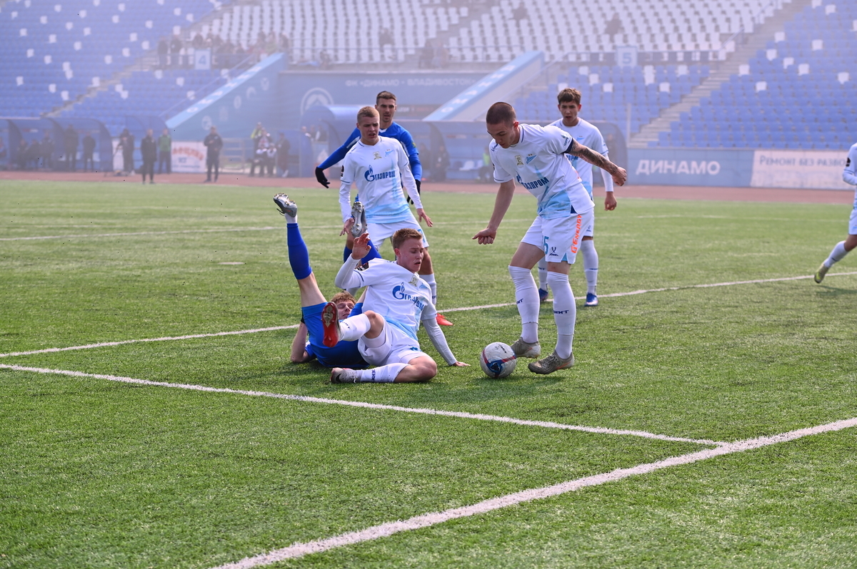Приморские болельщики с нетерпением ждали возвращения большого футбола во Владивосток, и дождались в конце марта, спустя полгода, когда футболисты «Динамо» на родном стадионе сошлись против чемпиона Второй лиги «Б», второй команды титулованного петербургского «Зенита». В начале встречи «Динамо» понеслось вперёд крупными силами и моментально завладело преимуществом, получив свободное пространство для организации атак, которым, по большому счёту, не хватало завершения. Первый по-настоящему опасный момент возник на 8-й минуте, когда Касаткин получил пас в центре штрафной, но не смог выстрелить без опеки, попав под подкат «зенитовца», зато успел пробить, лёжа на газоне, правда, парировал голкипер. Гости действовали вторым номером, однако одна из контратак принесла им гол: Матвей Иванов открыл счёт головой после дальнего заброса в штрафную зону – 1:0.
