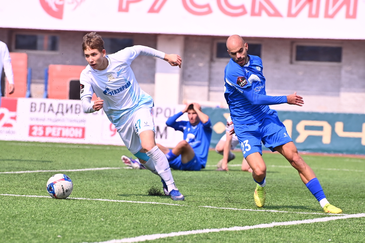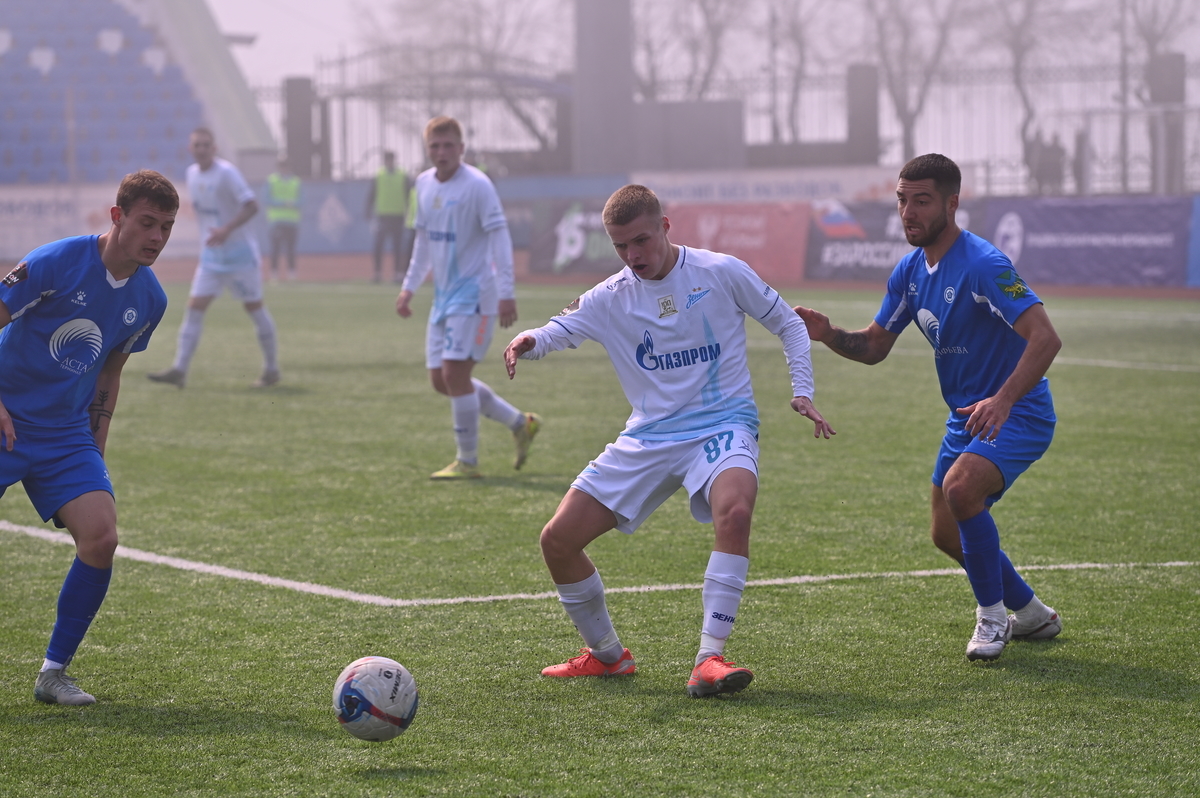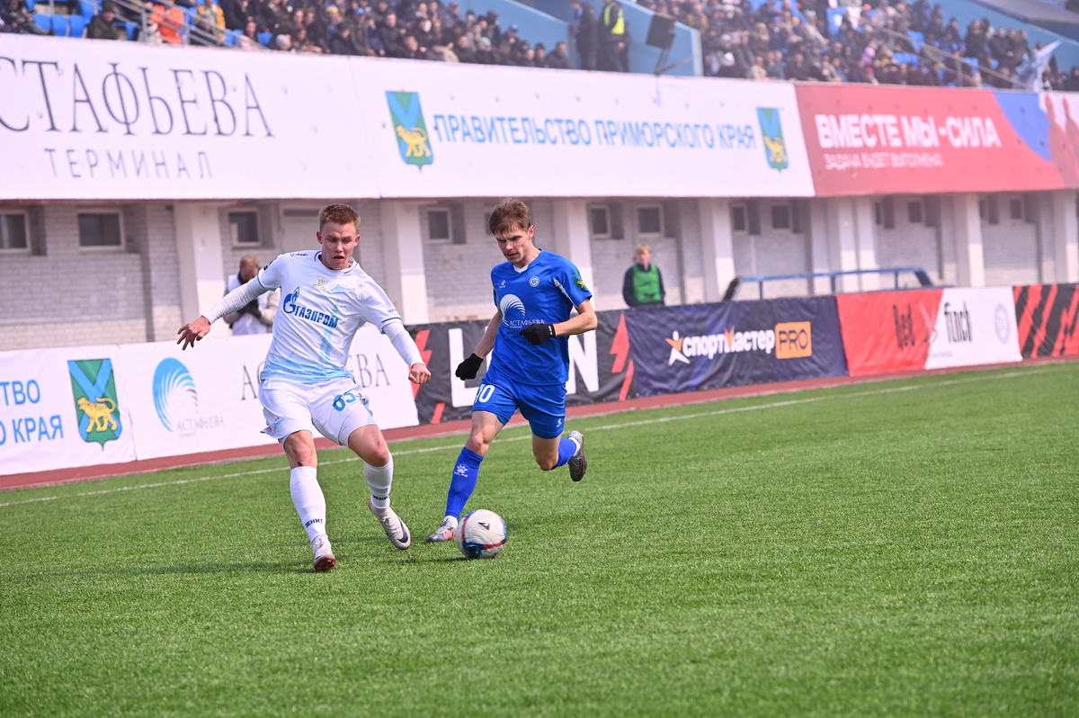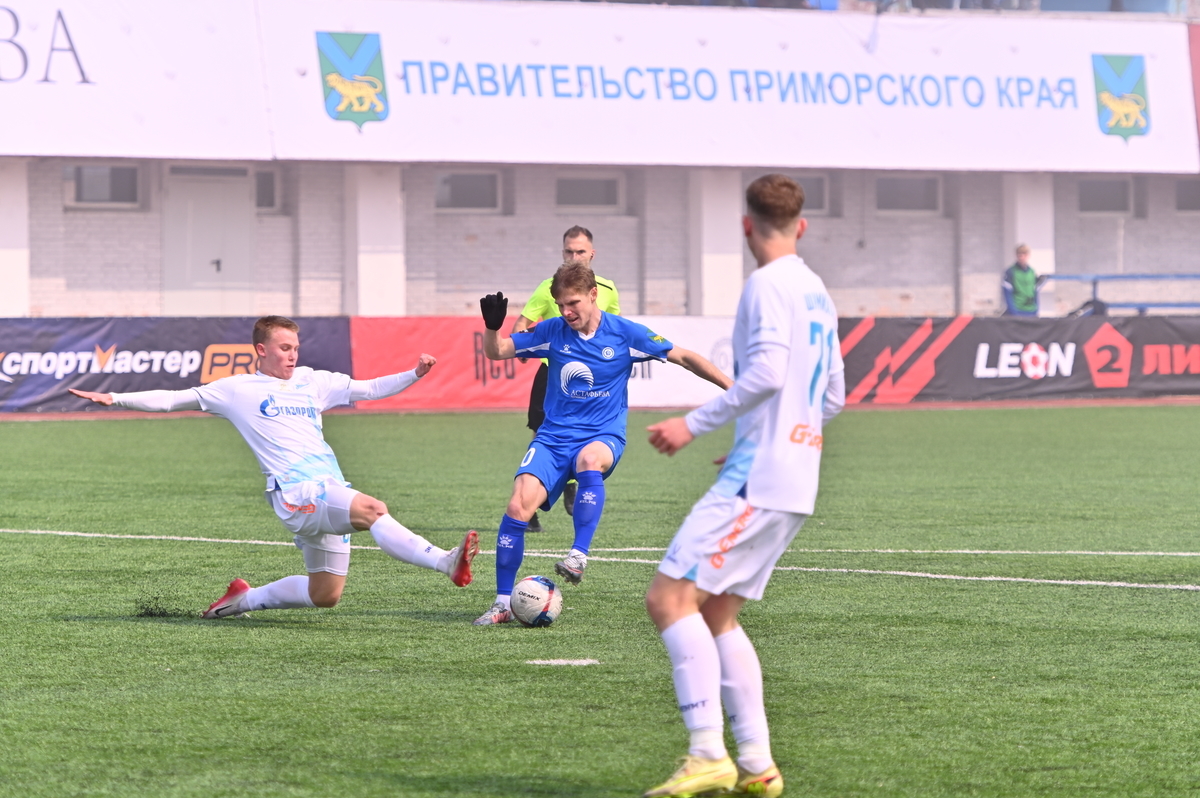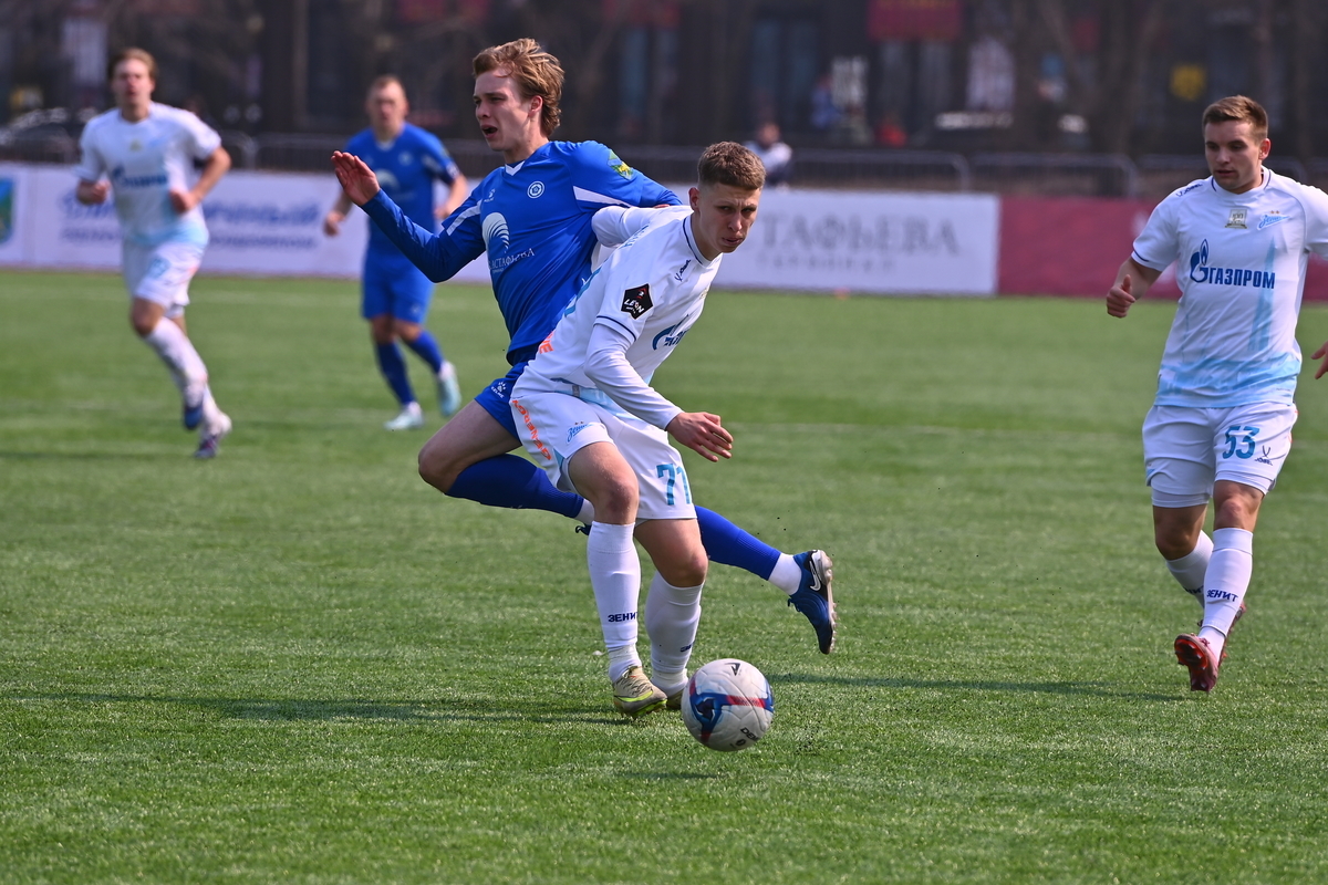 Приморские болельщики с нетерпением ждали возвращения большого футбола во Владивосток, и дождались в конце марта, спустя полгода, когда футболисты «Динамо» на родном стадионе сошлись против чемпиона Второй лиги «Б», второй команды титулованного петербургского «Зенита». В начале встречи «Динамо» понеслось вперёд крупными силами и моментально завладело преимуществом, получив свободное пространство для организации атак, которым, по большому счёту, не хватало завершения. Первый по-настоящему опасный момент возник на 8-й минуте, когда Касаткин получил пас в центре штрафной, но не смог выстрелить без опеки, попав под подкат «зенитовца», зато успел пробить, лёжа на газоне, правда, парировал голкипер. Гости действовали вторым номером, однако одна из контратак принесла им гол: Матвей Иванов открыл счёт головой после дальнего заброса в штрафную зону – 1:0.