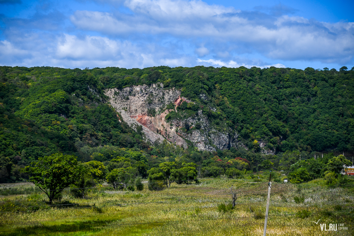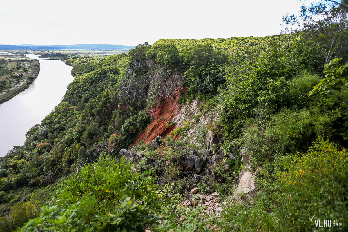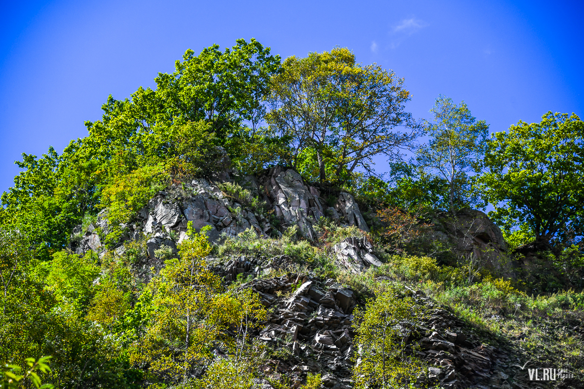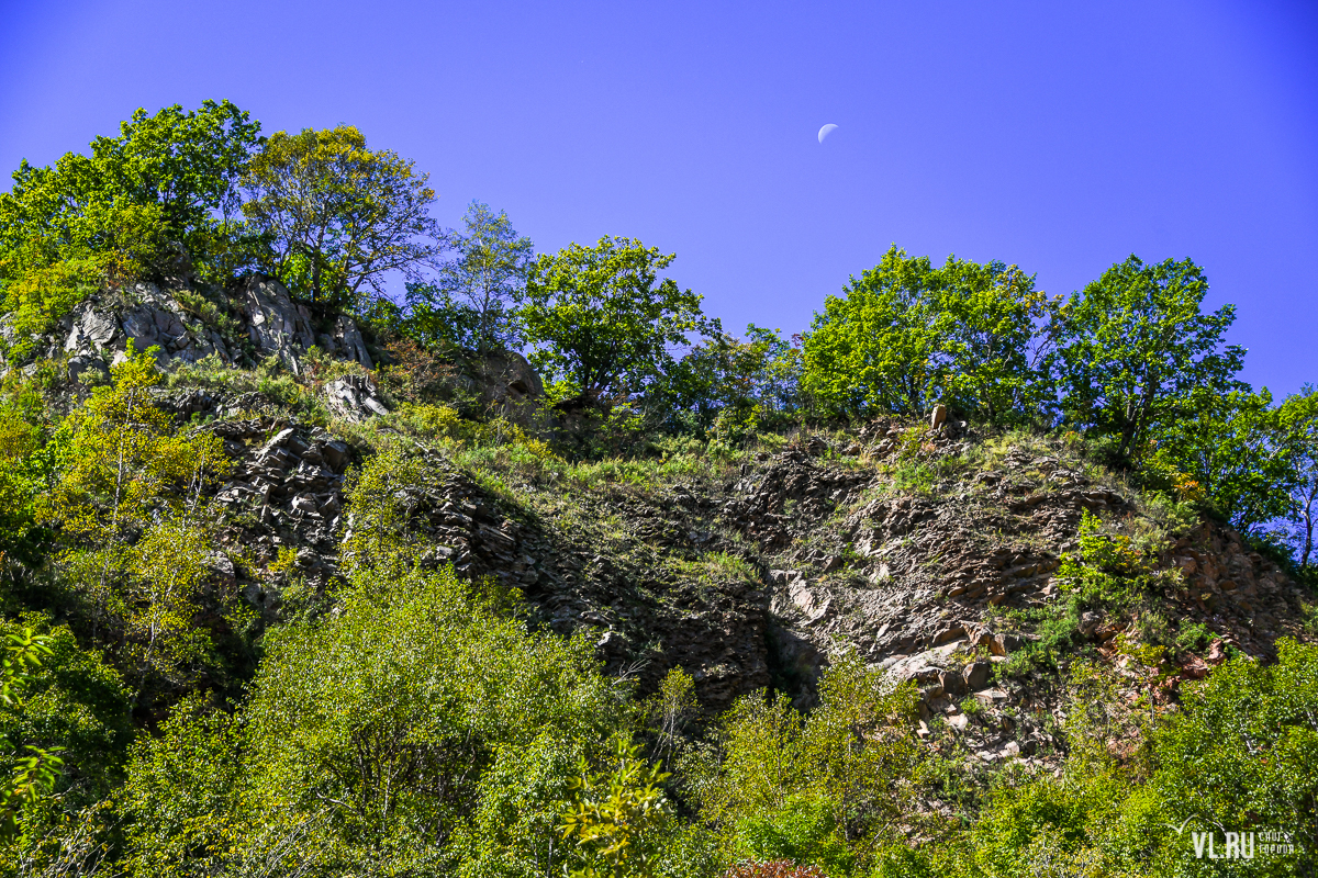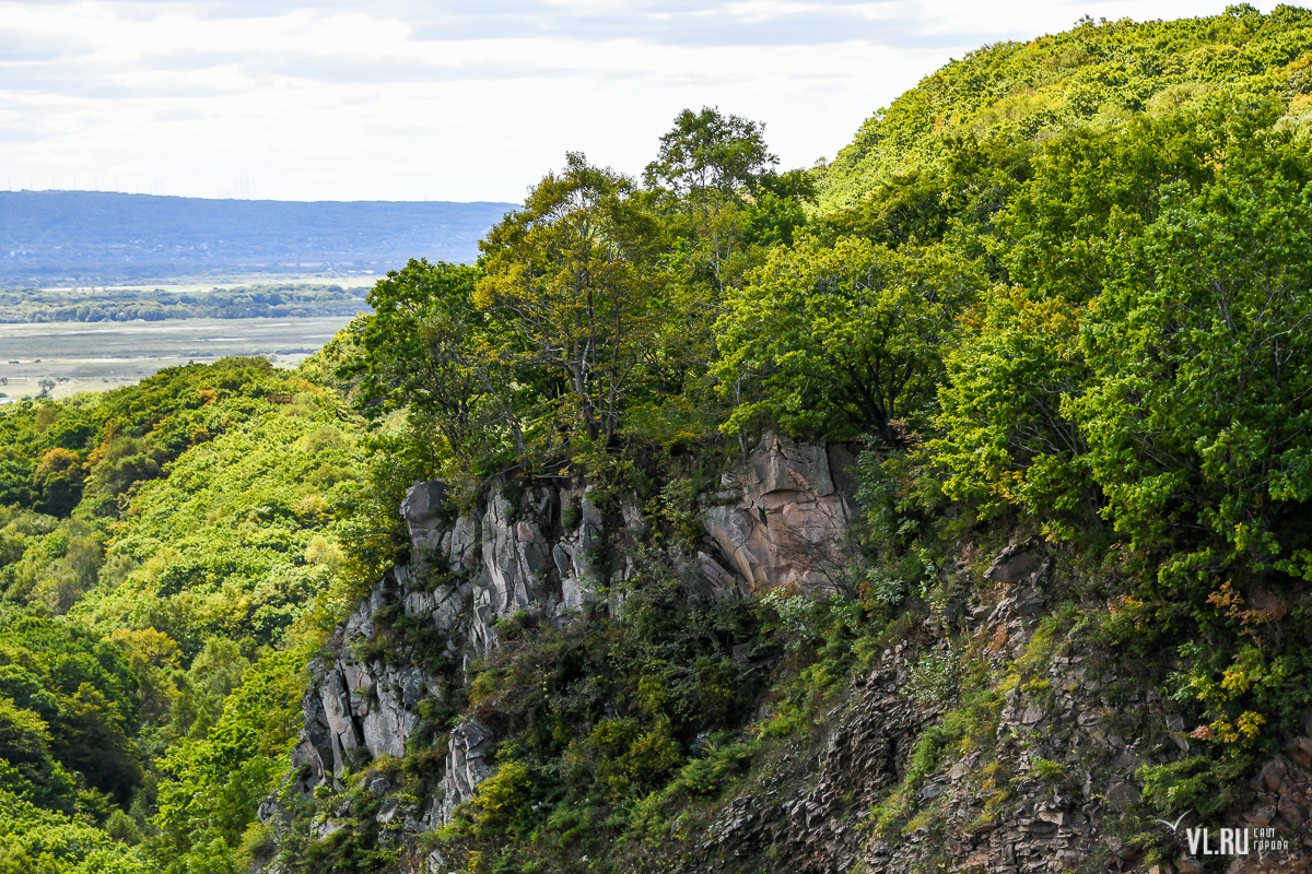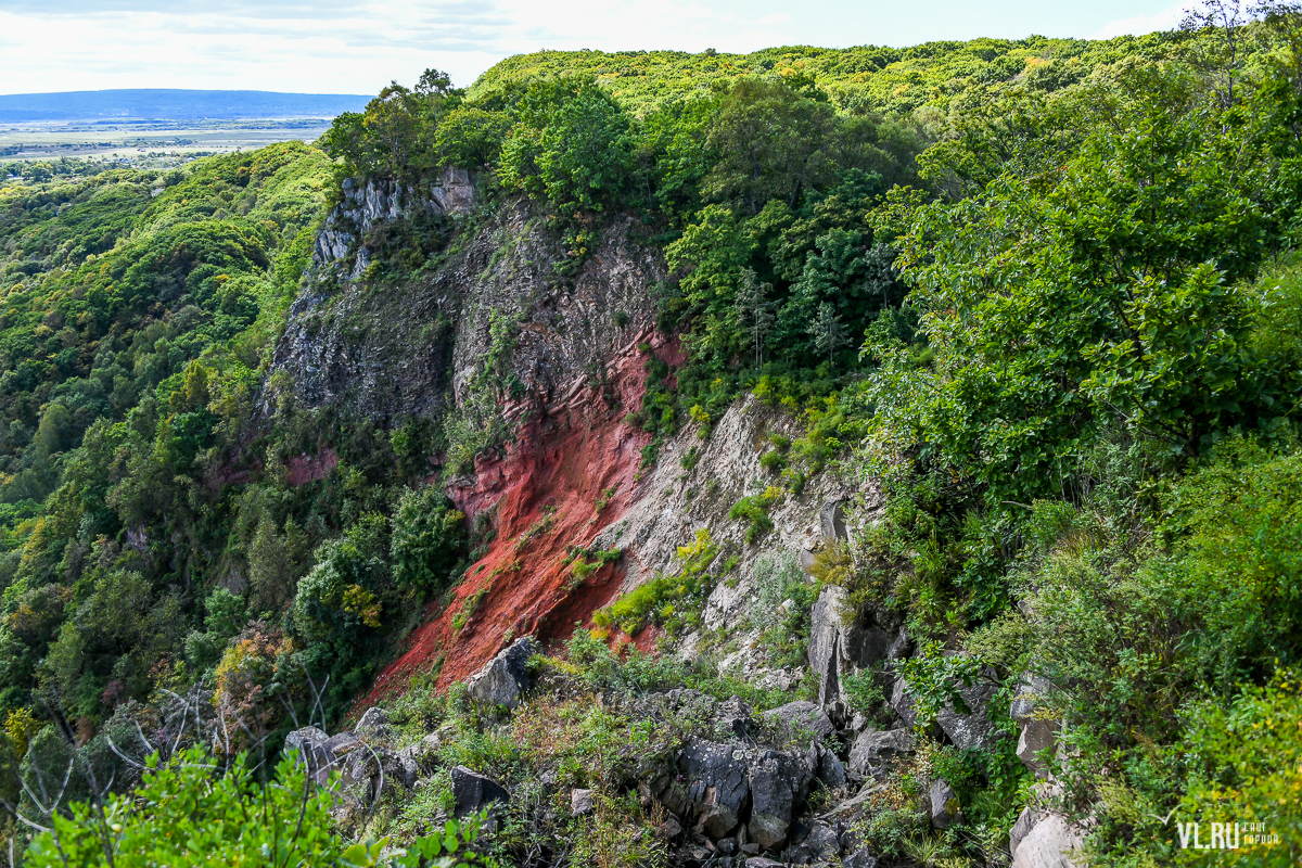 Отсюда открывается красивый вид на долину реки Раздольной, вдали слышится шум проезжающих через железнодорожную станцию Барановский составов, и только чуть красный клен у подножия вулканической стены напоминает, что в Приморье пришла осень.