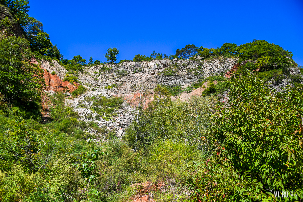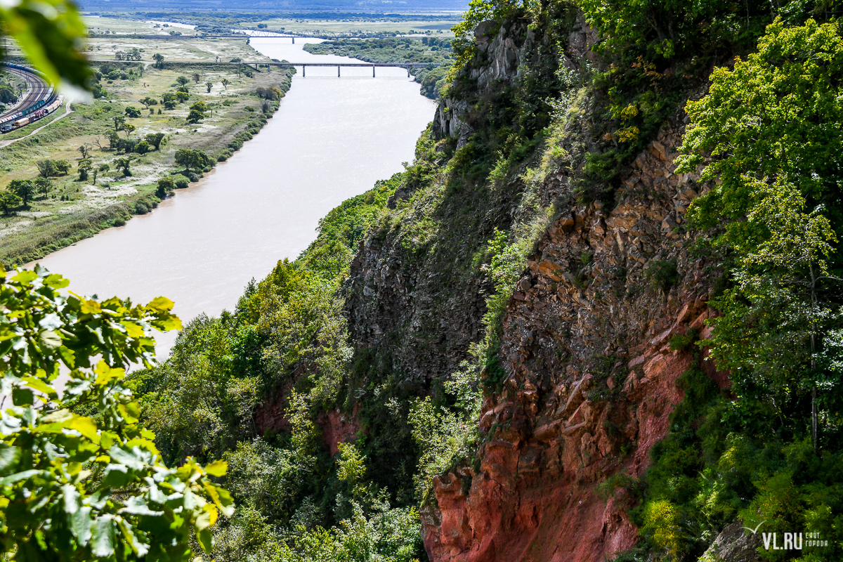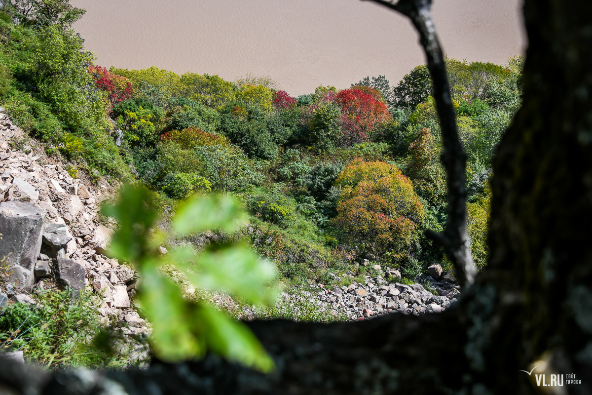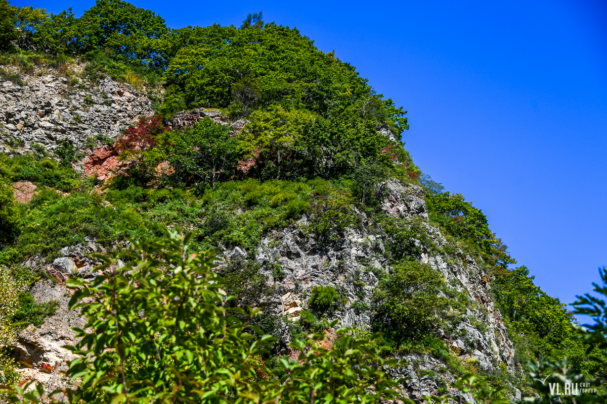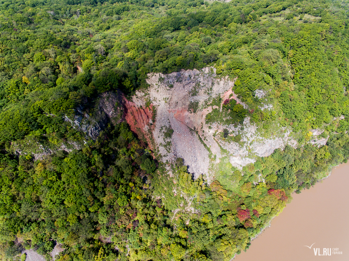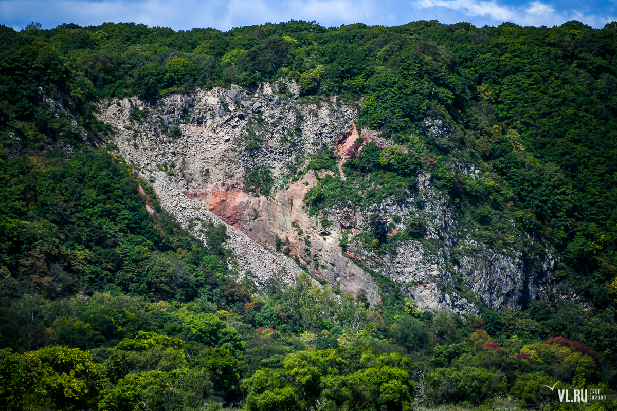Отсюда открывается красивый вид на долину реки Раздольной, вдали слышится шум проезжающих через железнодорожную станцию Барановский составов, и только чуть красный клен у подножия вулканической стены напоминает, что в Приморье пришла осень.