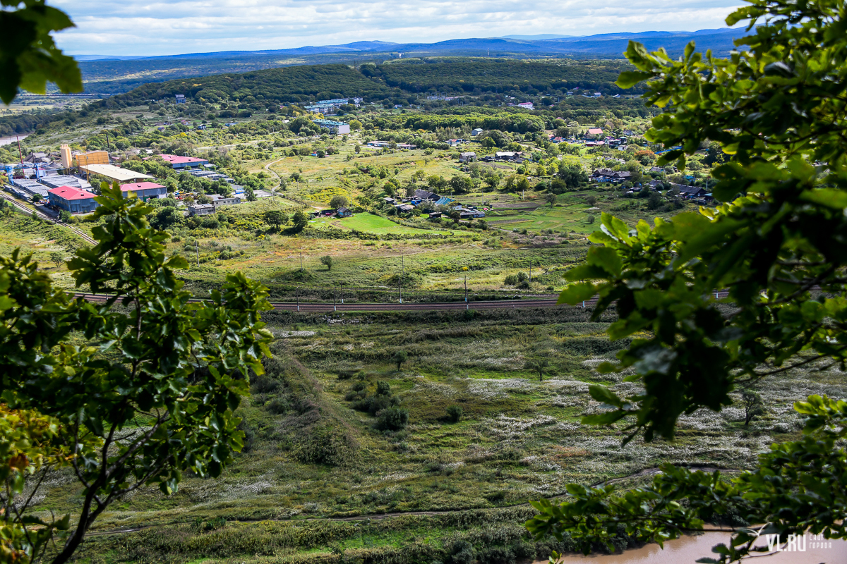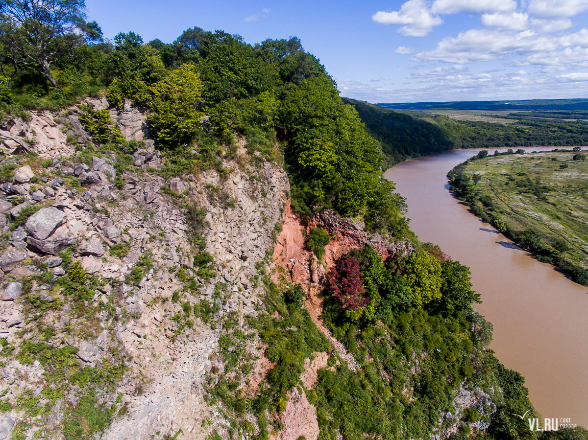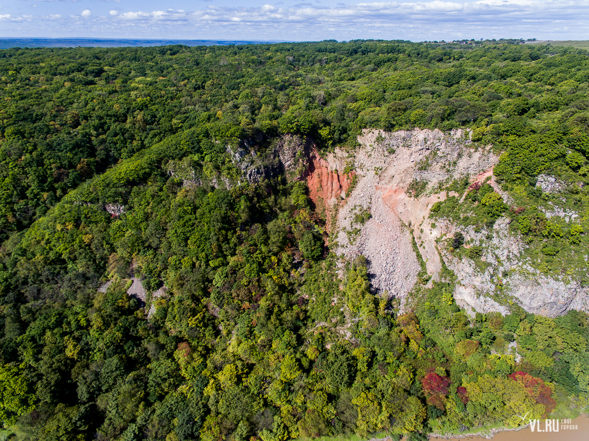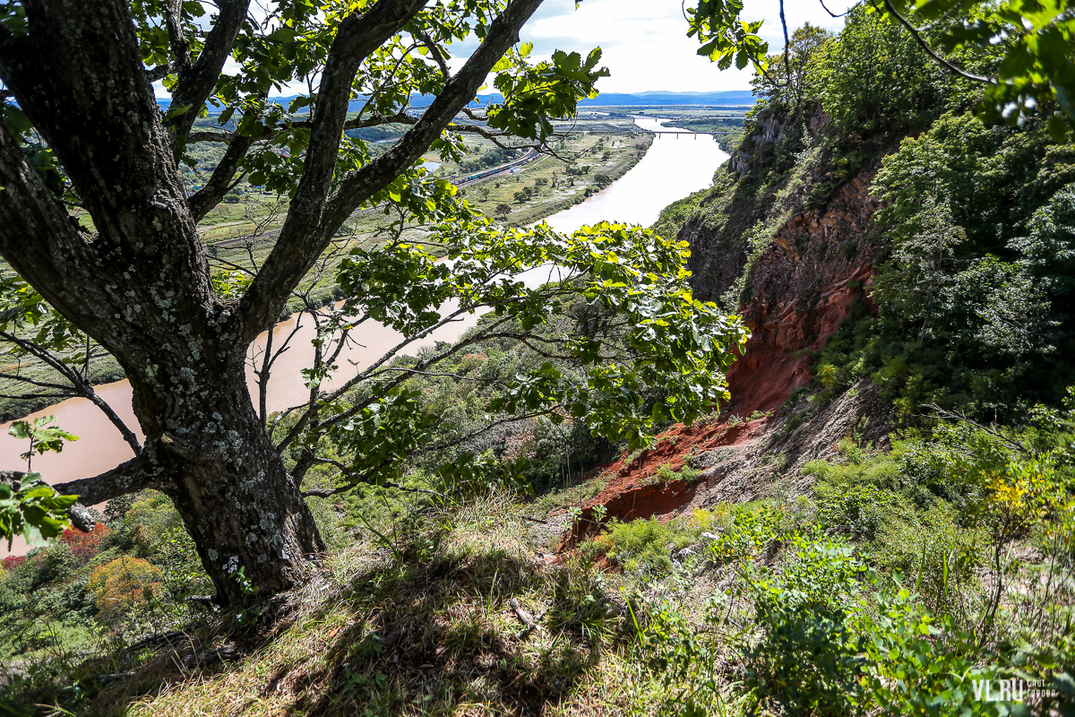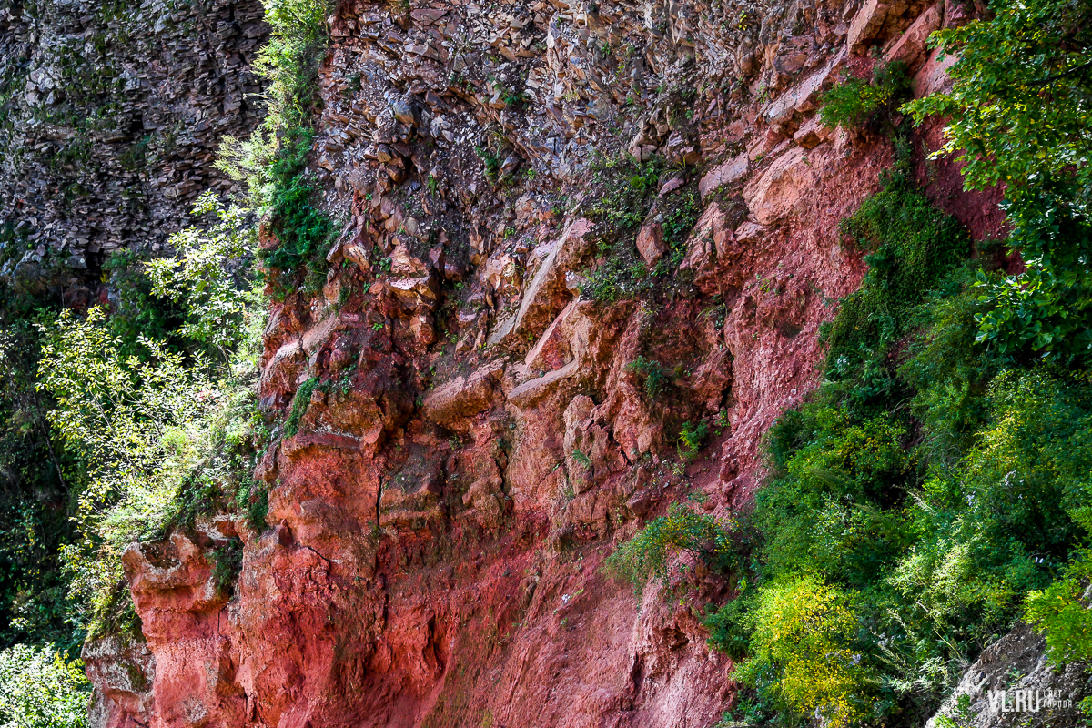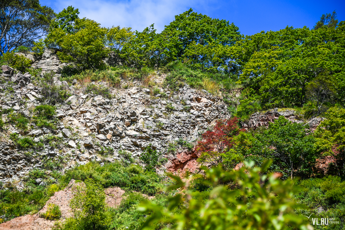 Отсюда открывается красивый вид на долину реки Раздольной, вдали слышится шум проезжающих через железнодорожную станцию Барановский составов, и только чуть красный клен у подножия вулканической стены напоминает, что в Приморье пришла осень.