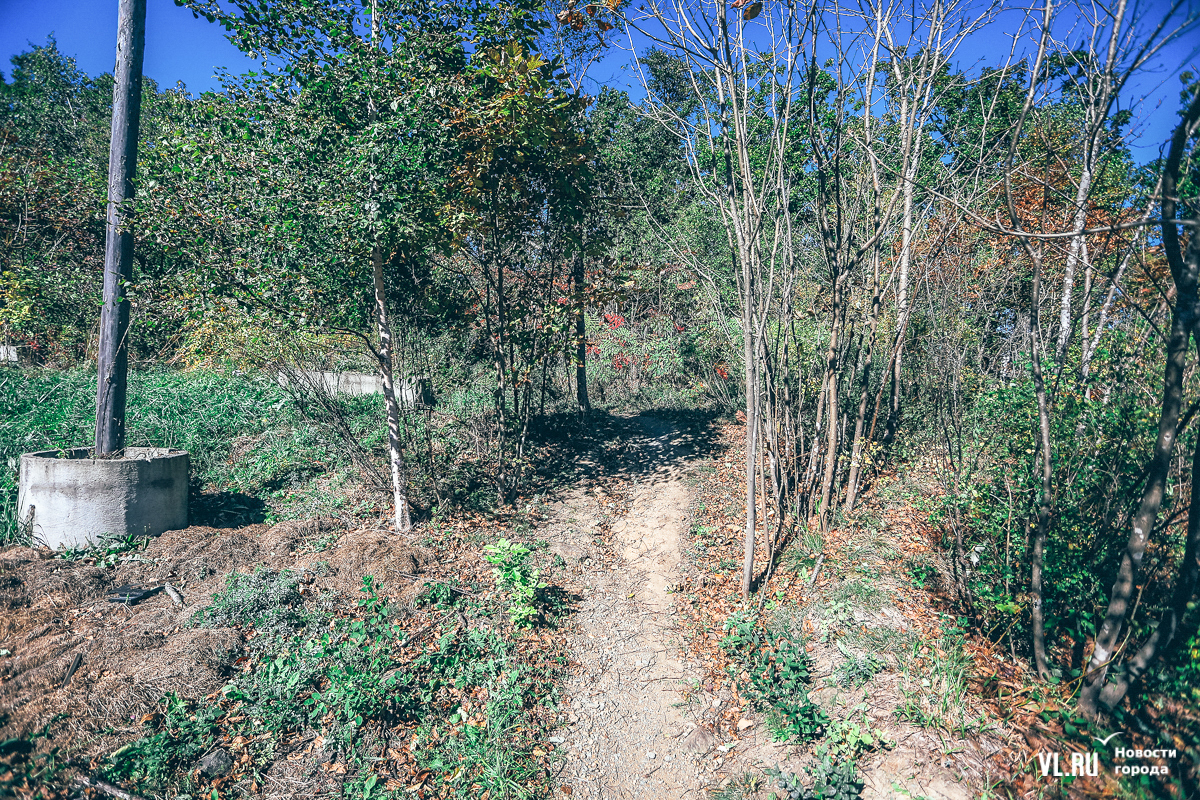 Оставив машину на вышеупомянутой парковке, надо обойти школу, за которой легко отыскать тропинку, уходящую в лесополосу. Местные жители здесь разбили небольшой парк. Высадили хвойные деревья, немного очистили лес от упавших после тайфуна веток и построили лавочку со столиком для пикника.