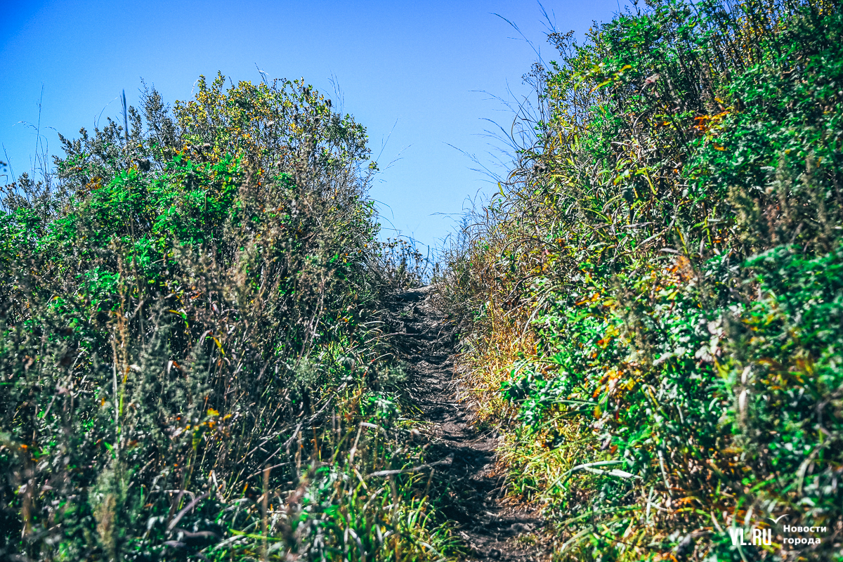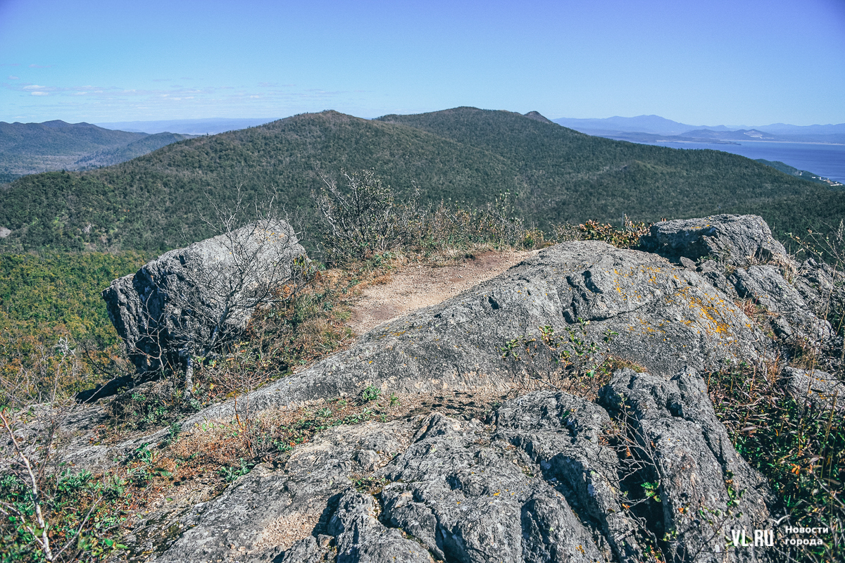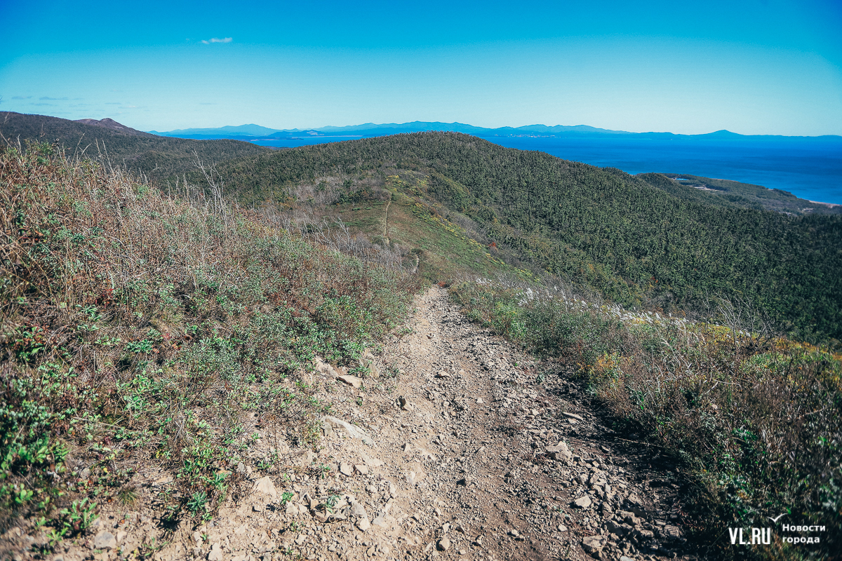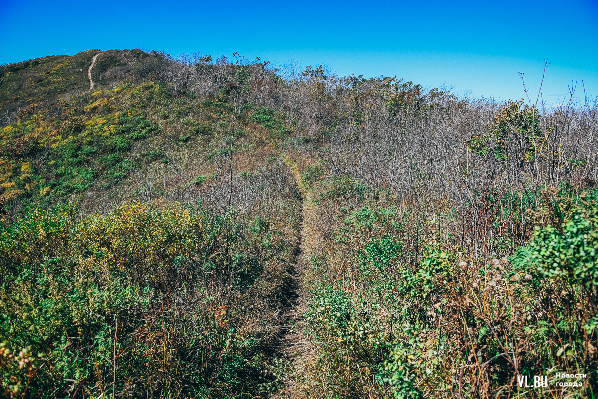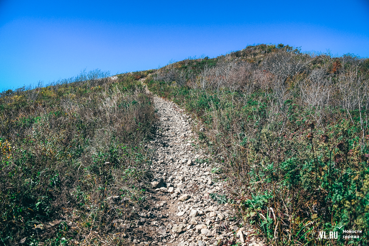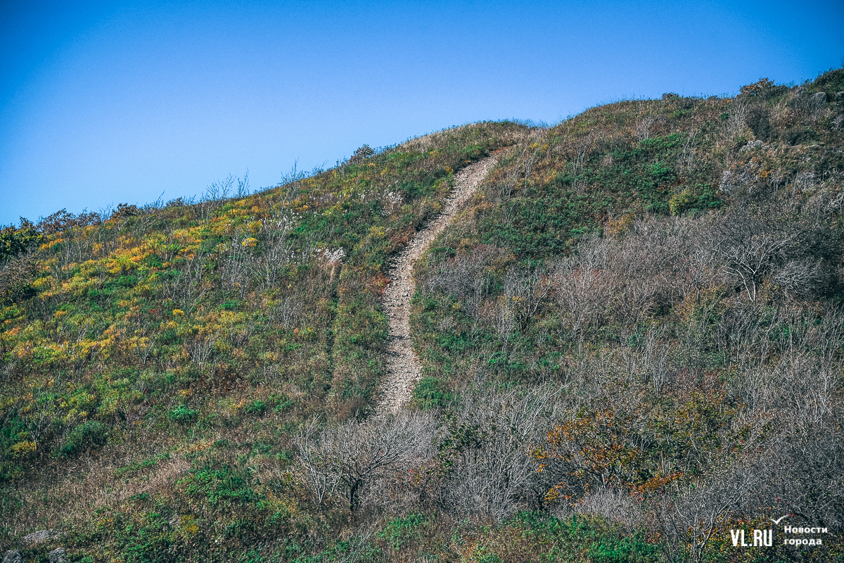Дальше тропа идёт по Океанскому хребту. Слева появляется прекрасный вид на Уссурийский залив и бухту Лазурную, ну а справа – бескрайние холмы, между которыми спряталось городское водохранилище. Через несколько сотен метров появляется ещё один небольшой, но коварный подъём. Коварность его заключается в сыпучих камнях, которые то и дело пытаются утянуть вниз. Здесь легко упасть на пятую точку и скатиться вниз (особенно на обратном пути).