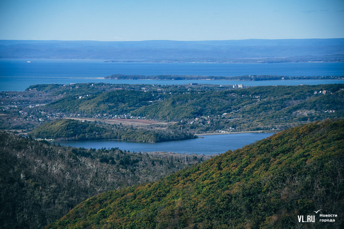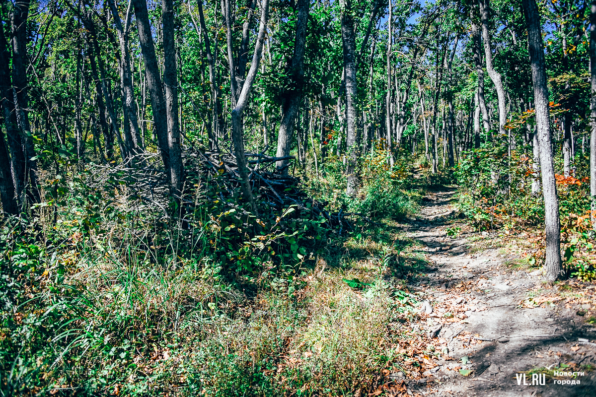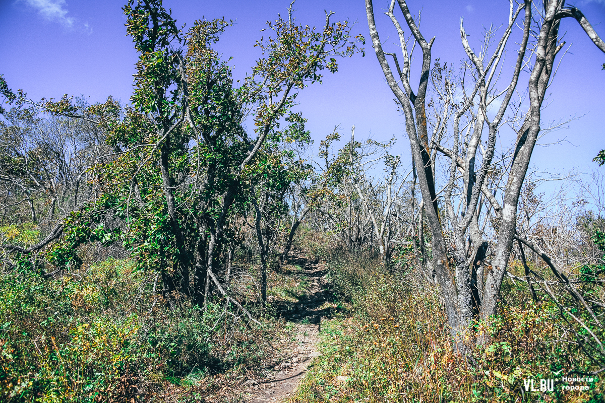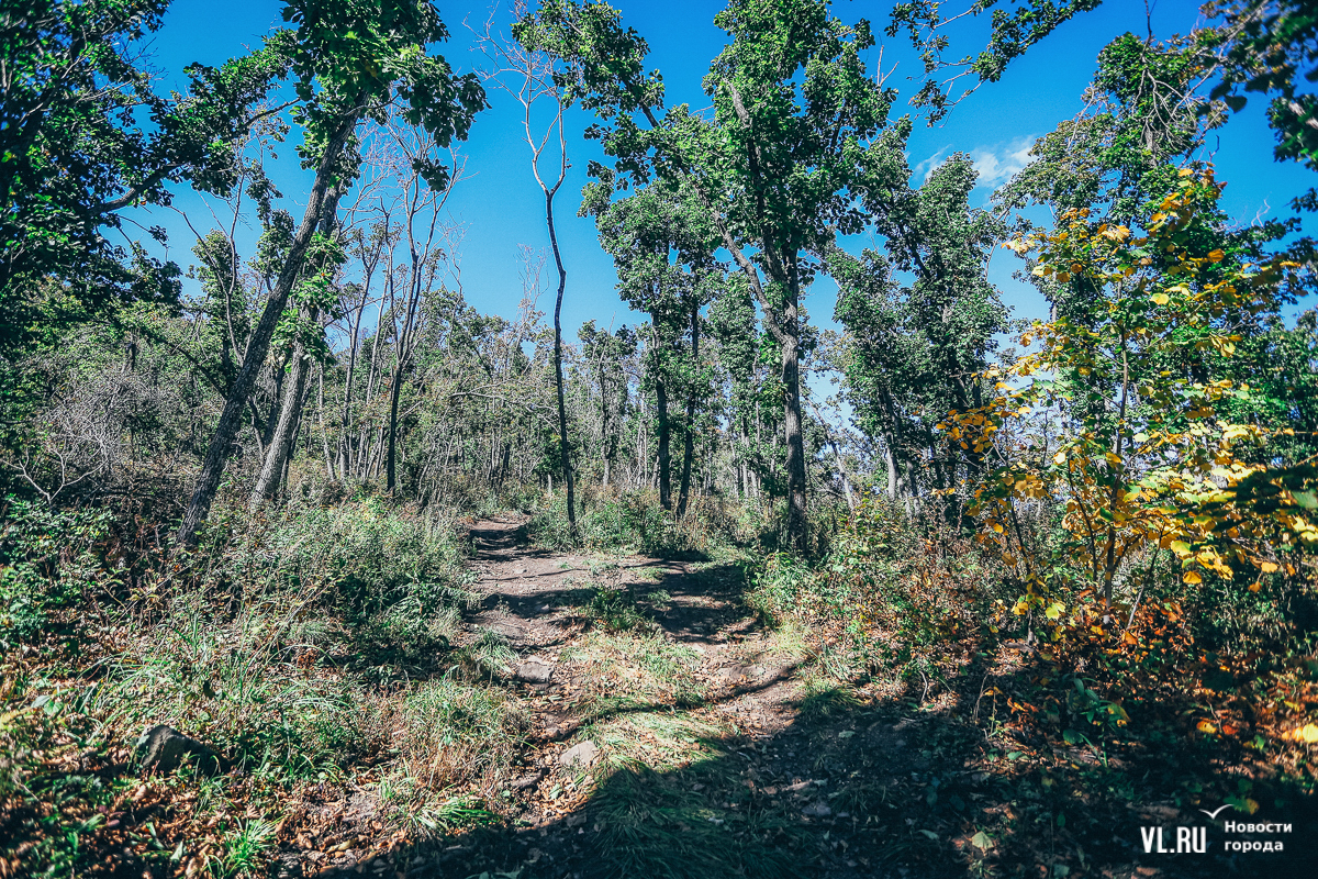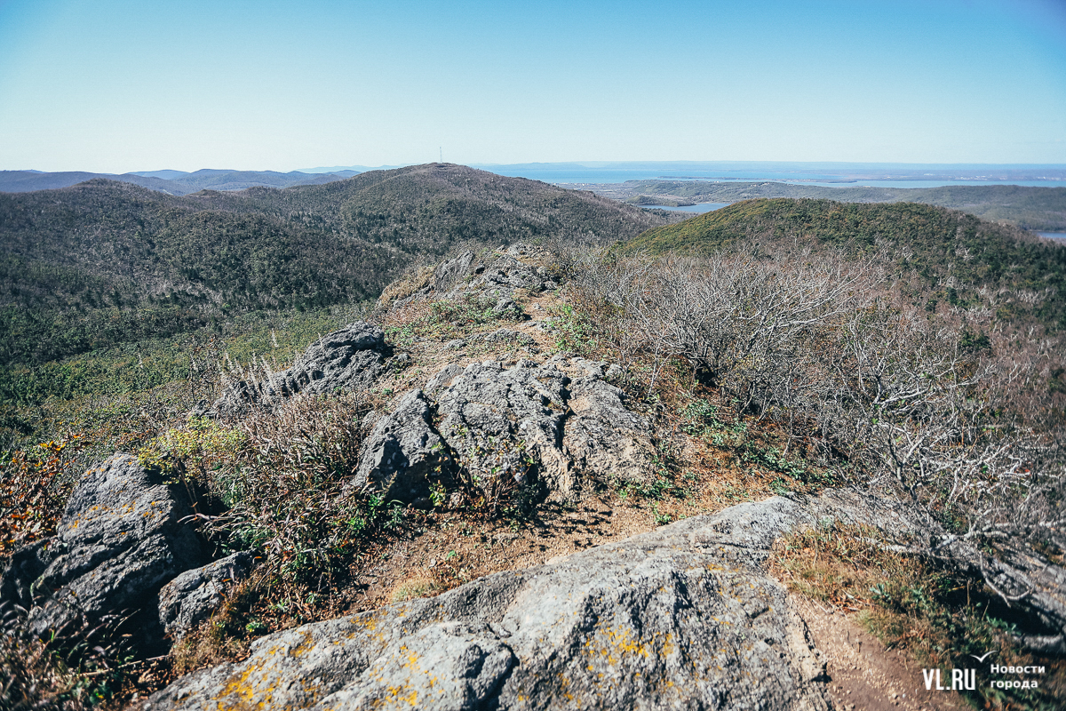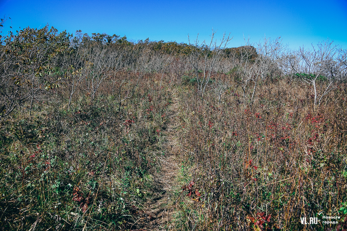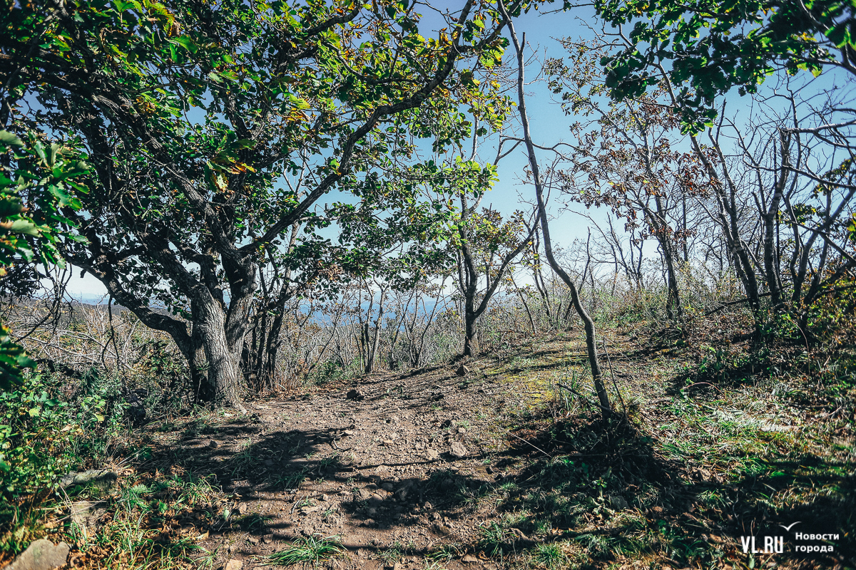 Дальше тропа идёт по Океанскому хребту. Слева появляется прекрасный вид на Уссурийский залив и бухту Лазурную, ну а справа – бескрайние холмы, между которыми спряталось городское водохранилище. Через несколько сотен метров появляется ещё один небольшой, но коварный подъём. Коварность его заключается в сыпучих камнях, которые то и дело пытаются утянуть вниз. Здесь легко упасть на пятую точку и скатиться вниз (особенно на обратном пути).