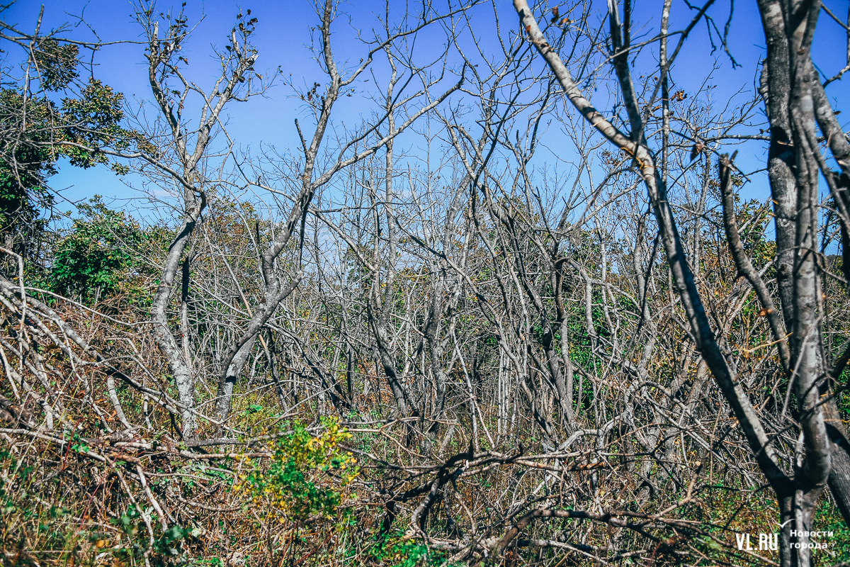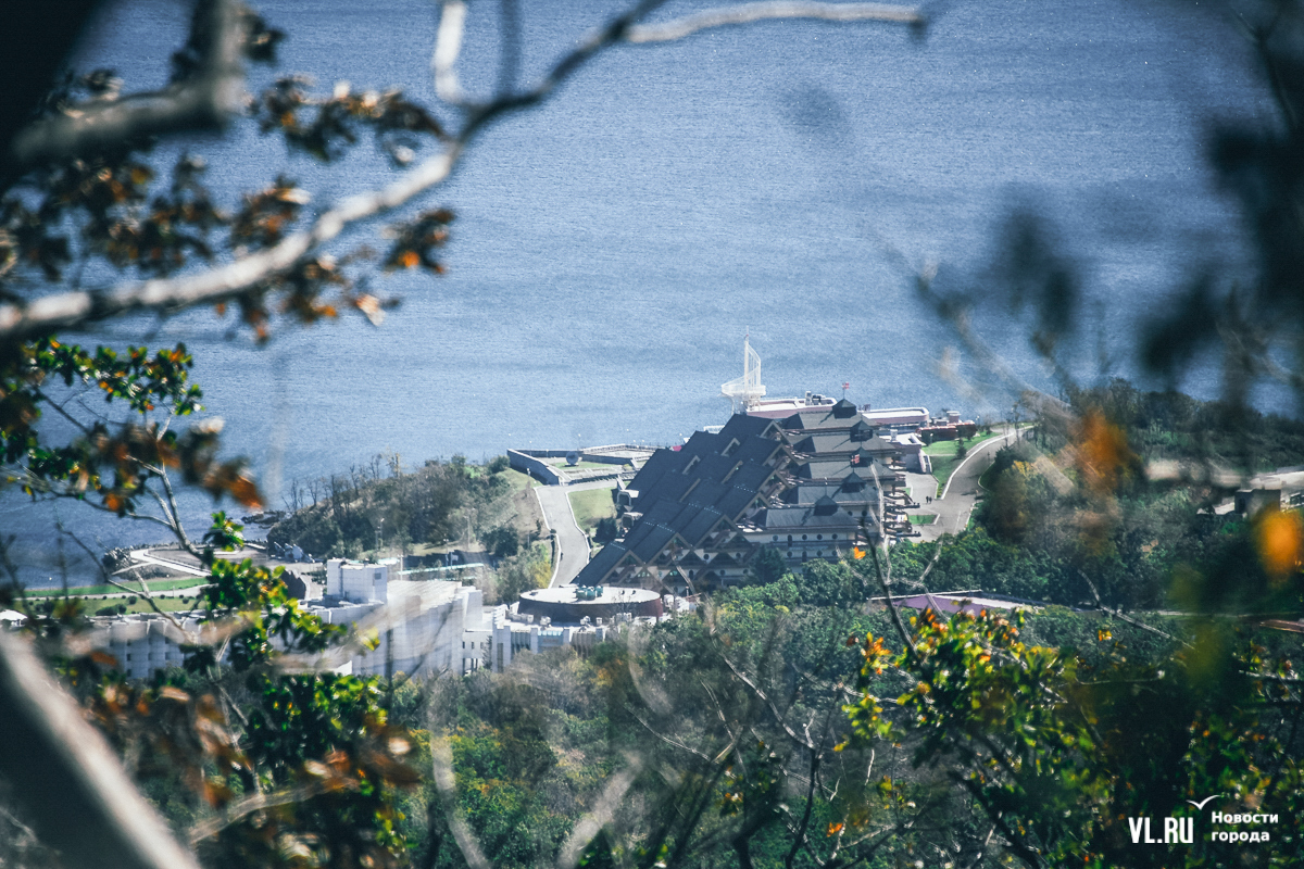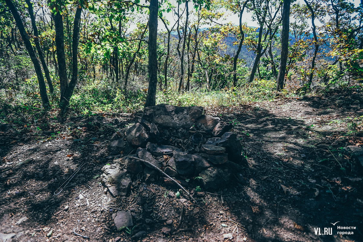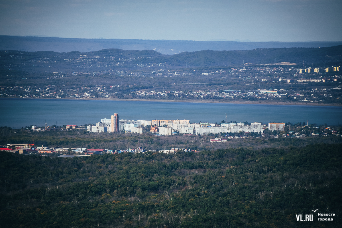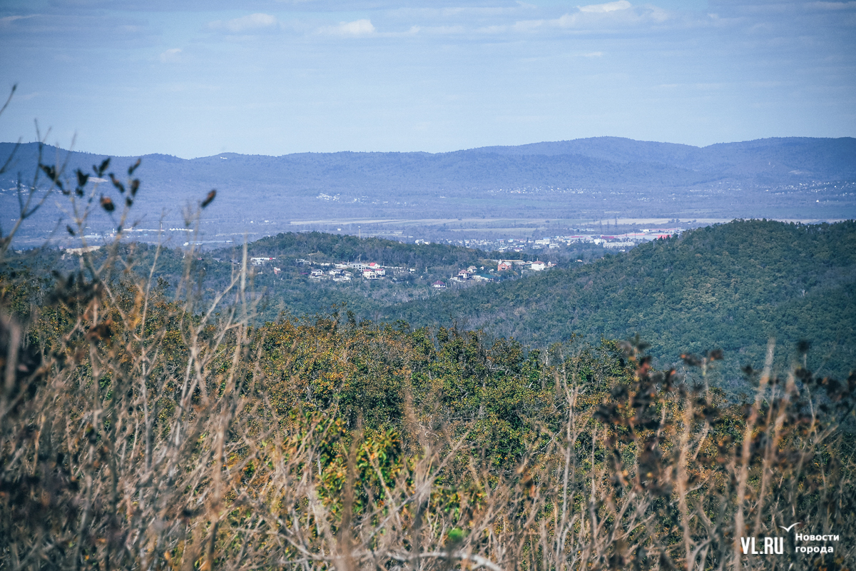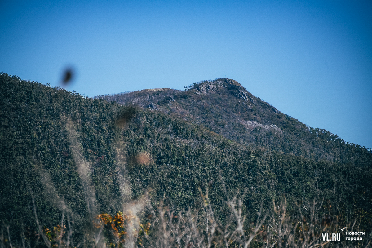 Дальше тропа идёт по Океанскому хребту. Слева появляется прекрасный вид на Уссурийский залив и бухту Лазурную, ну а справа – бескрайние холмы, между которыми спряталось городское водохранилище. Через несколько сотен метров появляется ещё один небольшой, но коварный подъём. Коварность его заключается в сыпучих камнях, которые то и дело пытаются утянуть вниз. Здесь легко упасть на пятую точку и скатиться вниз (особенно на обратном пути).