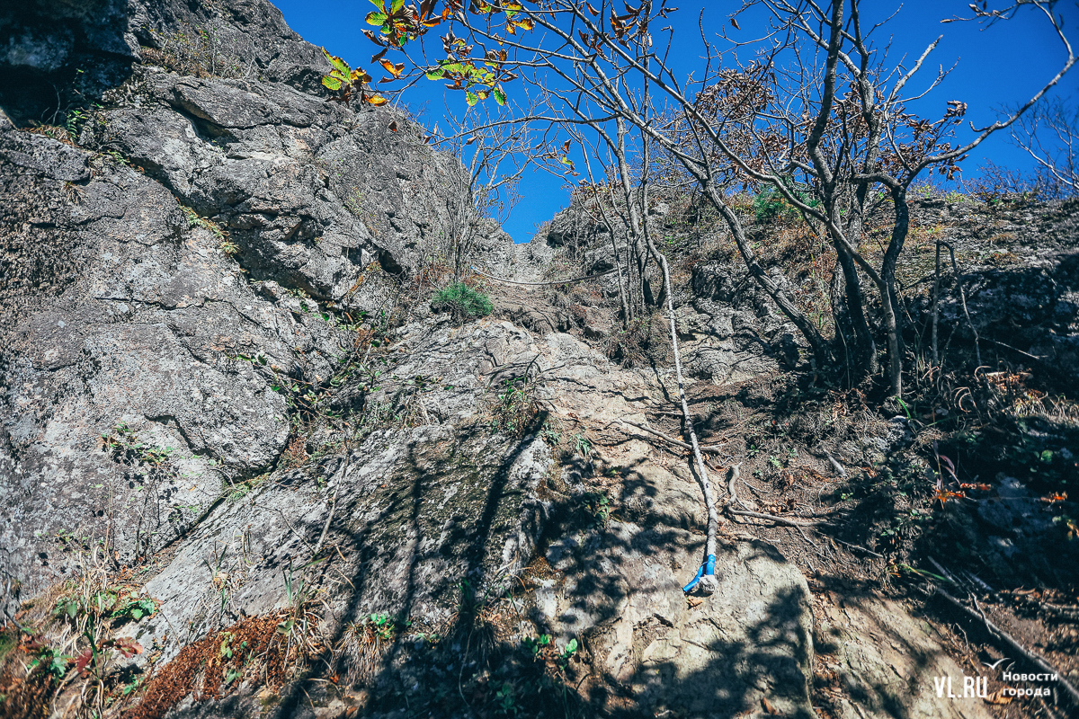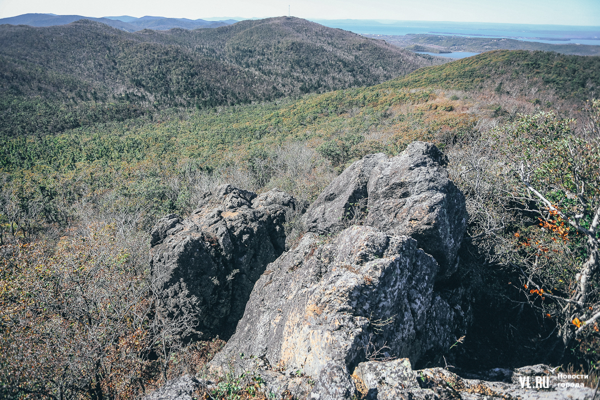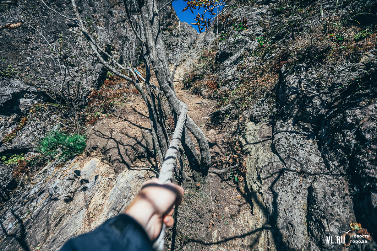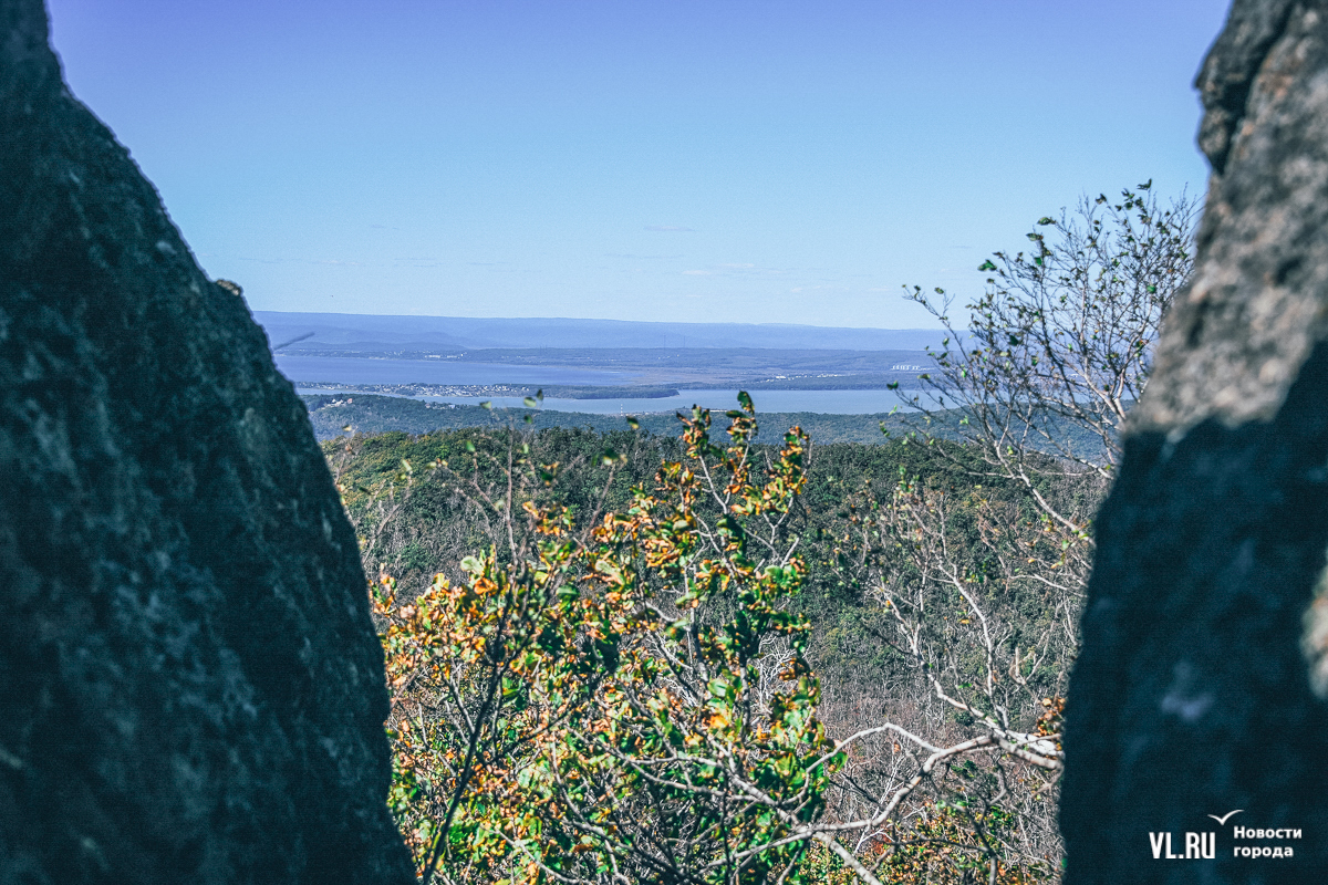 Когда вы дойдёте до скального массива, останется задача забраться на его вершину. Благо кто-то позаботился о посетителях и привязал здесь канат, который значительно облегчает подъём. На вершине горы Орлиный Коготь достаточно ветрено, но это и не удивительно. С обеих сторон гору окружают заливы, которые то и дело направляют друг другу потоки «лёгкого приморского бриза». Здесь же можно увидеть водохранилище, кварталы посёлка Трудовое и даже Артёмовский городской округ на другой стороне Амурского залива. И бескрайние сопки прибрежных хребтов.