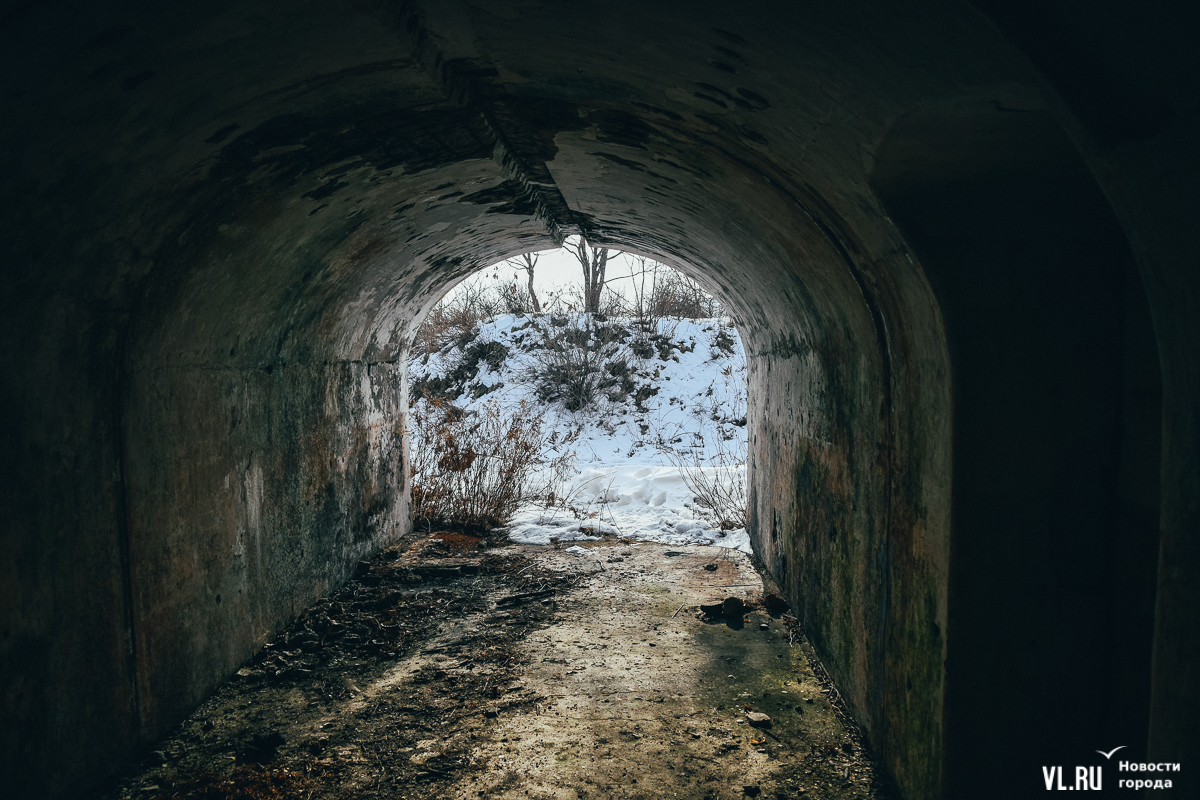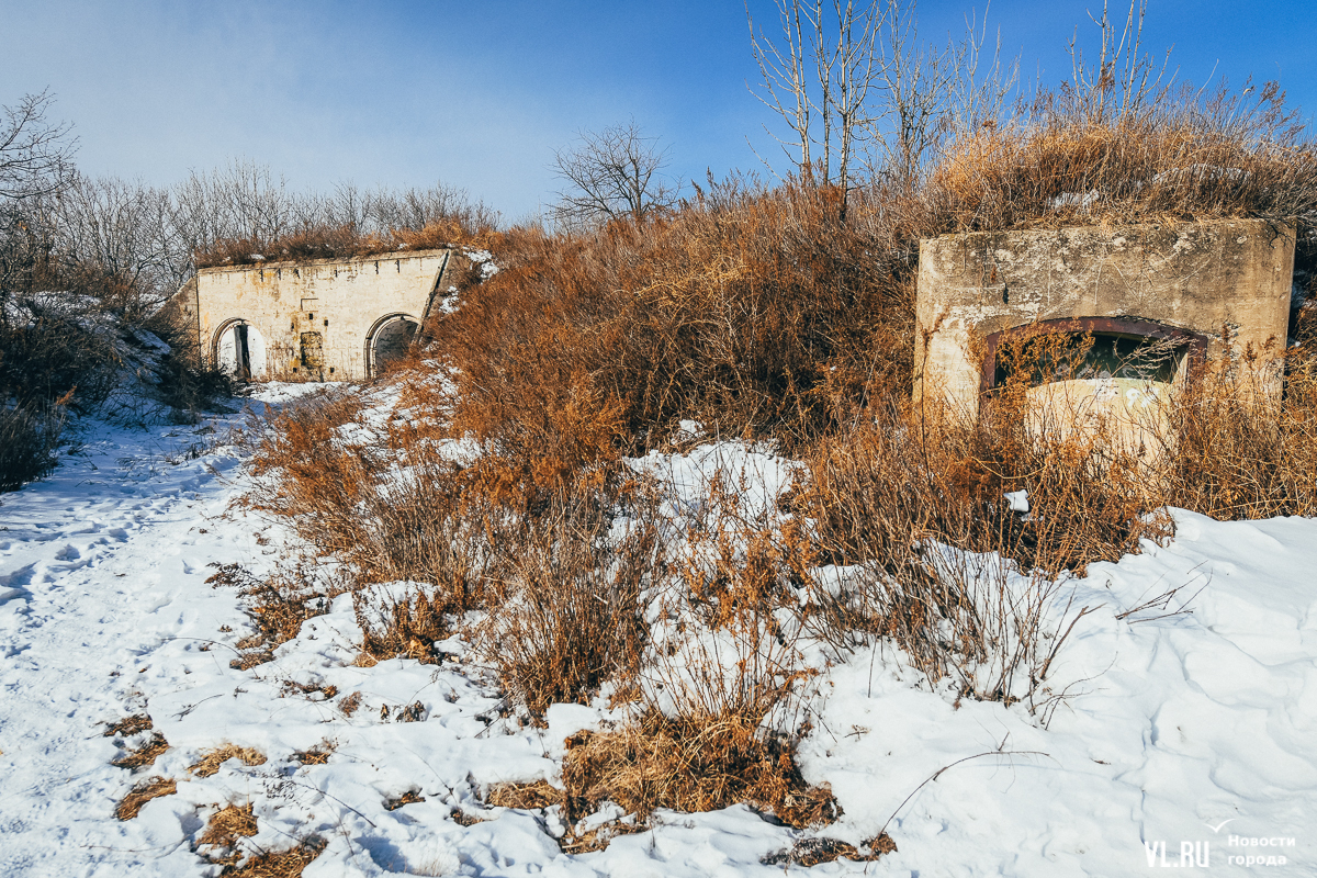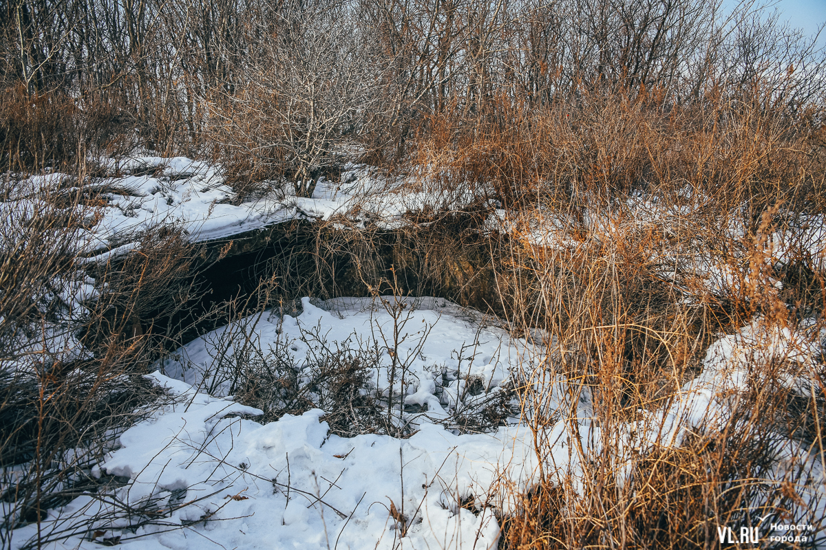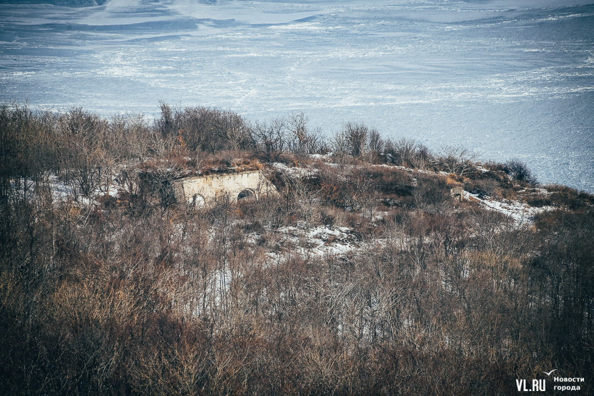 Если вы поедете дальше на автомобиле, то доберётесь до начала лесополосы – и уже здесь придётся оставить своего железного коня. В лес уходит отчётливая тропинка, которая и ведёт на мыс Старицкого. На самом мысе расположен интересный объект Владивостокской крепости – капонир № 452 и остатки 45-мм батареи. Здесь – напротив капонира – можно спуститься вниз к морю по хорошо протоптанной тропинке, но мы всё же советуем пройти немного дальше и полюбоваться на остров Уши с оконечности мыса, а уже потом вернуться к объекту Владивостокской крепости и спускаться.