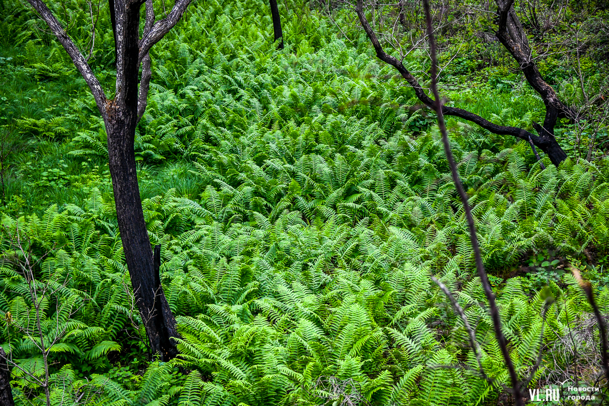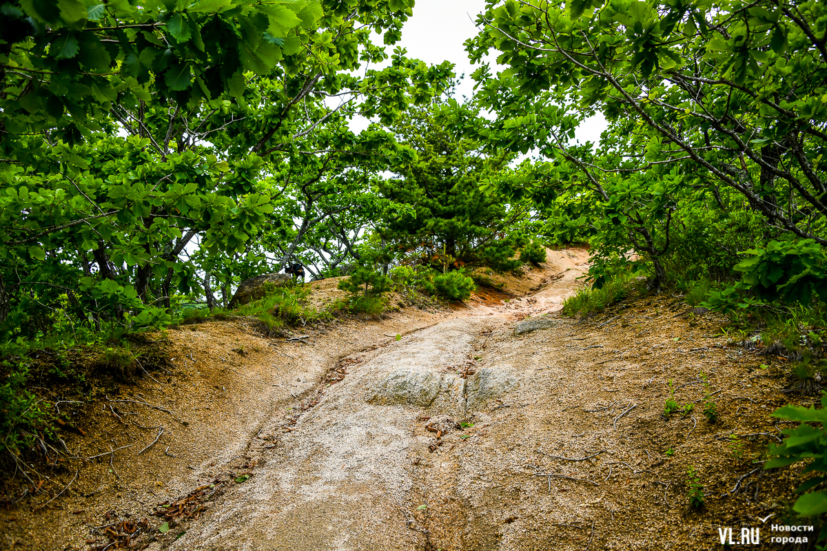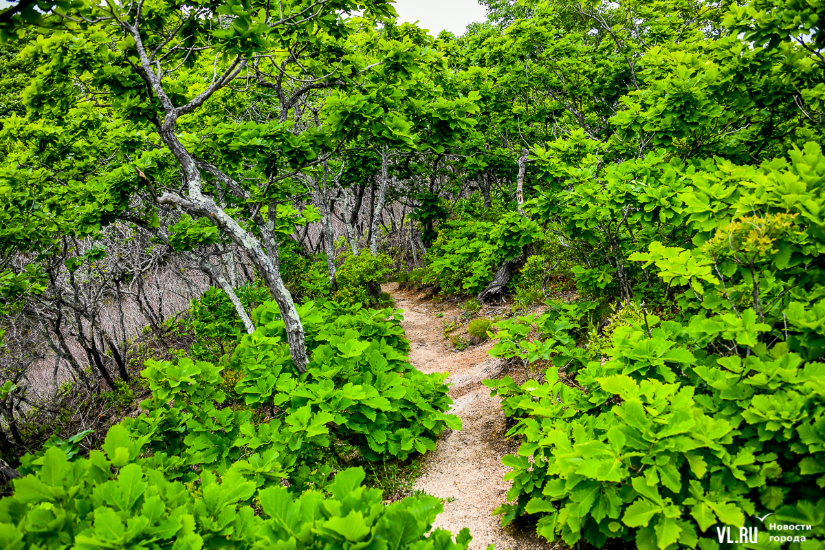 В итоге из-за утомительных подъёмов за 1,5 часа мы прошли только 3 километра, и настало время сворачивать с широкой дороги на узкую лесную тропинку. Этот поворот никак не обозначен, и мы чуть не ушли в сторону бухты Шепалова. Спасло лишь шестое чувство, которое каким-то неведомым образом заставило взглянуть на навигатор и понять, что нужный поворот был пройден несколько минут назад. Оставшиеся 2 километра лесная тропа ведёт нас всё ближе к побережью. Деревья становятся ниже, начинают появляться кустарники. В итоге мы оказываемся перед спуском, с которого открывается невероятный вид на мыс Лисученко.
