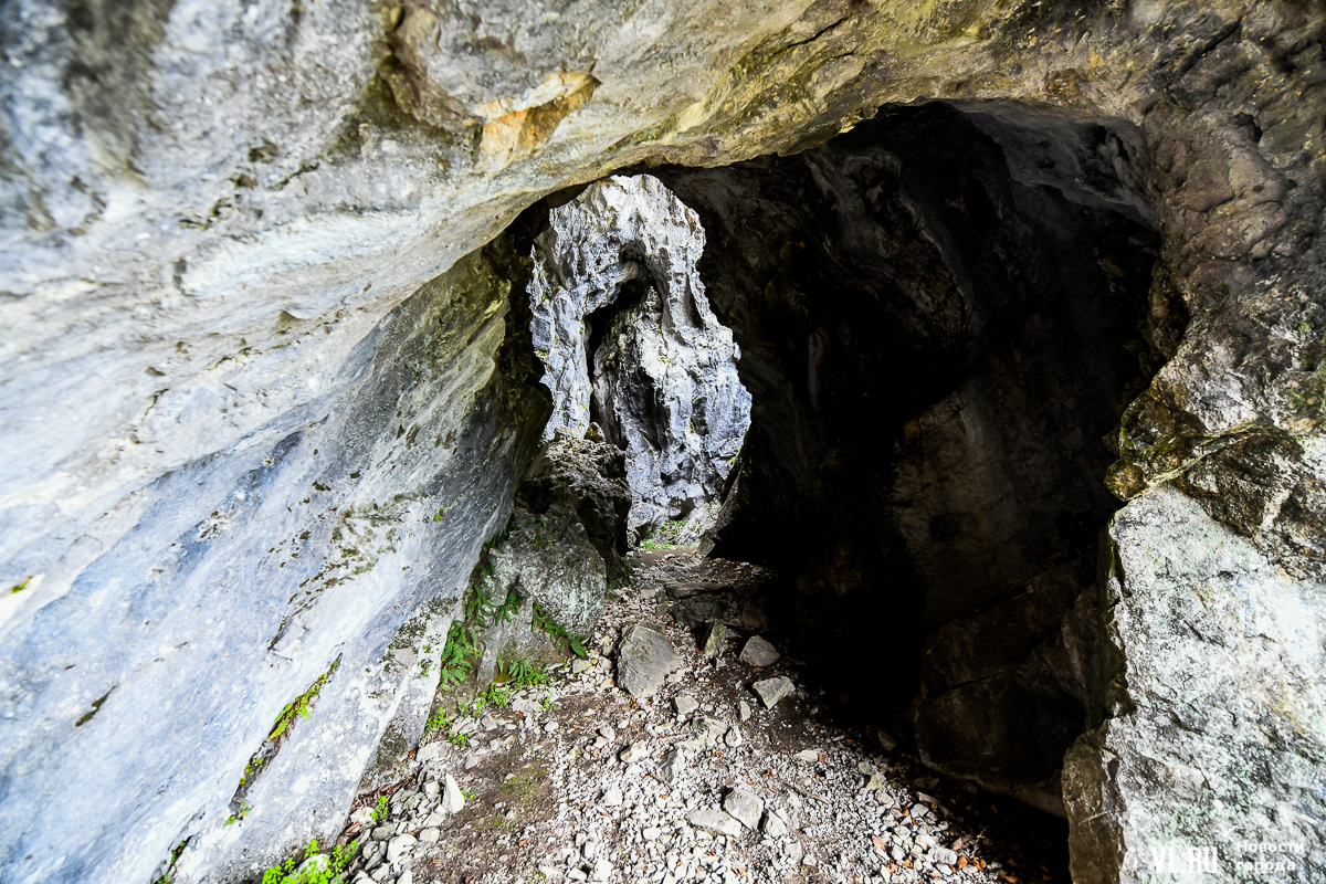 В течение часа мы добрались до небольшой парковки, а вернее – укатанного пятачка не больше чем на две машины, напротив тропы. Отсюда до пещеры оставалось около 150 метров вверх по крутому склону. Поднимались мы не спеша, с передышками – и минут через 20 добрались до Сквозной. У пещеры два входа/выхода, так что через неё можно пройти насквозь – и оказаться на противоположной стороне хребта. Кстати, пересечь её можно даже без фонарика, но тогда есть большая вероятность хорошенько удариться головой о низкий потолок.