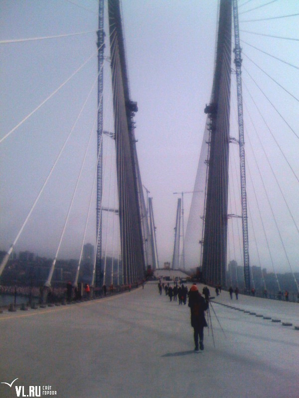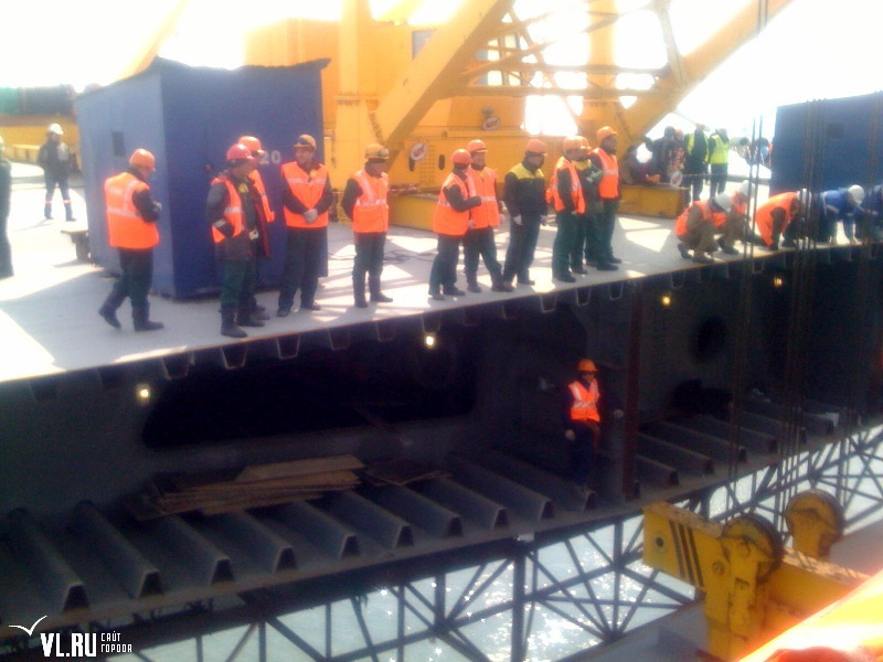 14.55 - рабочие закрепили крюки подъемника на панели. Ориентировочно через час с небольшим "золотое звено" моста поднимется на высоту 64 метра, и мыс Чуркина соединится с центром Владивостока. Длина центрального пролета моста составит 737 метров.