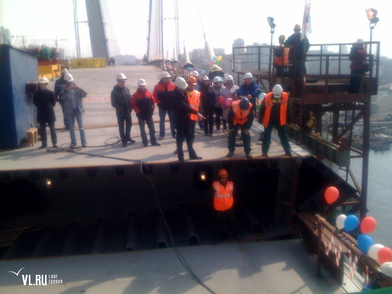 "Строители сфотографировались на память, стоя на замковой панели моста, и приступили к ее подъему", - сообщил с места события корреспондент VL.ru.
