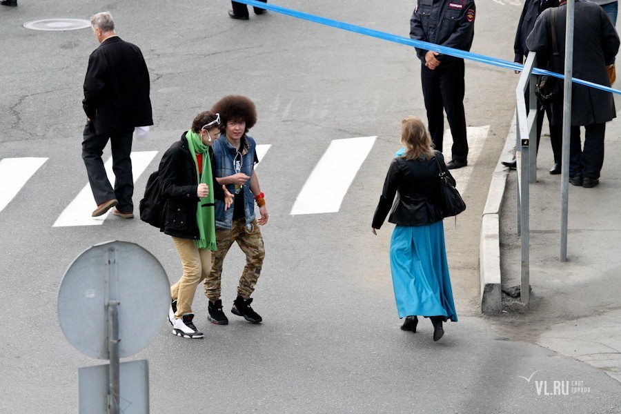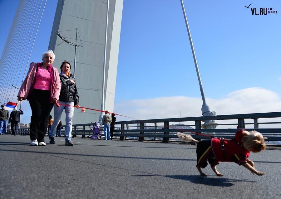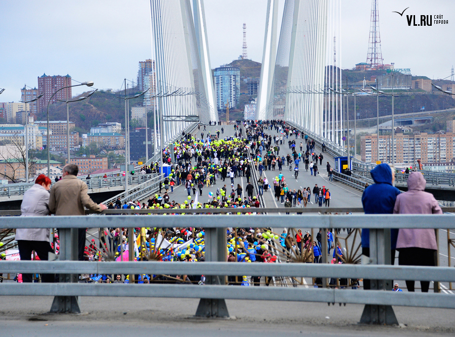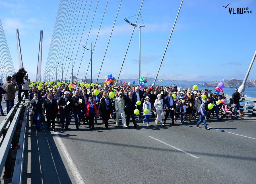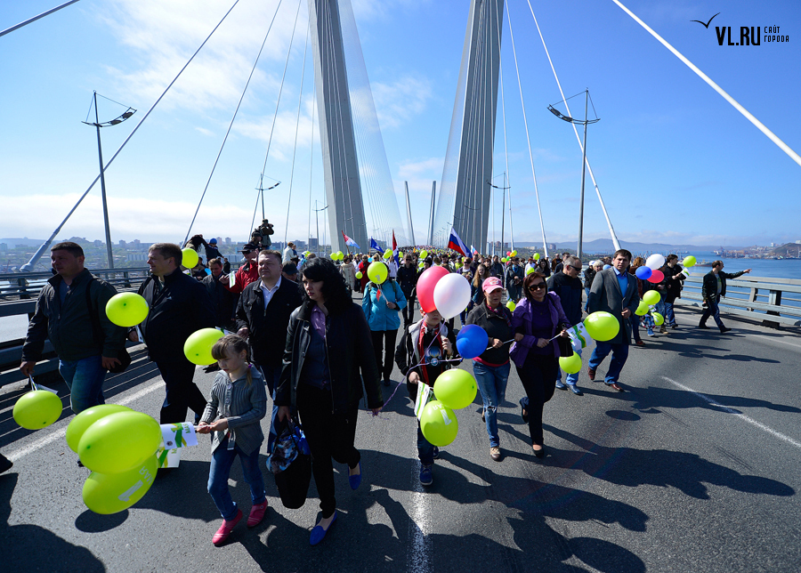 Ровно в 11.00 колонны бодрым шагом двинулись по Золотому мосту в сторону центральной площади. На всем протяжении пути демонстрантов были установлены колонки и громкоговорители, из которых звучала торжественная музыка и воодушевляющие лозунги. Ведущие — на каждом участке свой — прославляли Приморский край, города и районы и отдельные предприятия.