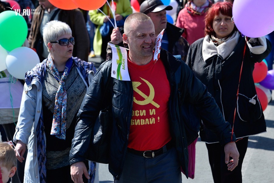 В этом году на первомайскую демонстрацию во Владивосток приехали трудящиеся со всего Приморского края — в шествии приняли участие жители Уссурийска, Артема, Находки, Лесозаводска. Большого Камня, Арсеньева и других городов и весей.