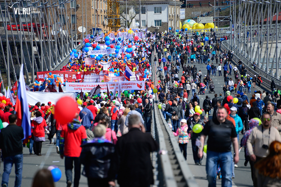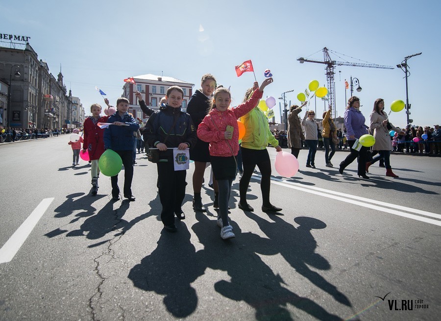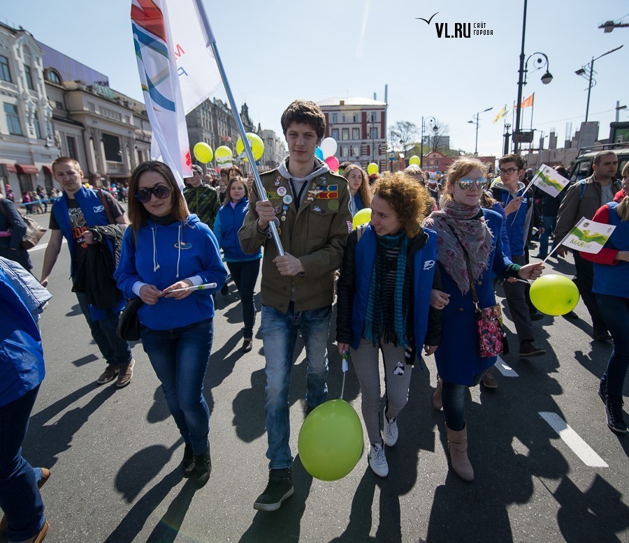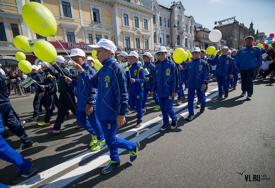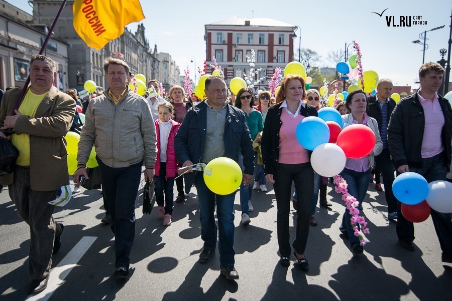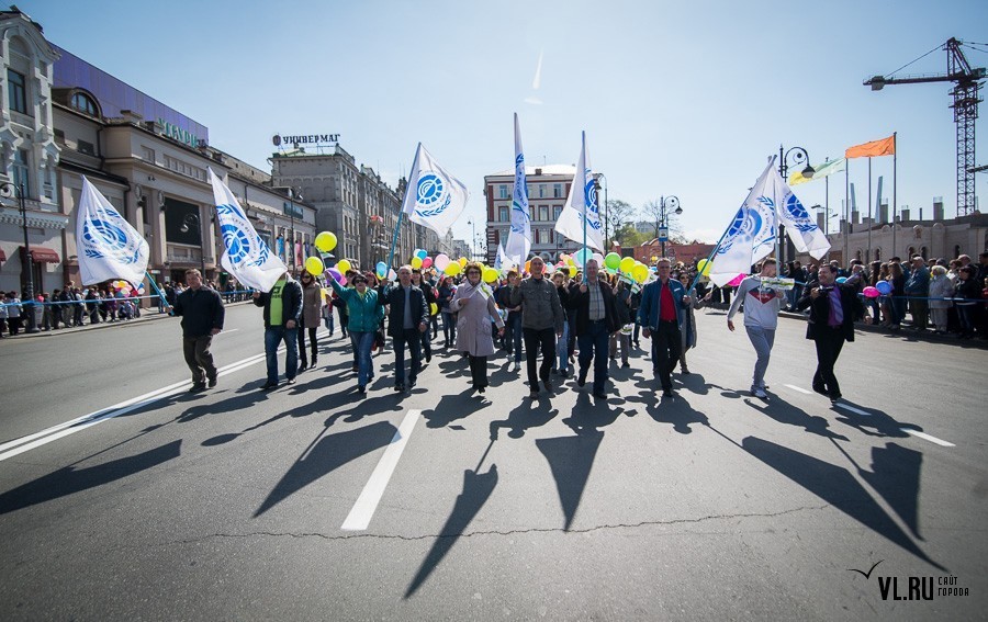 Традиционно Первомай объединил в колонны государственные и частные предприятия и организации: работников здравоохранения, образования и культуры, судостроителей и судоремонтников, портовиков, энергетиков и тепловиков, спортсменов, представителей профсоюзов, предприятия частного сектора и многих-многих других. В том числе, конечно, в демонстрации приняли участие главы городской и краевой администраций, первые лица Думы Владивостока и ЗакСобрания Приморского края. К слову, на этот раз чиновники и депутаты уступили первое место в колонне подрастающему поколению — шествие возглавили мальчишки из спортивного клуба команды «Луч-Энергия».