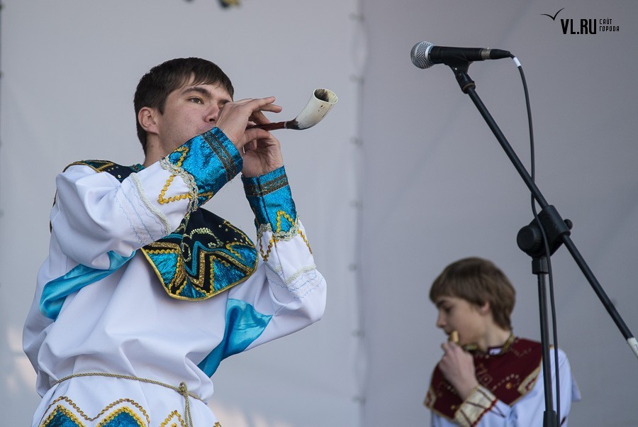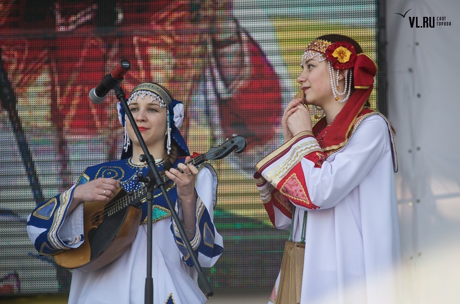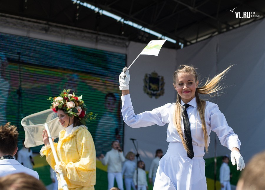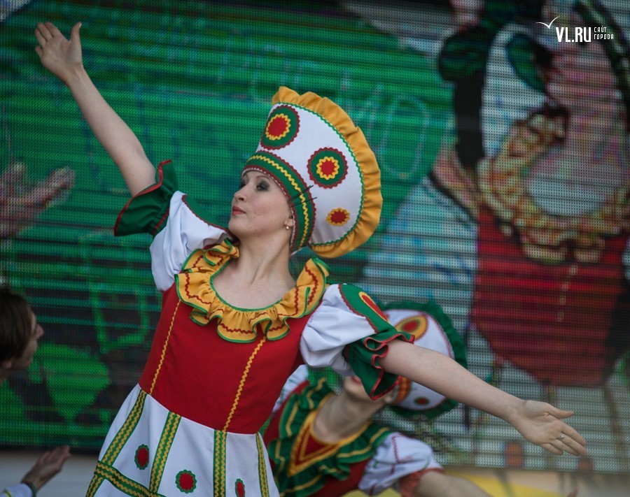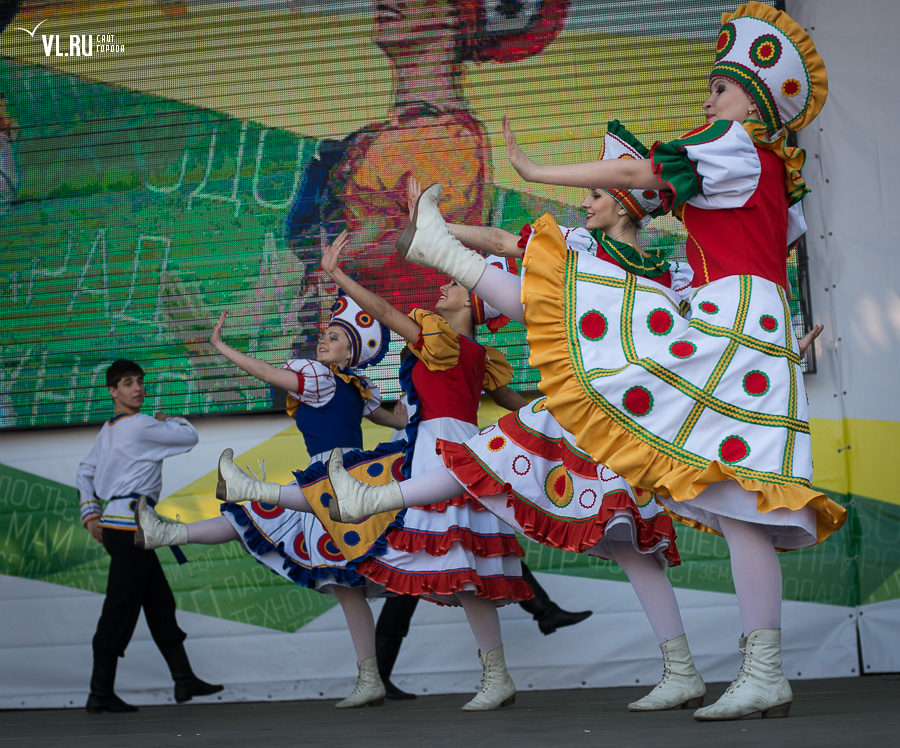 Концерт в честь Дня солидарности трудящихся прошел во Владивостоке сразу после первомайского парада. Около двух часов на сцене пели и плясали творческие коллективы, а возле сцены развлекались горожане.