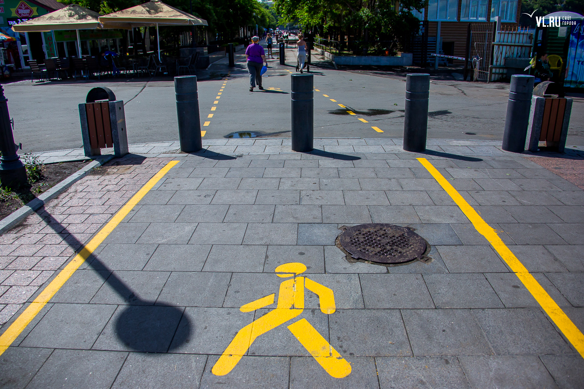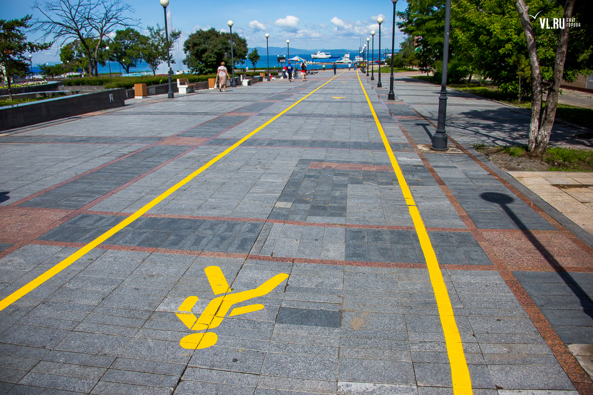 Желтая разметка и обозначение пешеходной дорожки появились на тротуарах в центре Владивостока. Разметка на улицах 1-й Морской, Пограничной и на Спортивной набережной обозначает путь, по которому проходит «Берег здоровья».