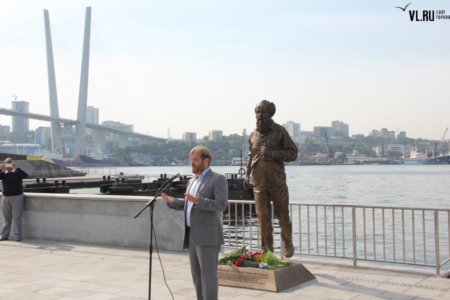 «На месте, где был открыт Владивосток, в этом знаковом месте для нашего города, мы сегодня имеем возможность открыть для себя великого человека, писателя и гражданина своей страны, человека очень владивостокского по духу. Человека безумной силы, харизмы, возможностей и знаний. Человека, который, в общем-то, совершил определенный переворот в литературе, получив Нобелевскую премию всего лишь через 8 лет после издания своей первой книги, что на тот момент было действительно нонсенсом», – рассказал Сергей Соловьев.