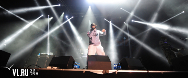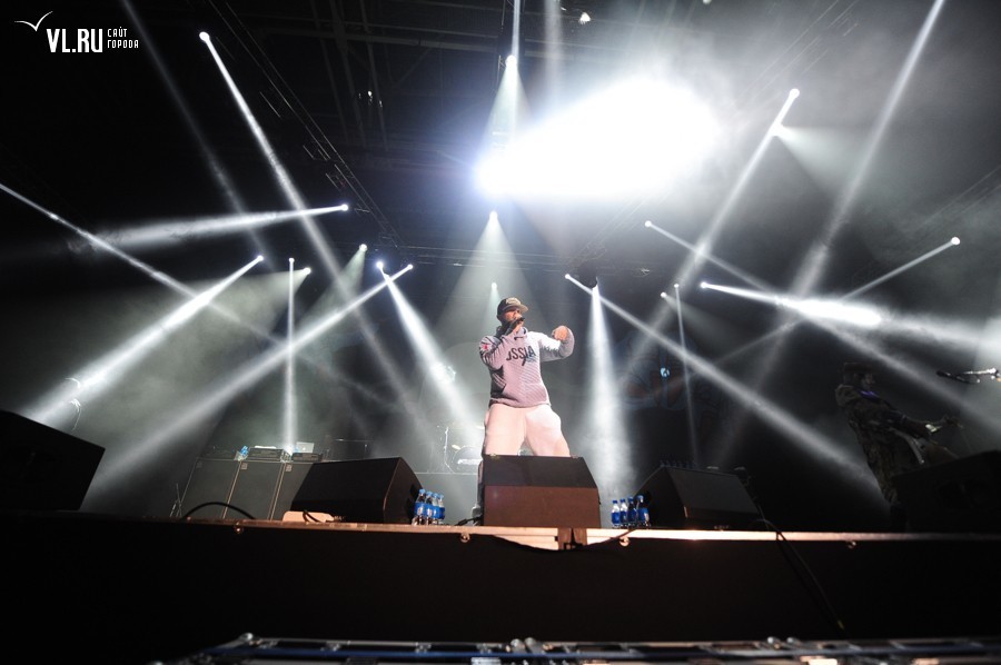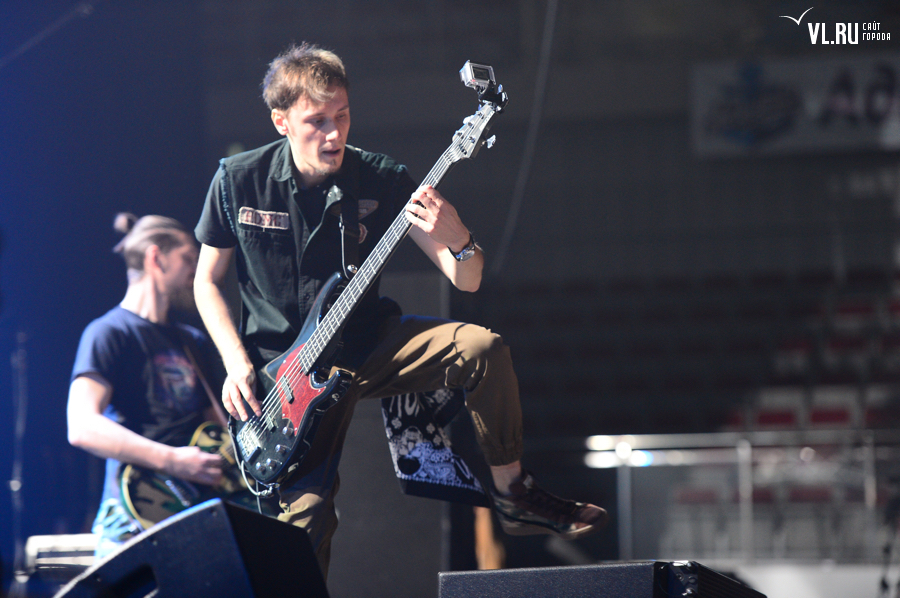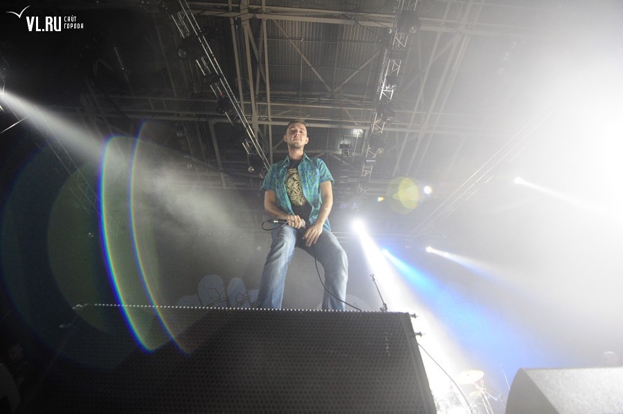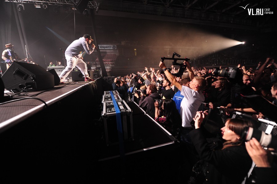 21.00: А вот и полная темнота. А вот музыканты на сцене! 21.00 на часах "Фетисов Арены". Концерт начинается без задержек. Фред в белых штанах, серой кофте с надписью Russia и, конечно, своей фирменной кепке. Приветствует зал. Предлагает владивостокцам попрыгать.