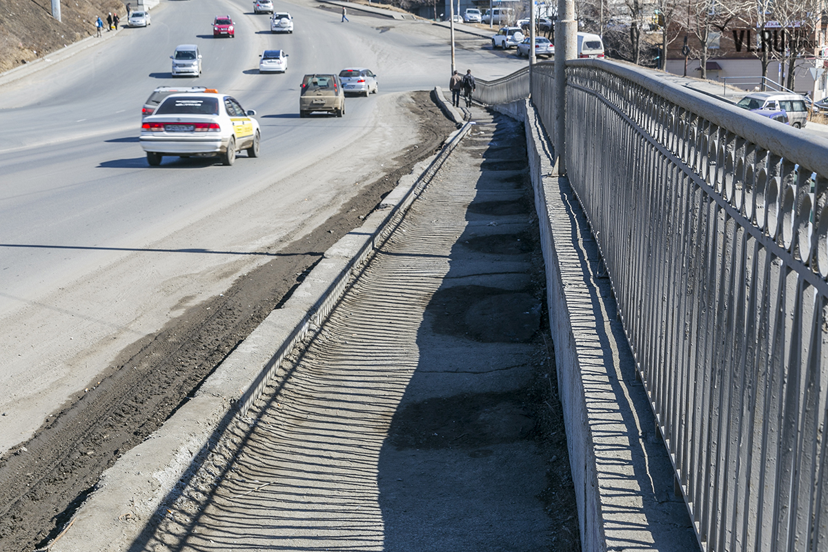 Мост в районе улицы Героев-Тихоокеанцев за пару лет не претерпел вообще никаких изменений. Здесь по-прежнему по дороге бегают отчаянные пешеходы, нет надземных переходов, а автомобилисты по-прежнему подскакивают на стыках. На самом мостике то и дело образуются довольно подлые ямы. Снизу конструкция выглядит добротной и вряд ли попросит в ближайшее время капитального ремонта.