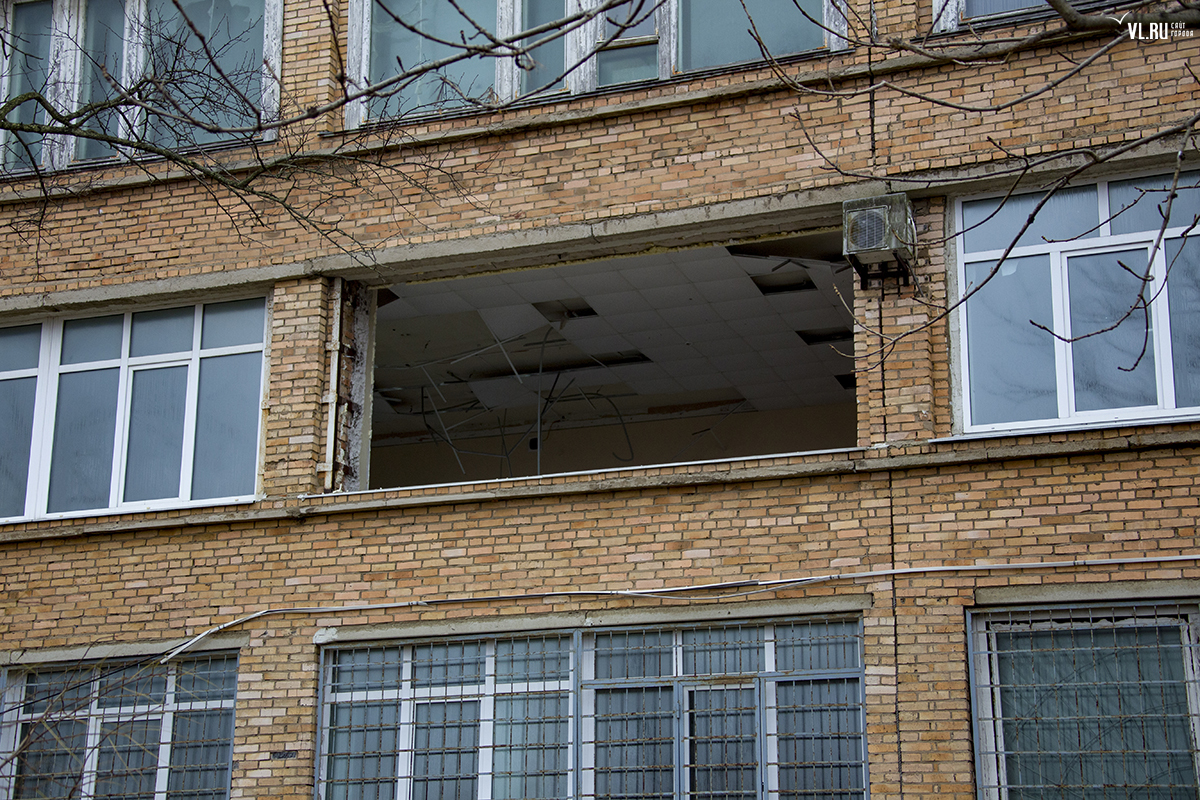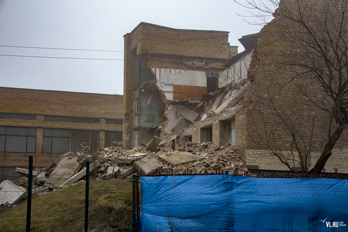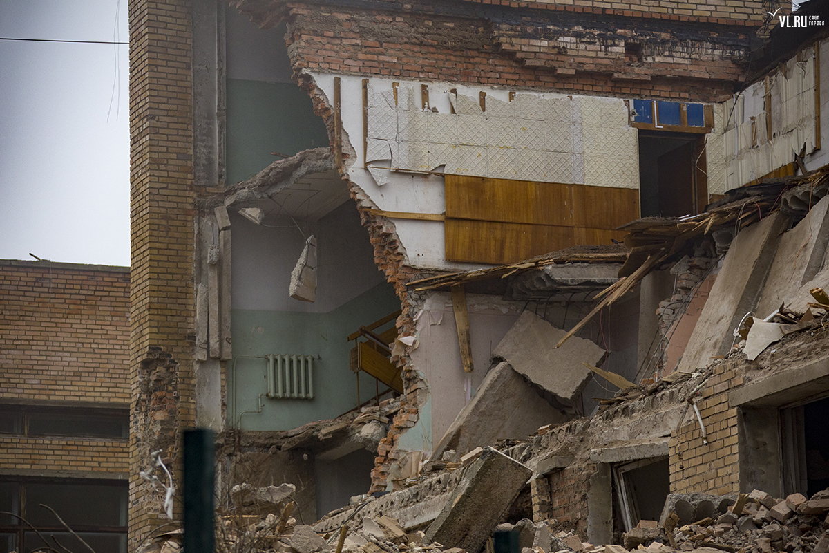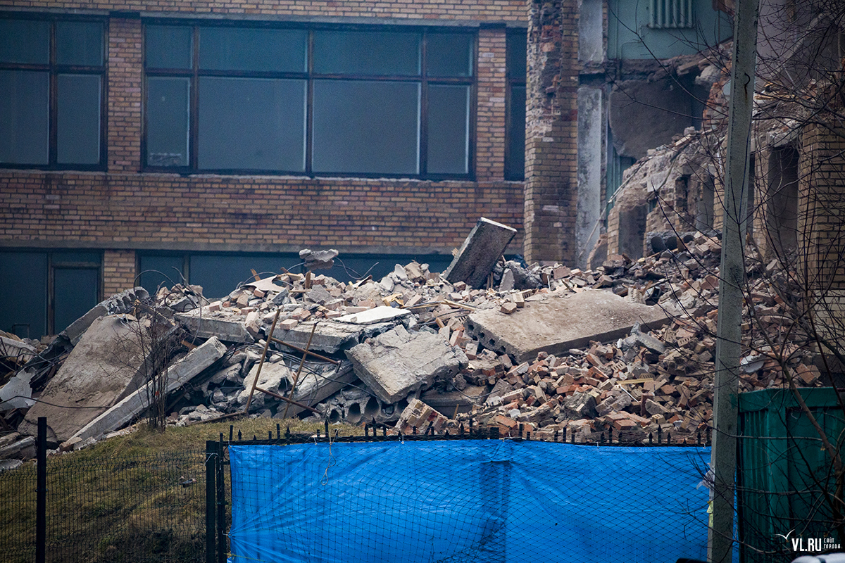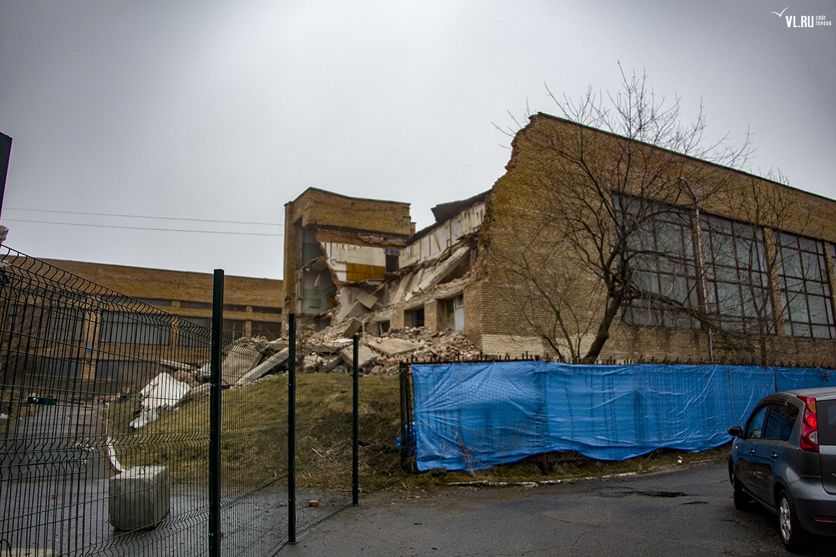 Бывший корпус ДВГТУ на Аксаковской начали сносить. Первым под снос попал кирпичный корпус № 3а. Часть его уже разрушена, в другой части пока снимают электрику и выносят стеклопакеты. На время строительных работ закрытой окажется и главная видовая площадка.