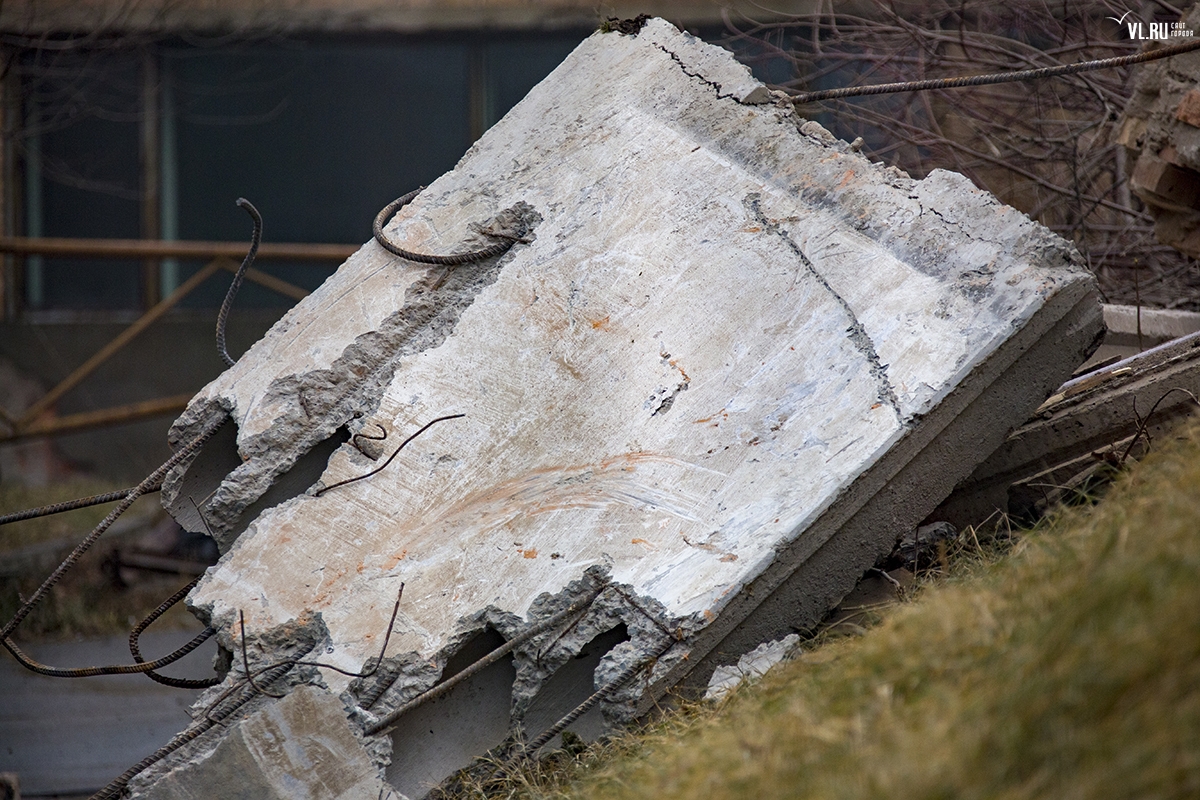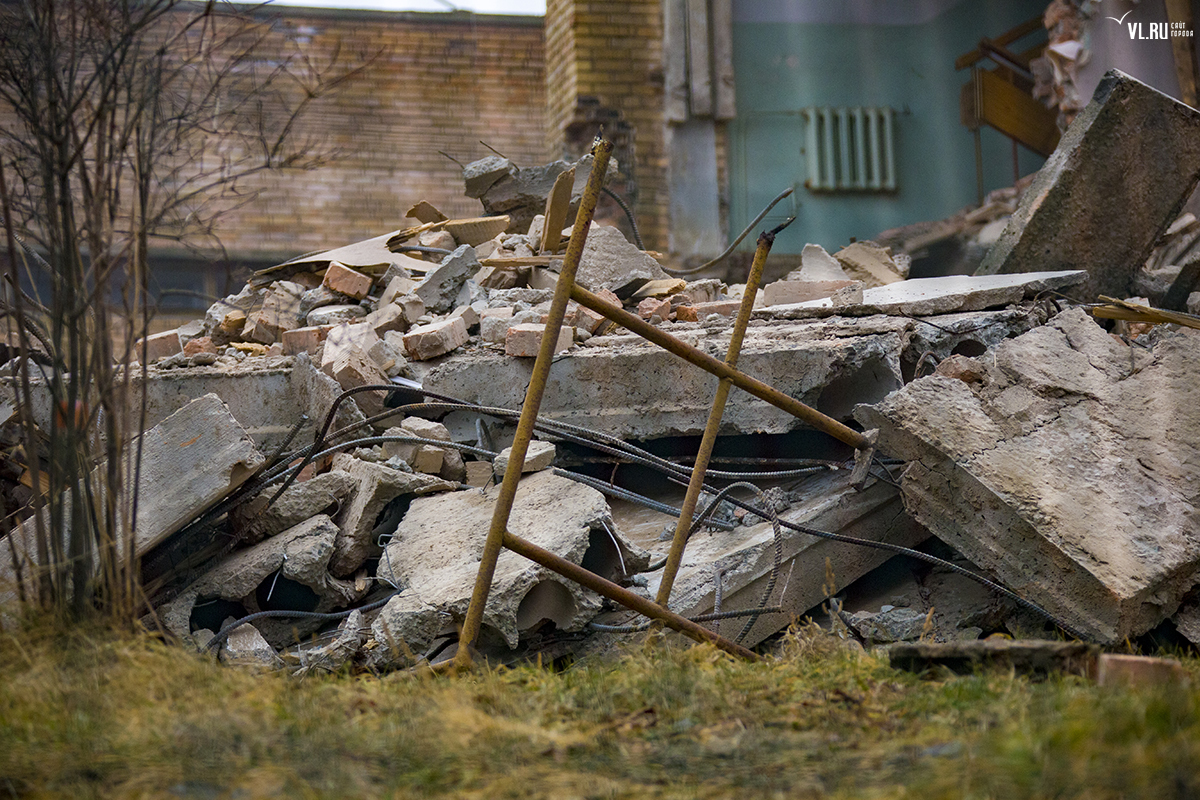 Для организации стройплощадки будущего музейно-театрального комплекса во Владивостоке начали сносить бывшие корпуса ДВГТУ на Аксаковской. Рабочие демонтировали часть одного из зданий.
