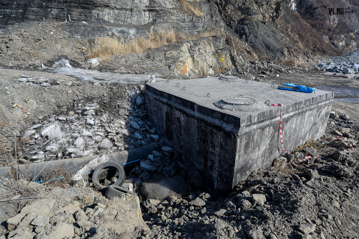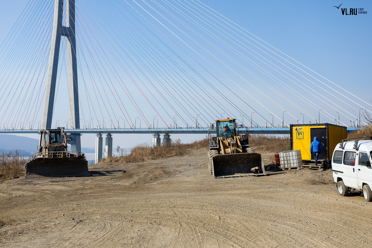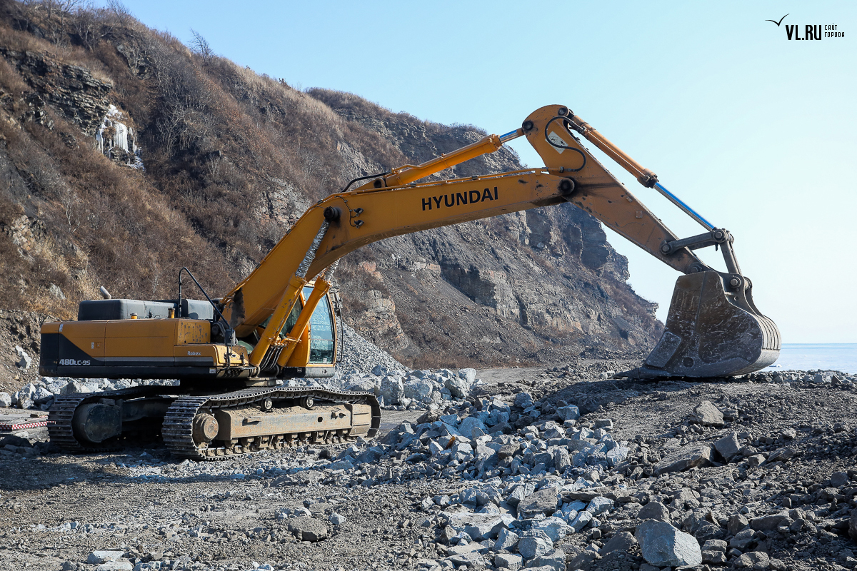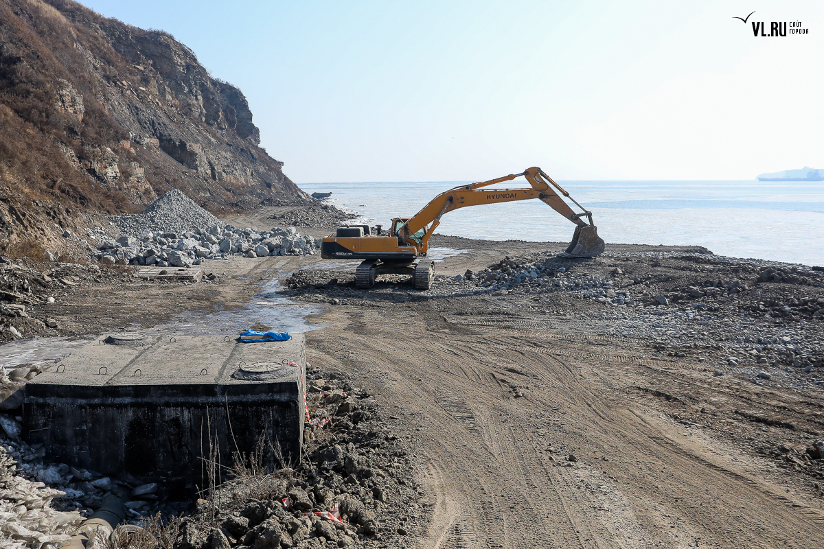 Корреспонденты VL.ru проверили информацию о перекрытии видовой площадки. Рабочие на месте отказались называть компанию-субподрядчика, но объяснили, что трудятся здесь с новогодних каникул – укрепляют береговую линию. Сюда на самосвалах привозят скальный грунт и сваливают его у берега, возле участка с водоводом, который строили с 2011 года.