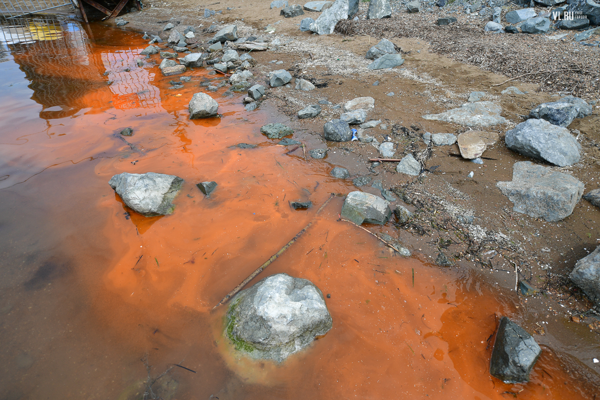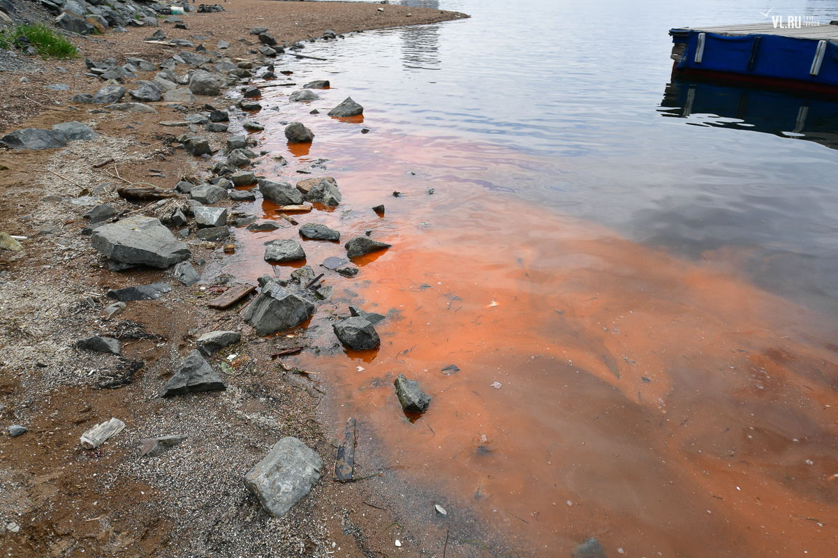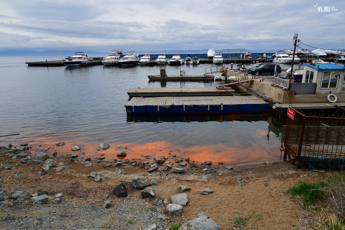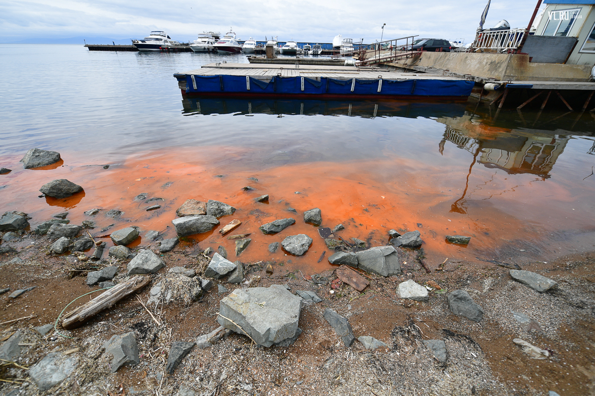 Из-за цветения ночесветки вода в бухте Федорова у яхт клуба «Семь футов» приобрела ярко-оранжевый оттенок. Цветная полоса тянется вдоль побережья.