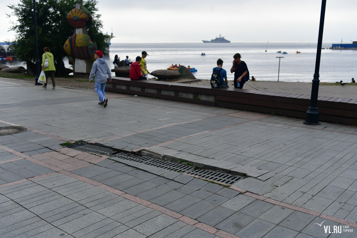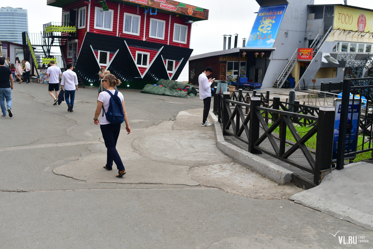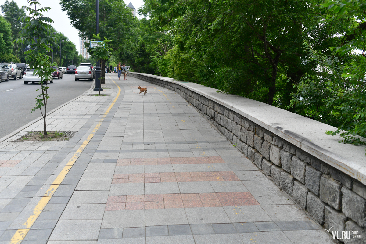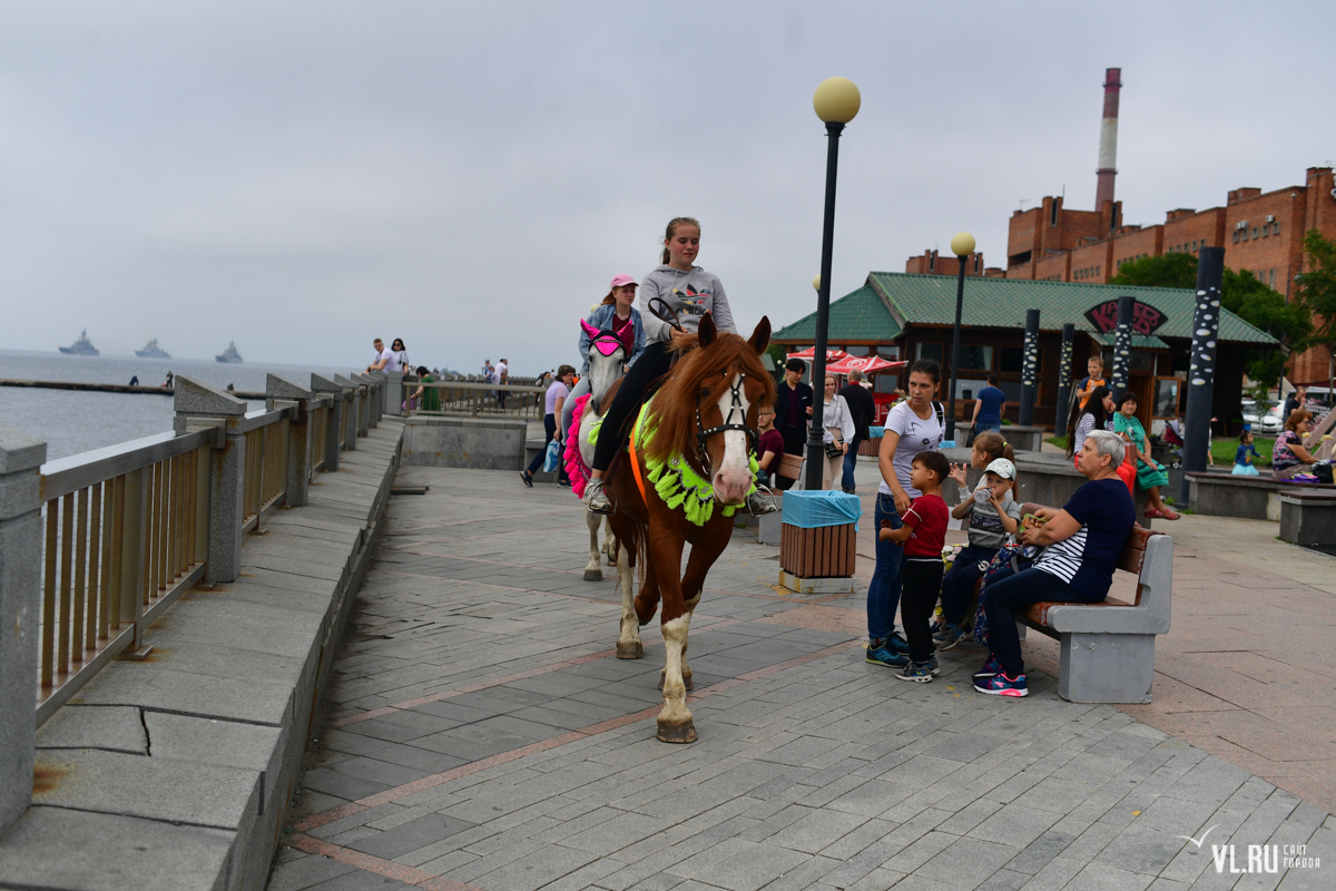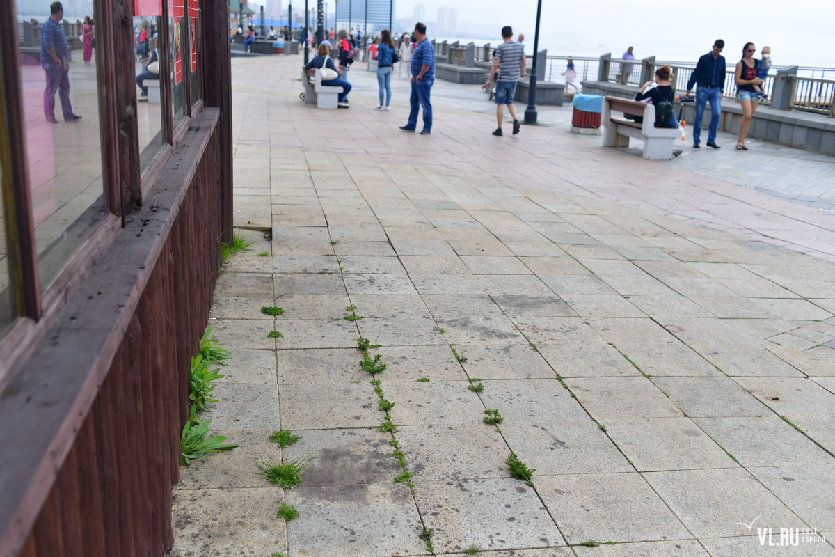 Двигаясь прямо вдоль моря, рекомендуем поглядывать под ноги – во многих местах плитка уложена, мягко говоря, довольно криво, легко споткнуться. Но постоянно смотреть в землю тоже вряд ли захочется – хорошо видно, что плиты уже много лет не мыли - отсюда пыль, грязь, масляные пятна от уличных ресторанов и торговцев. Поневоле вспоминаешь, что в Японии и Корее дороги и общественные пространства регулярно моют специальным шампунем. Зато у нас в солнечный день нередко можно встретить незаконных предпринимателей, катающих на лошадях всех желающих. Несмотря на многократные обещания и угрозы администрации Владивостока убрать животных, бизнесмены по-прежнему на старых местах.