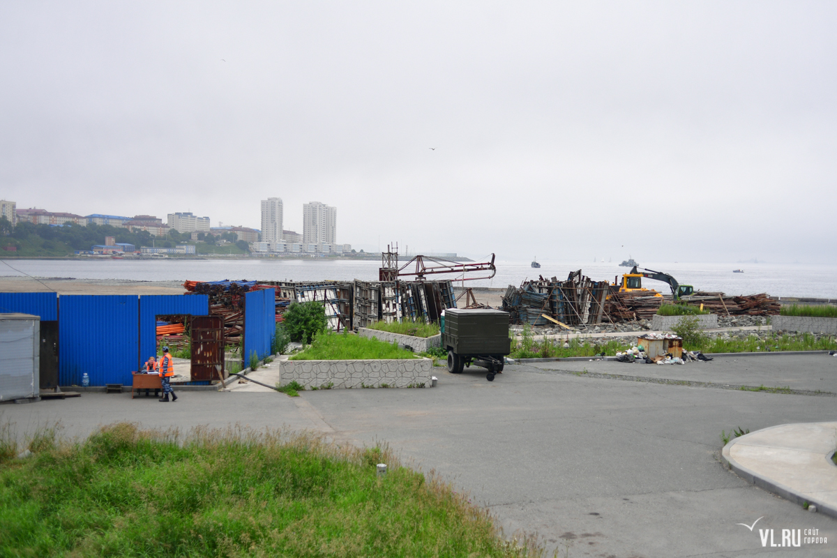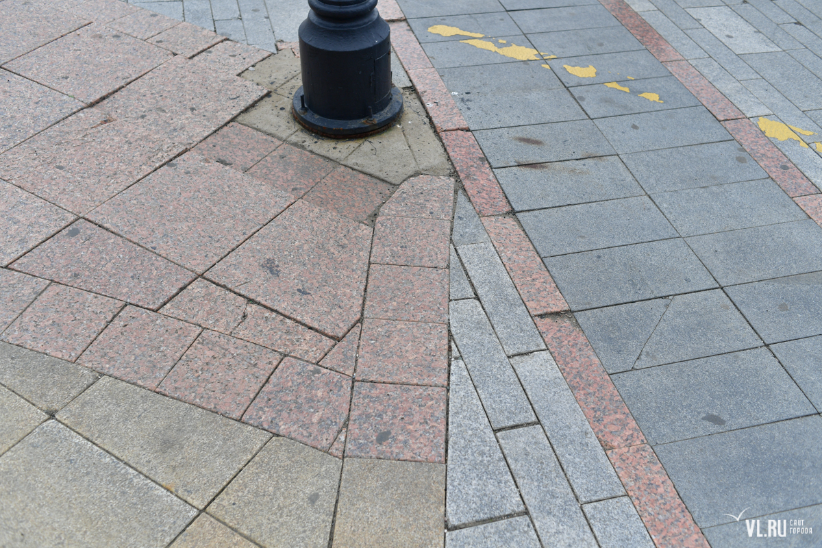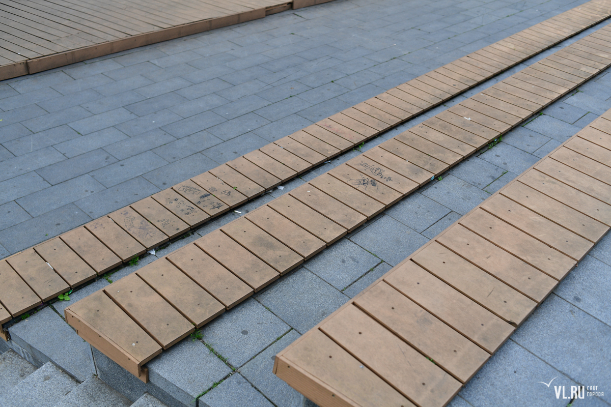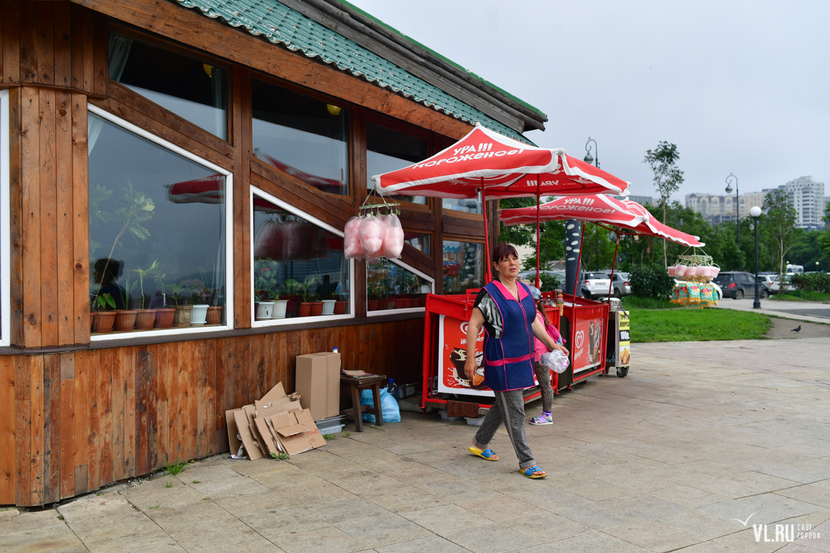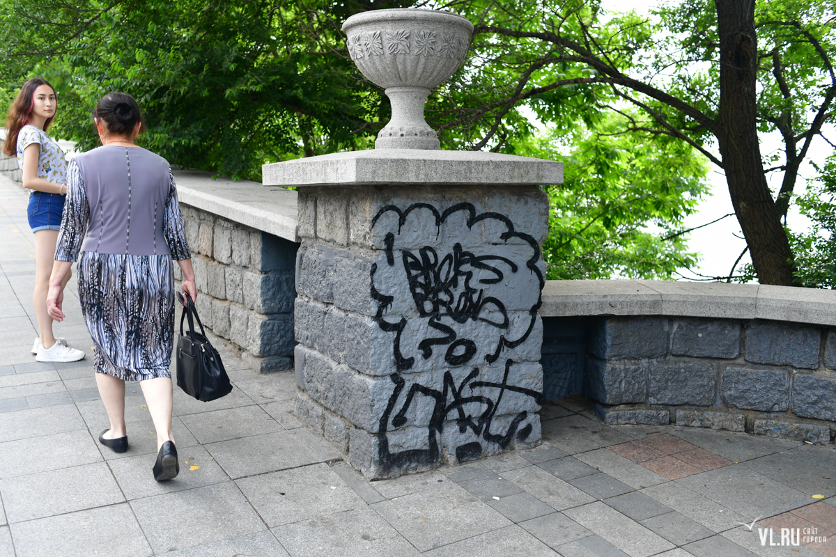 Двигаясь прямо вдоль моря, рекомендуем поглядывать под ноги – во многих местах плитка уложена, мягко говоря, довольно криво, легко споткнуться. Но постоянно смотреть в землю тоже вряд ли захочется – хорошо видно, что плиты уже много лет не мыли - отсюда пыль, грязь, масляные пятна от уличных ресторанов и торговцев. Поневоле вспоминаешь, что в Японии и Корее дороги и общественные пространства регулярно моют специальным шампунем. Зато у нас в солнечный день нередко можно встретить незаконных предпринимателей, катающих на лошадях всех желающих. Несмотря на многократные обещания и угрозы администрации Владивостока убрать животных, бизнесмены по-прежнему на старых местах.
