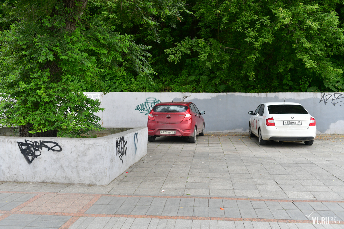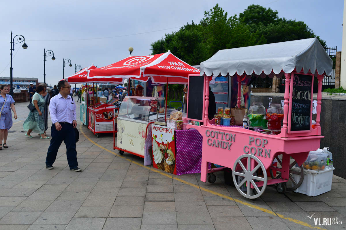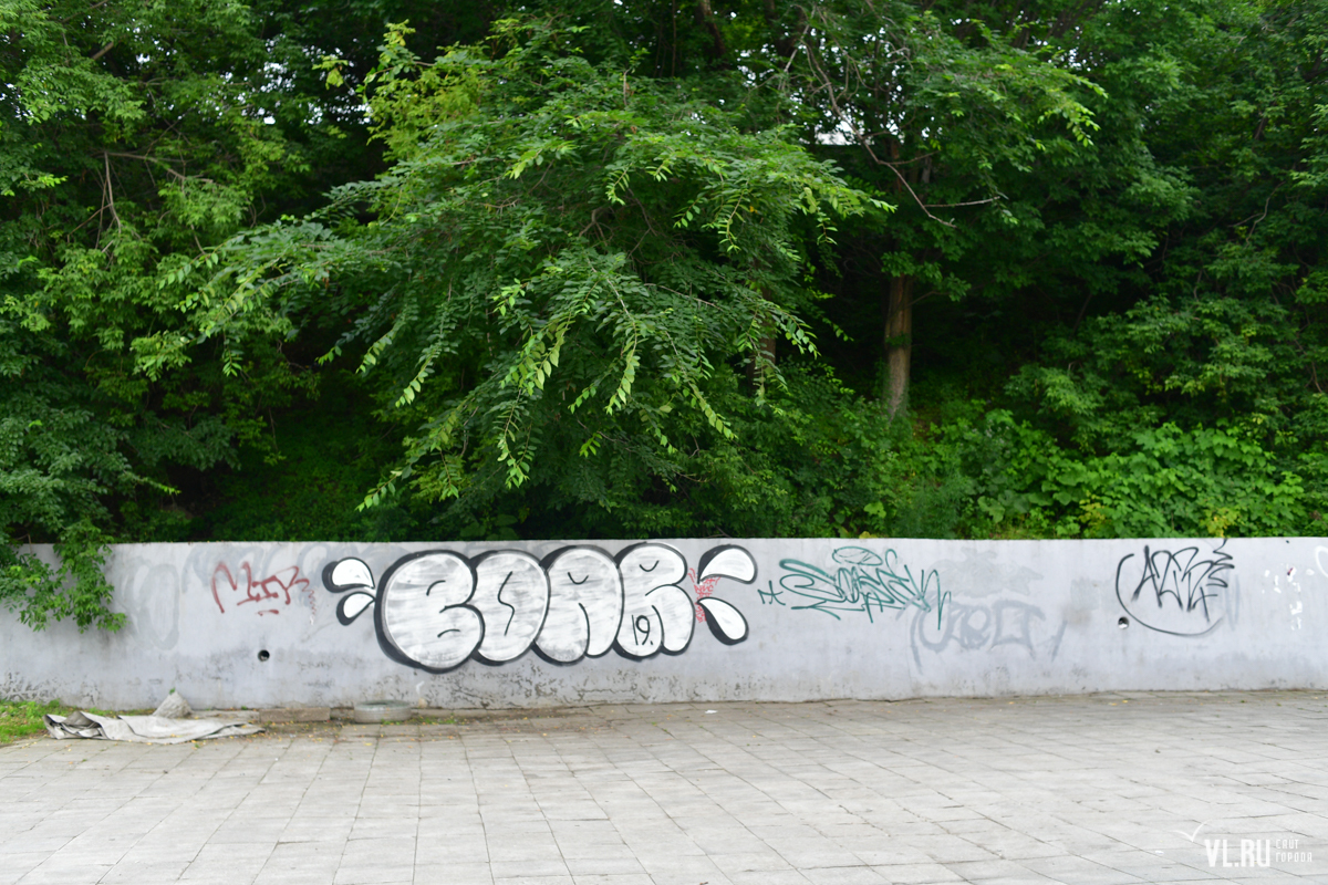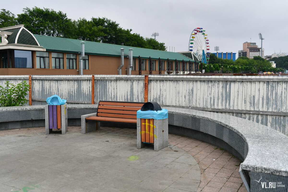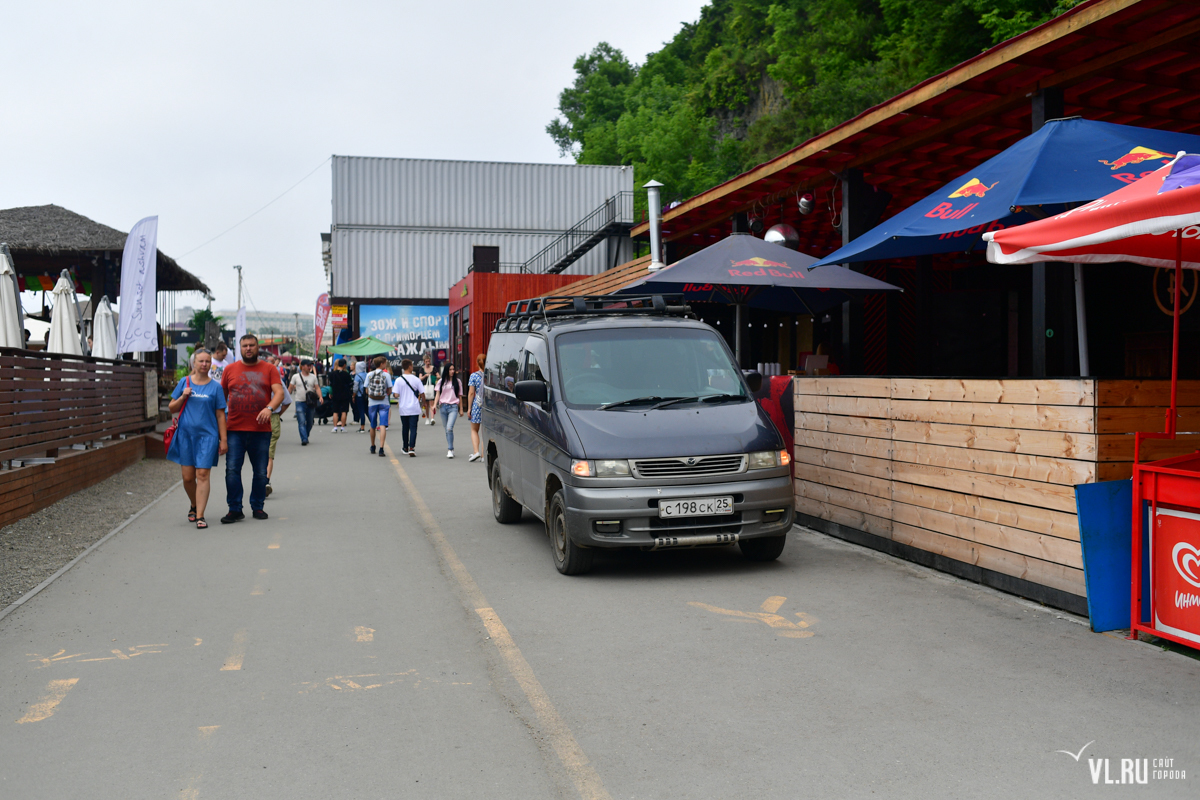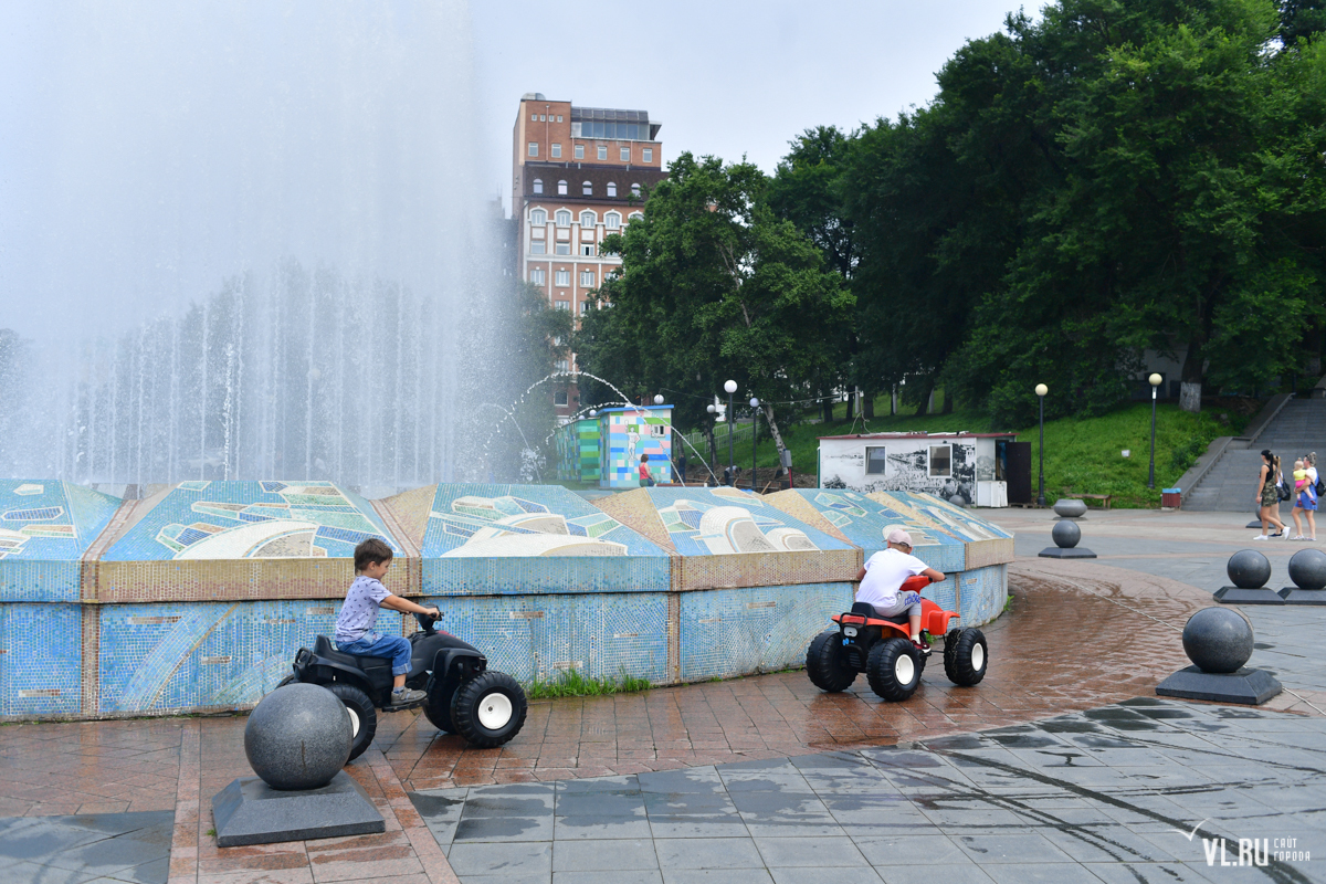 Двигаясь прямо вдоль моря, рекомендуем поглядывать под ноги – во многих местах плитка уложена, мягко говоря, довольно криво, легко споткнуться. Но постоянно смотреть в землю тоже вряд ли захочется – хорошо видно, что плиты уже много лет не мыли - отсюда пыль, грязь, масляные пятна от уличных ресторанов и торговцев. Поневоле вспоминаешь, что в Японии и Корее дороги и общественные пространства регулярно моют специальным шампунем. Зато у нас в солнечный день нередко можно встретить незаконных предпринимателей, катающих на лошадях всех желающих. Несмотря на многократные обещания и угрозы администрации Владивостока убрать животных, бизнесмены по-прежнему на старых местах.