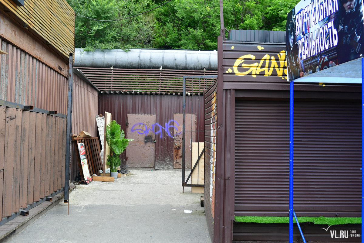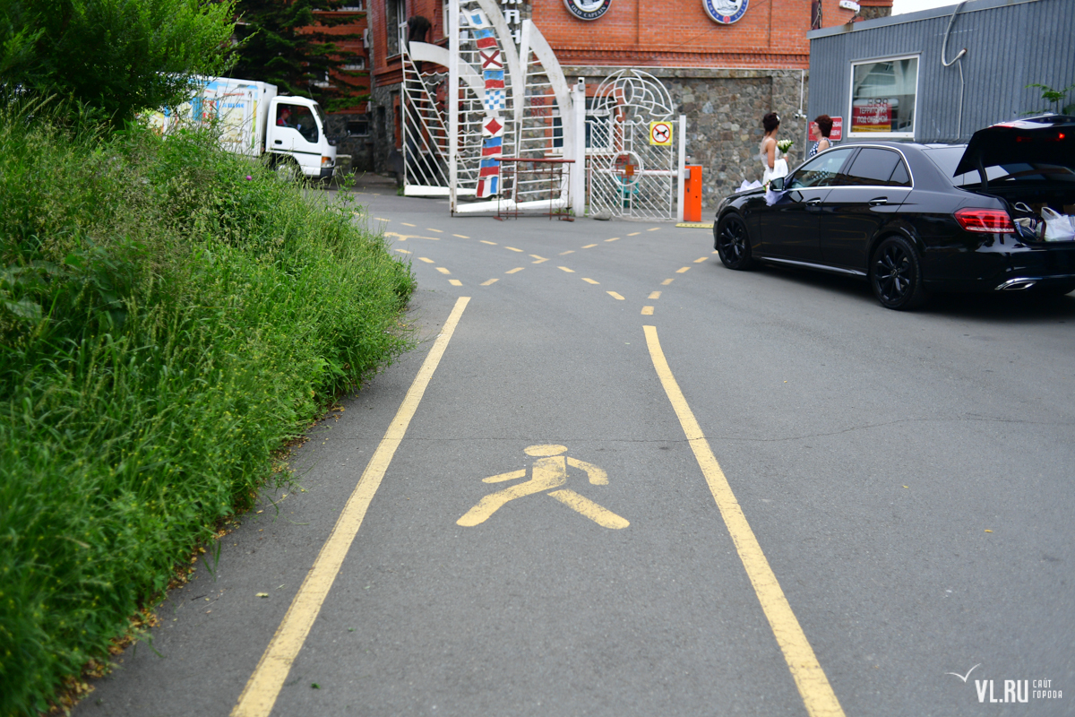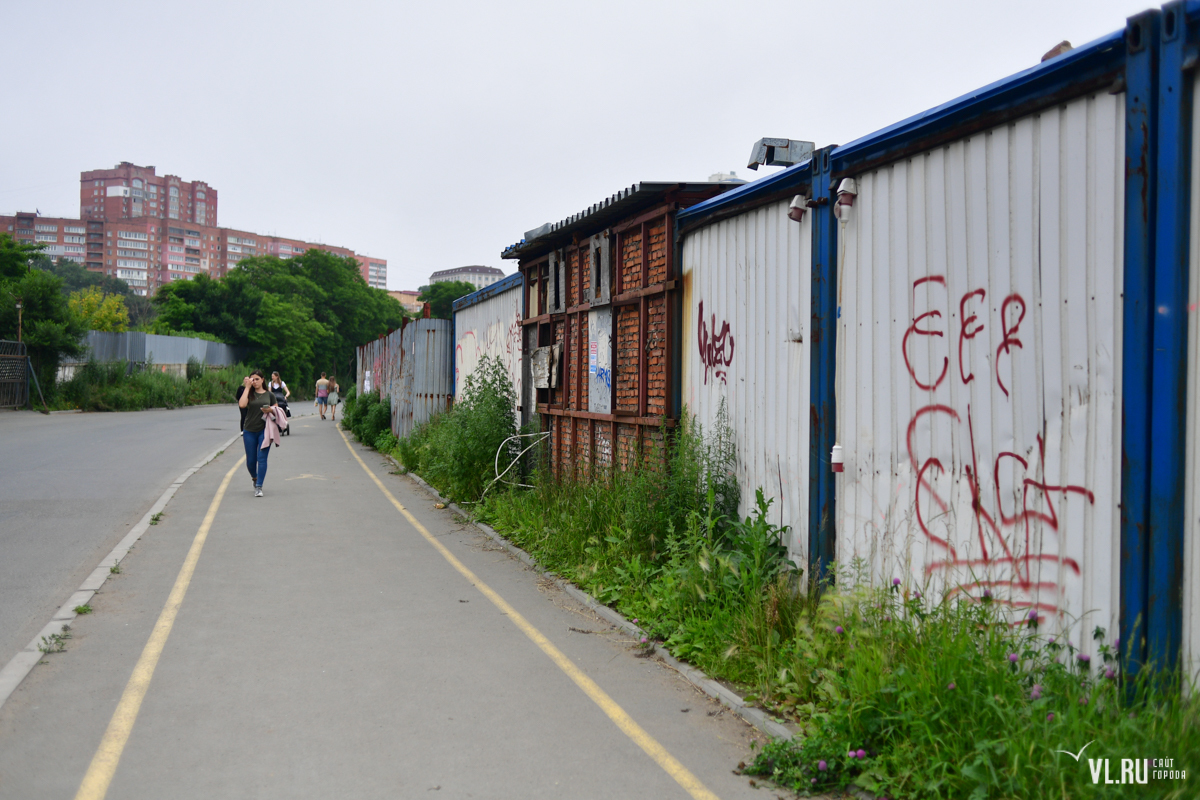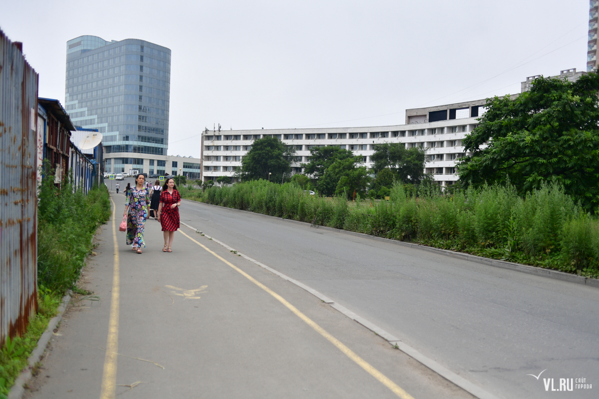 Вплоть до клуба «Семь футов» смотреть на этом участке особо нечего: с правой стороны бетонный забор, с левой – заросшая травой территория около гостиницы «Амурский залив». При этом попасть туда непросто – тротуара нет, не предусмотрены к гостинице и пешеходные переходы. Так что идем вдоль дороги дальше.