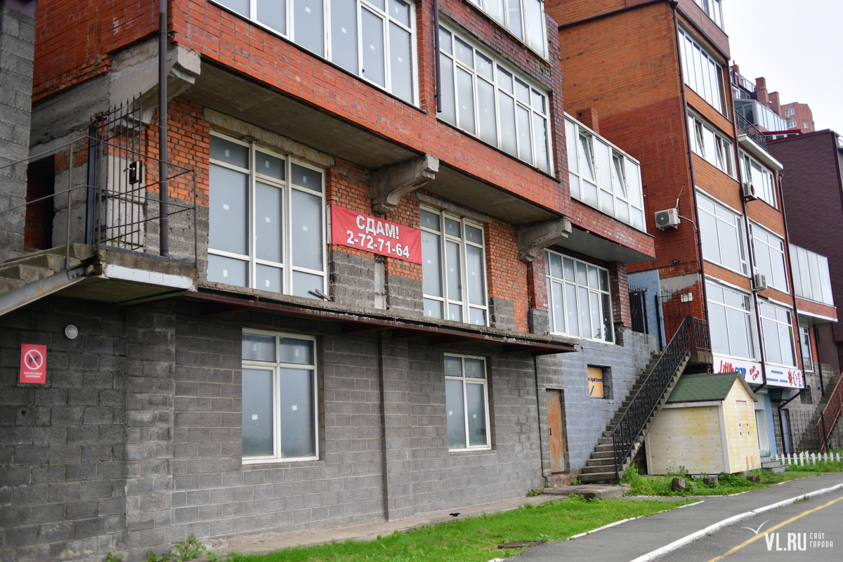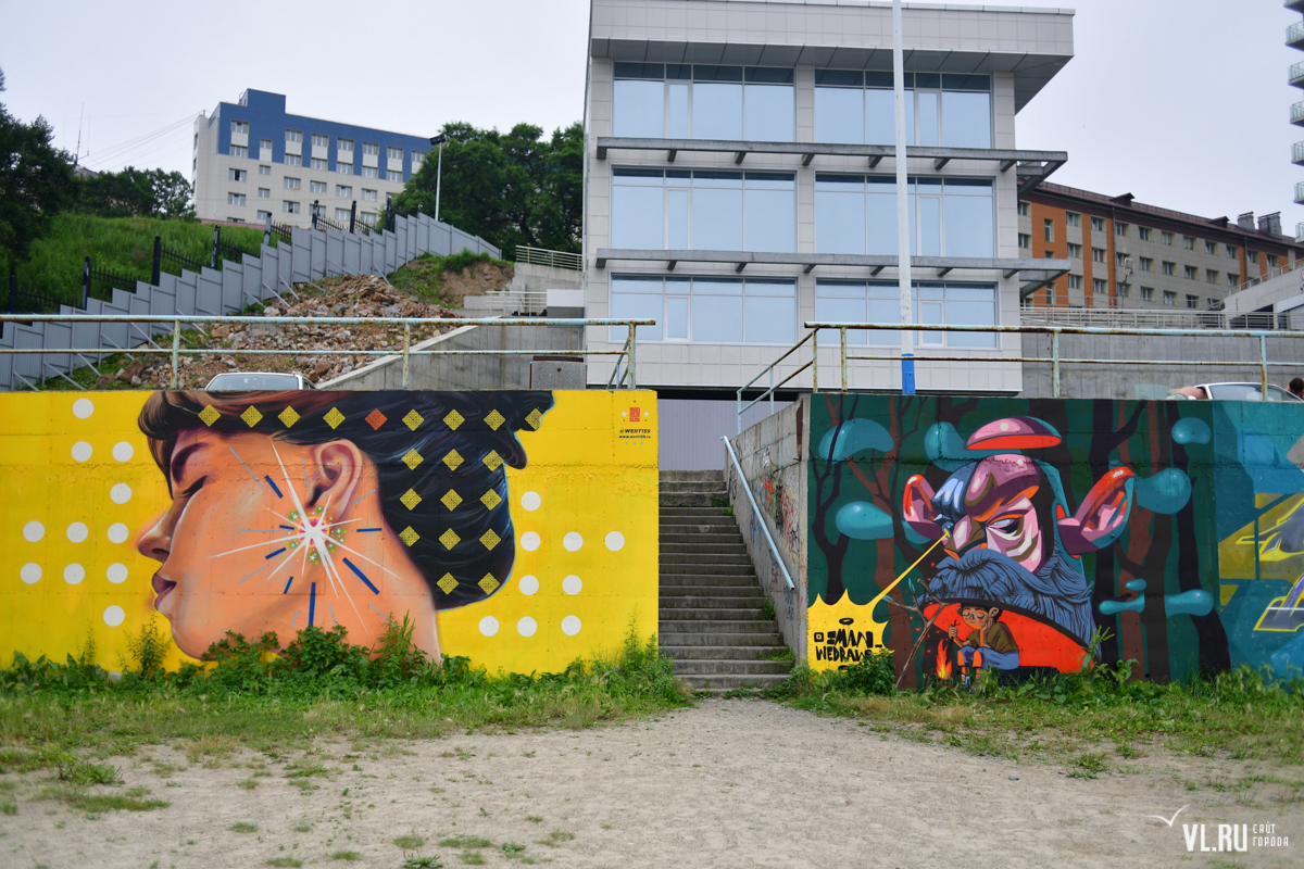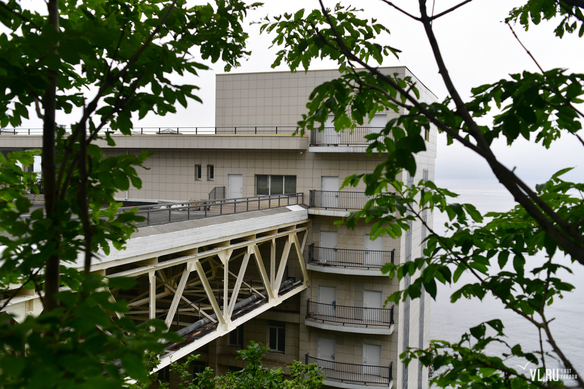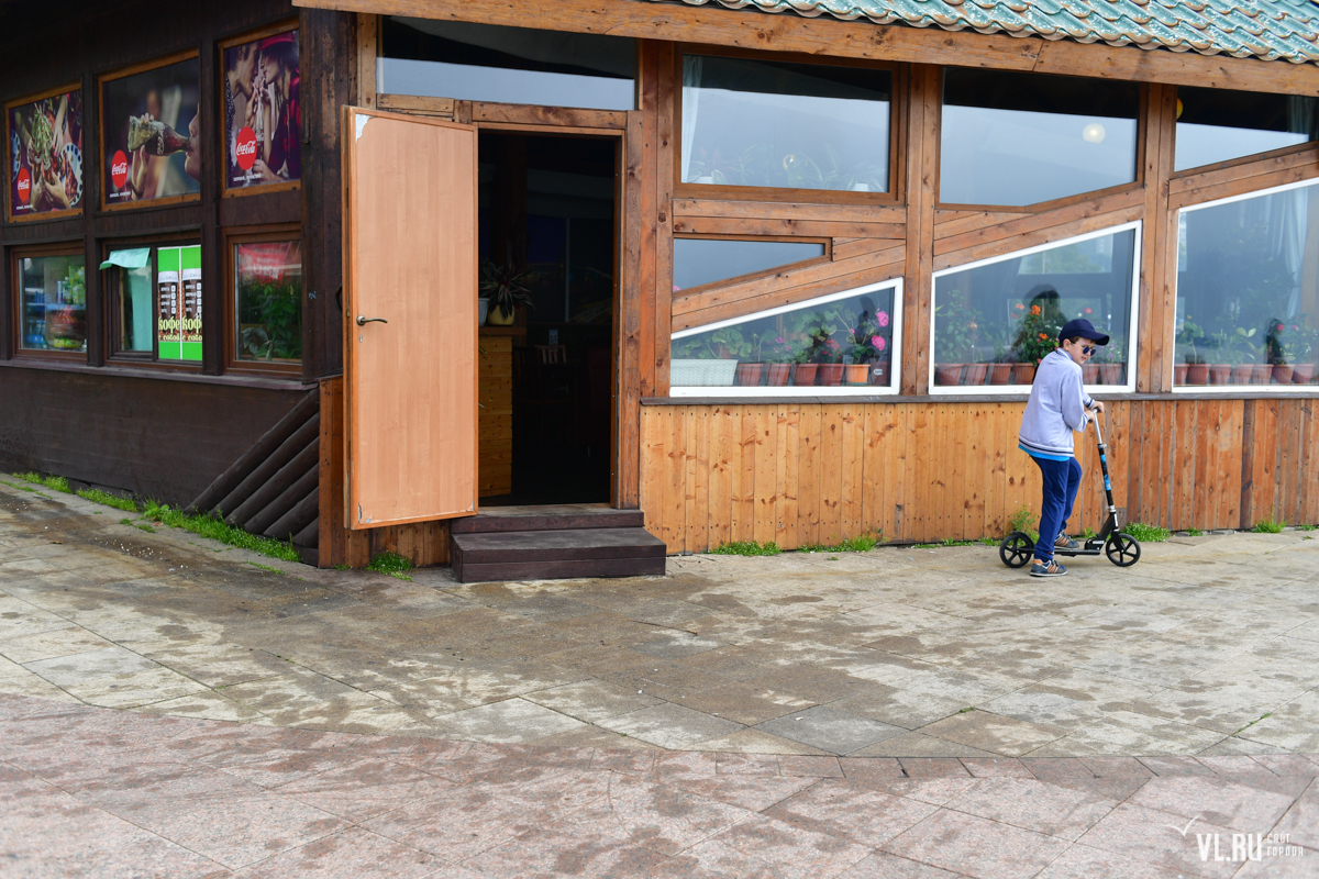 Вплоть до клуба «Семь футов» смотреть на этом участке особо нечего: с правой стороны бетонный забор, с левой – заросшая травой территория около гостиницы «Амурский залив». При этом попасть туда непросто – тротуара нет, не предусмотрены к гостинице и пешеходные переходы. Так что идем вдоль дороги дальше.