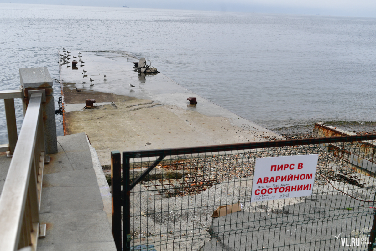 Напротив старого океанариума (Батарейная, 4) – квинтэссенция благоустройства. Жителей и гостей Владивостока здесь встречает лавочка без сиденья. Отметим, что в таком состоянии она находится уже как минимум несколько месяцев. Неподалеку – проход на последний, третий пирс. Все как полагается – железная решетка и надпись «Сами виноваты» («Пирс в аварийном состоянии»). Причальное сооружение действительно нуждается в ремонте – оно, в отличие от остальных, полузатопленное. Людей сюда ходит не много. Видимо, именно из-за этого пирс облюбовали чайки.