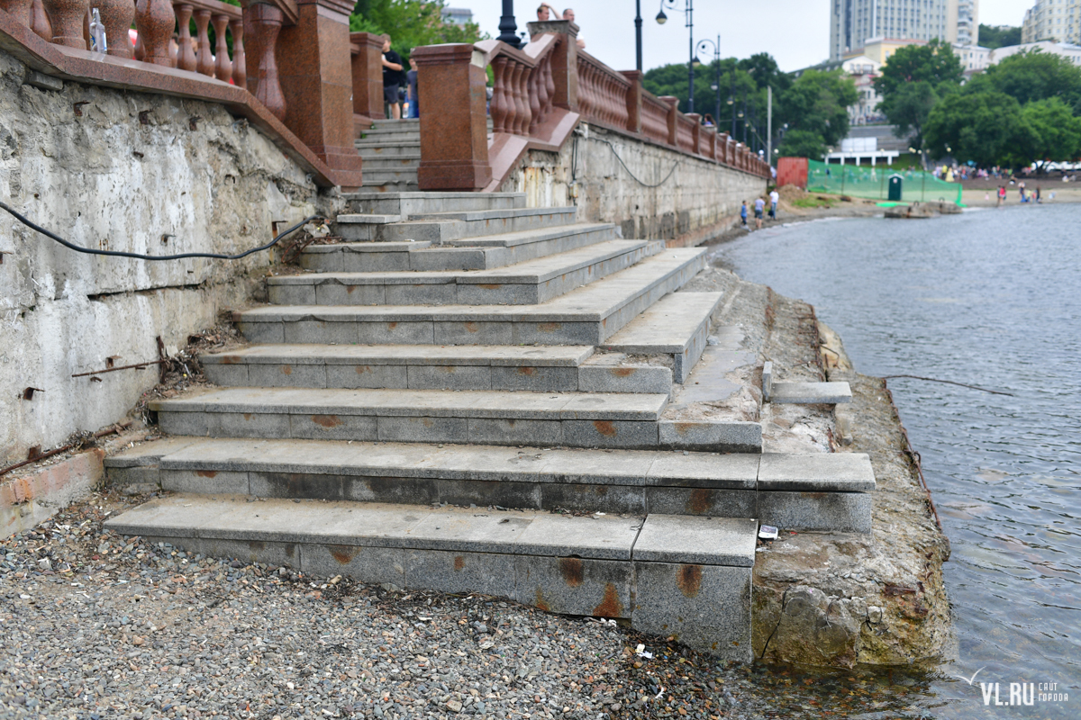Но это все аварийно-восстановительный ремонт и восстановление стены. Капитальная реконструкция общественного пространства пока только в планах. А она бы не помешала. Например, лестница, ведущая к побережью, почти полностью раскрошилась − волнами бетон вымыло до арматуры, которая проржавела и небезопасно торчит из того, что когда-то было ступеньками. Картину «удачно» дополняет то, что 13 или 14 июля неизвестные еще и разрушили значительную часть декоративного мраморного ограждения – перила и балясины.