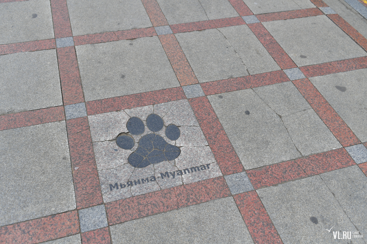 На подходе к большому фонтану обратите внимание на аллею «След тигра», торжественно открытую в 2015 году. «Мьянма» еще держится, а вот отпечаток «Камбоджи» практически полностью уничтожен. В этом месте также заметны огромные трещины и неровности в граните – возможно, что в один из многочисленных тайфунов здесь размыло фундамент. А может, и следы чересчур усердной уборки льда ковшами тракторов...